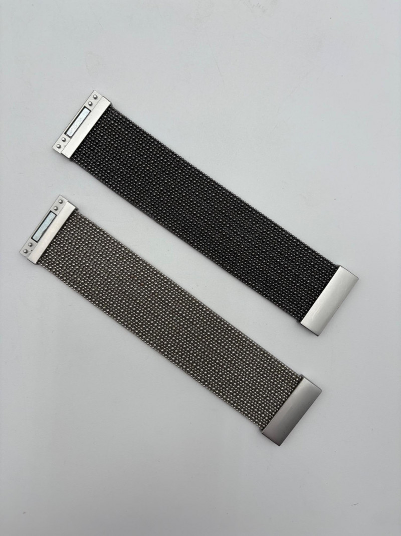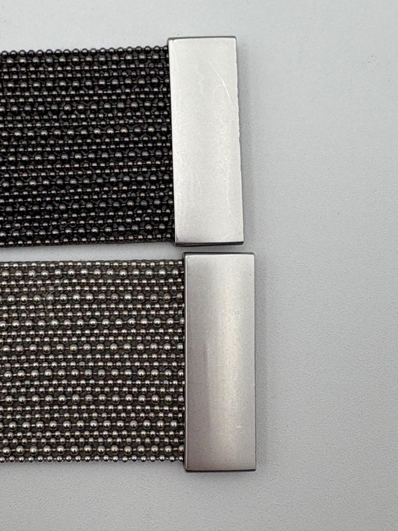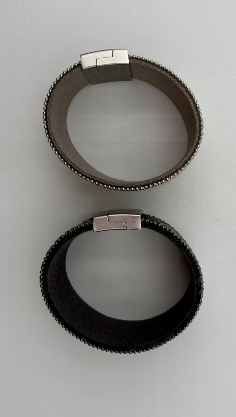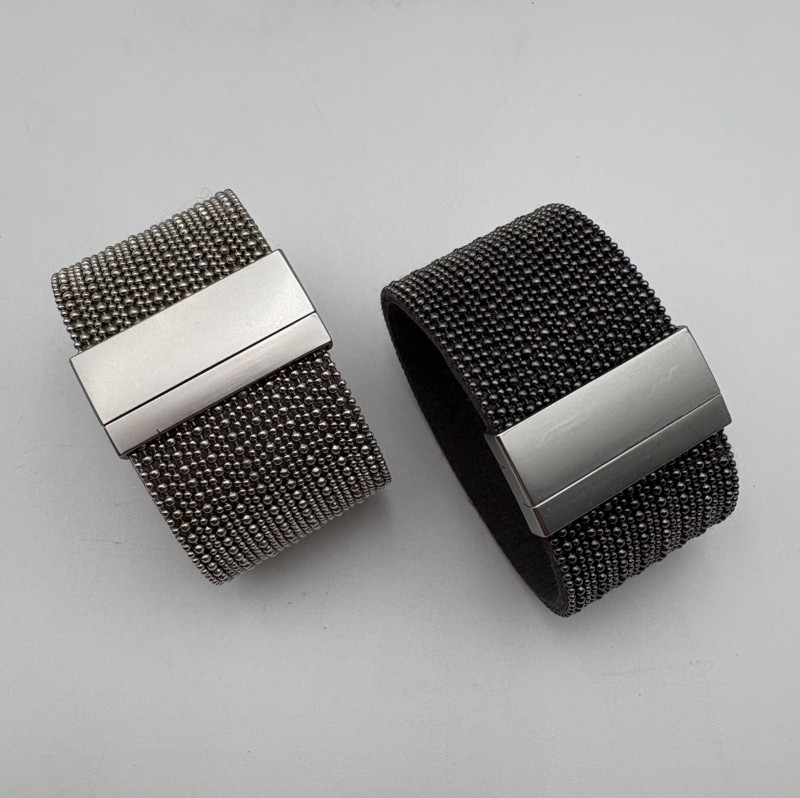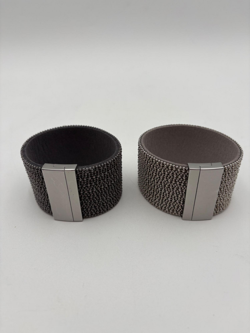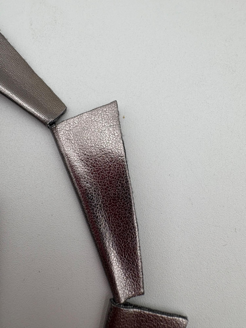 Terrific trio for all your lagenlook needs. Necklace is folded geometric shapes in iridescent silvery leather around a cord. Clamshell clasp closure - measures 22" total length. Manufacturer unknown. Pair of metallic cuffs in grey & black with smooth fabric backing against the wrist. Magnetic closure. Measure just under 7.5" in circumference when closed. Manufacturer unknown.