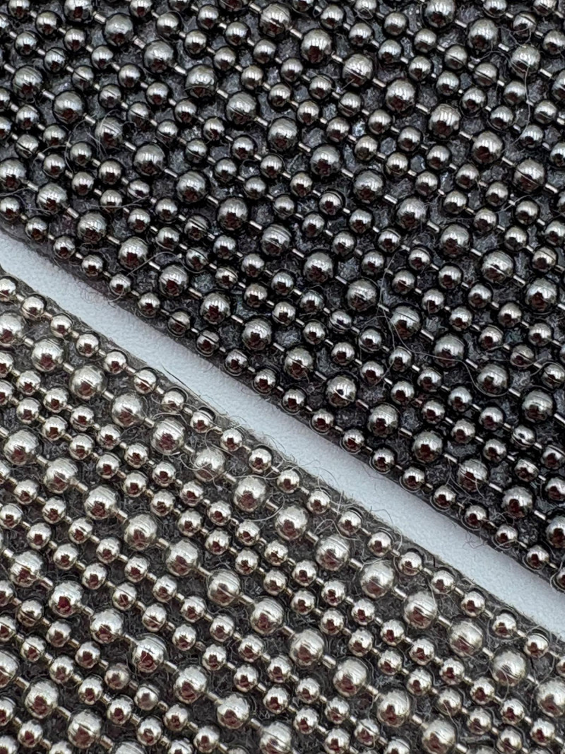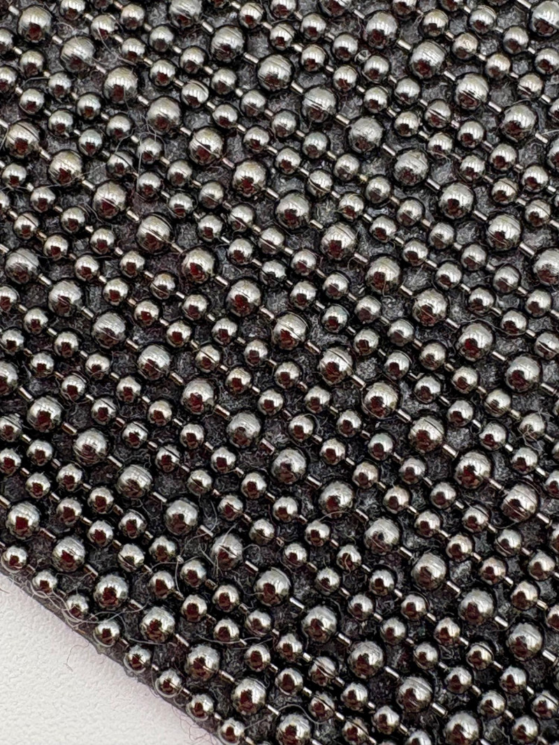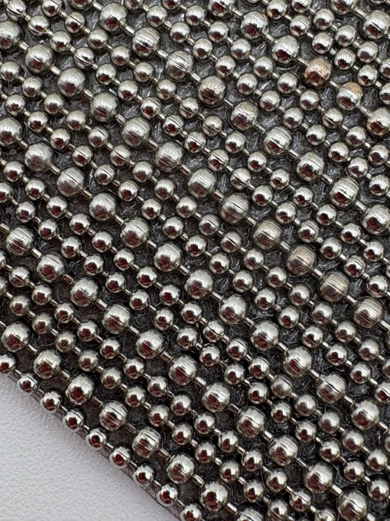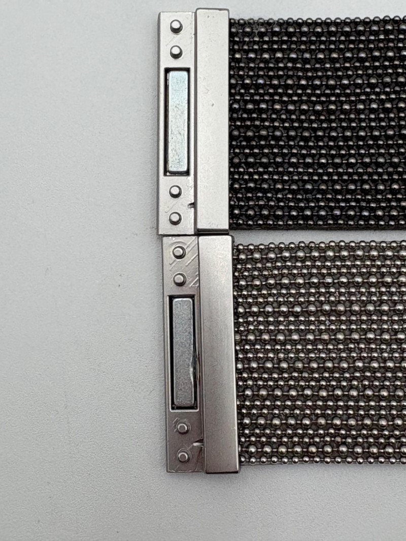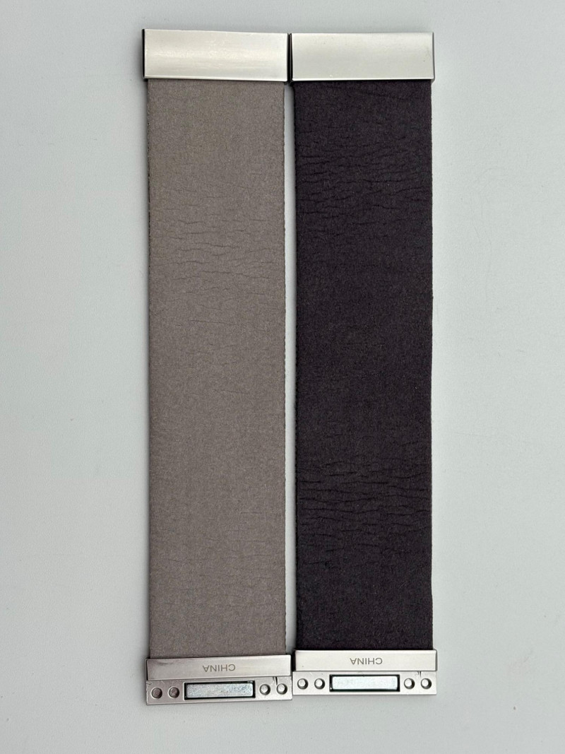 Terrific trio for all your lagenlook needs. Necklace is folded geometric shapes in iridescent silvery leather around a cord. Clamshell clasp closure - measures 22" total length. Manufacturer unknown. Pair of metallic cuffs in grey & black with smooth fabric backing against the wrist. Magnetic closure. Measure just under 7.5" in circumference when closed. Manufacturer unknown.