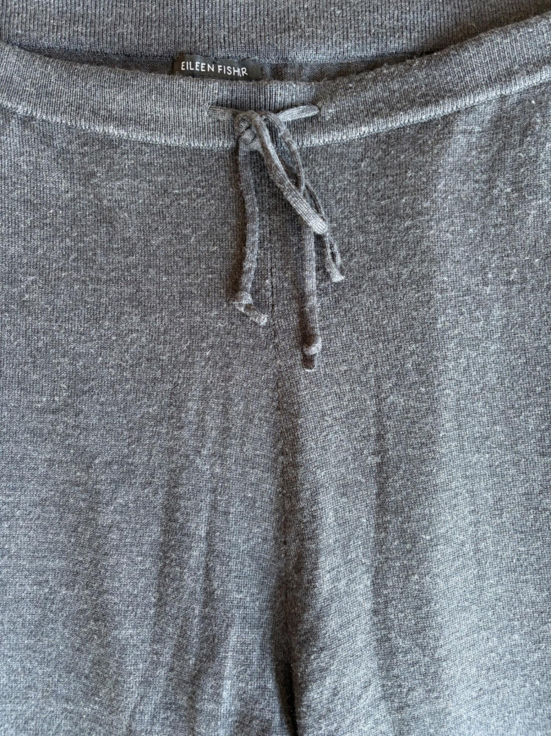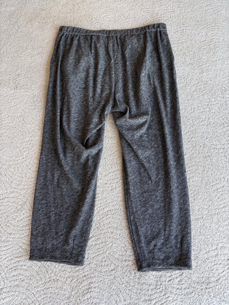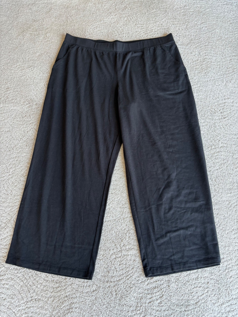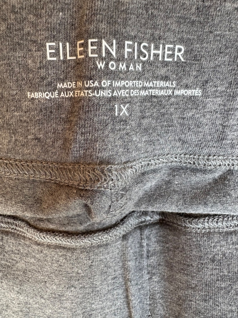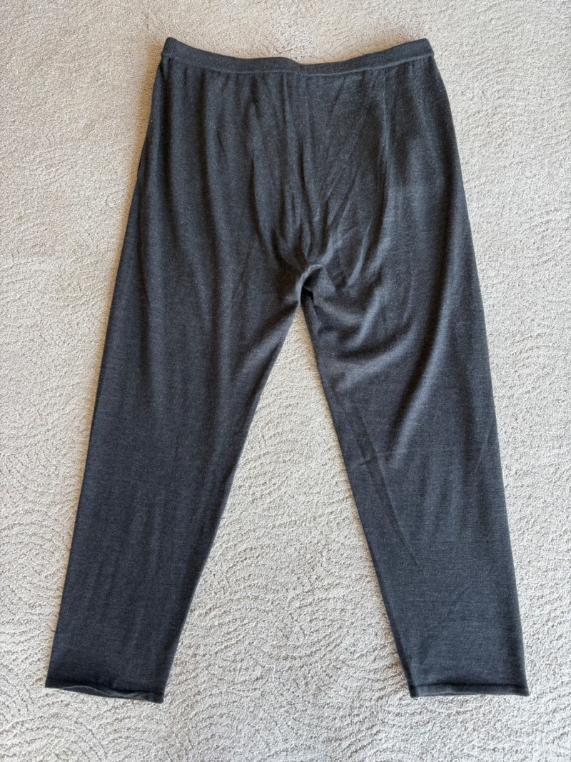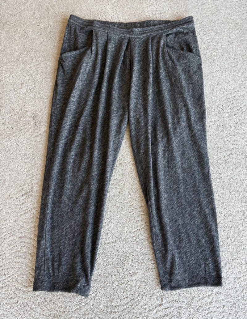 4 pairs of comfortable knit pants from Eileen Fisher and D&Co that can be dressed up or down. All measure 20" side to side at waist. Grey sweater pants from Eileen Fisher have ribbed elasticated flat waistband with drawstring, in-seam side pockets. and straight legs. 100% merino fine wool. Size tag says XL. Note some slight pilling on the hip line area - would take about 10 minutes with a sweater shaver to look new again. Grey mottled pants from Eileen Fisher have fitted front waistband, elasticated back waistband, set-in front pockets, front pleating, and darted leg hems to form a fuller leg to the hem. Cotton/wool/nylon blend. Size tag says XL. Light grey smooth knit pants from Eileen Fisher have wide flat elasticated waistband, back darts, wide legs, and are cropped. Organic cotton/spandex blend. Size tag says 1X. Black smooth pants from D&Co have wide flat elastic waist band, set-in front pockets and straight legs. Cotton/rayon/spandex blend. Size tag says XLP.