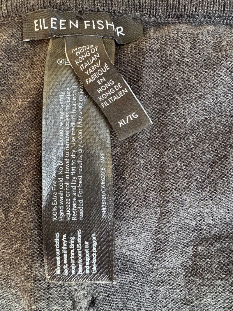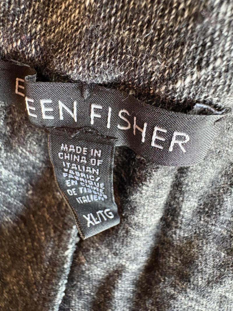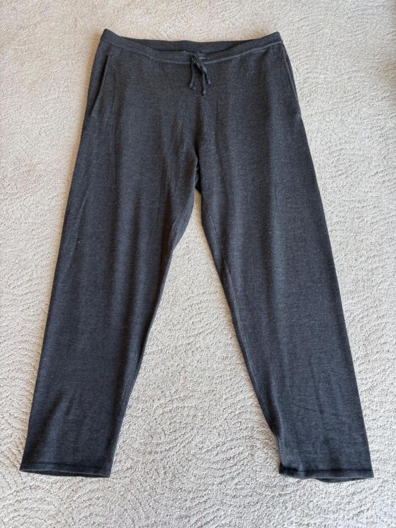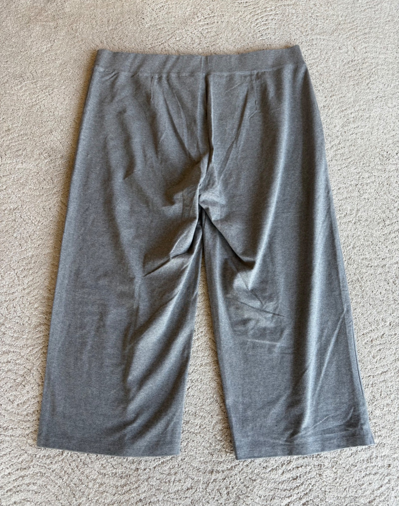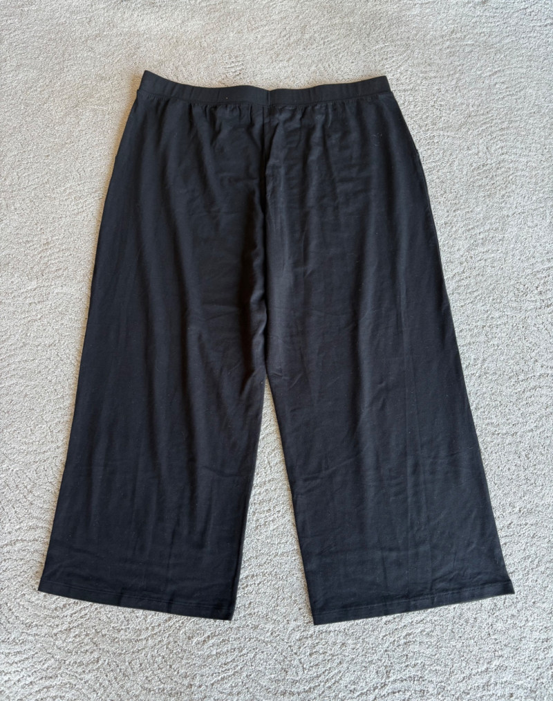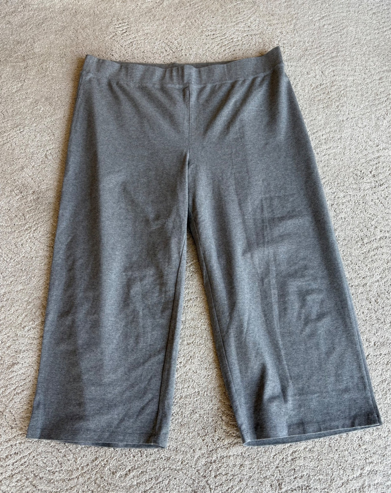 4 pairs of comfortable knit pants from Eileen Fisher and D&Co that can be dressed up or down. All measure 20" side to side at waist. Grey sweater pants from Eileen Fisher have ribbed elasticated flat waistband with drawstring, in-seam side pockets. and straight legs. 100% merino fine wool. Size tag says XL. Note some slight pilling on the hip line area - would take about 10 minutes with a sweater shaver to look new again. Grey mottled pants from Eileen Fisher have fitted front waistband, elasticated back waistband, set-in front pockets, front pleating, and darted leg hems to form a fuller leg to the hem. Cotton/wool/nylon blend. Size tag says XL. Light grey smooth knit pants from Eileen Fisher have wide flat elasticated waistband, back darts, wide legs, and are cropped. Organic cotton/spandex blend. Size tag says 1X. Black smooth pants from D&Co have wide flat elastic waist band, set-in front pockets and straight legs. Cotton/rayon/spandex blend. Size tag says XLP.