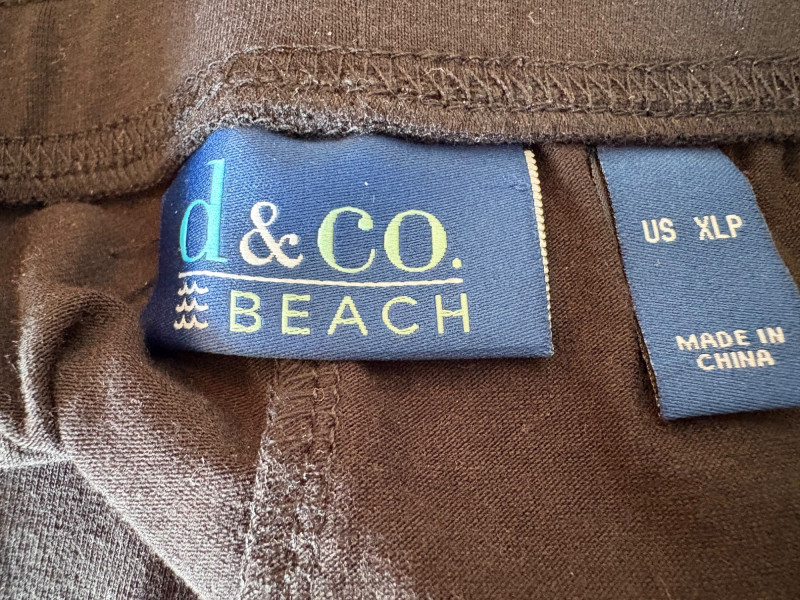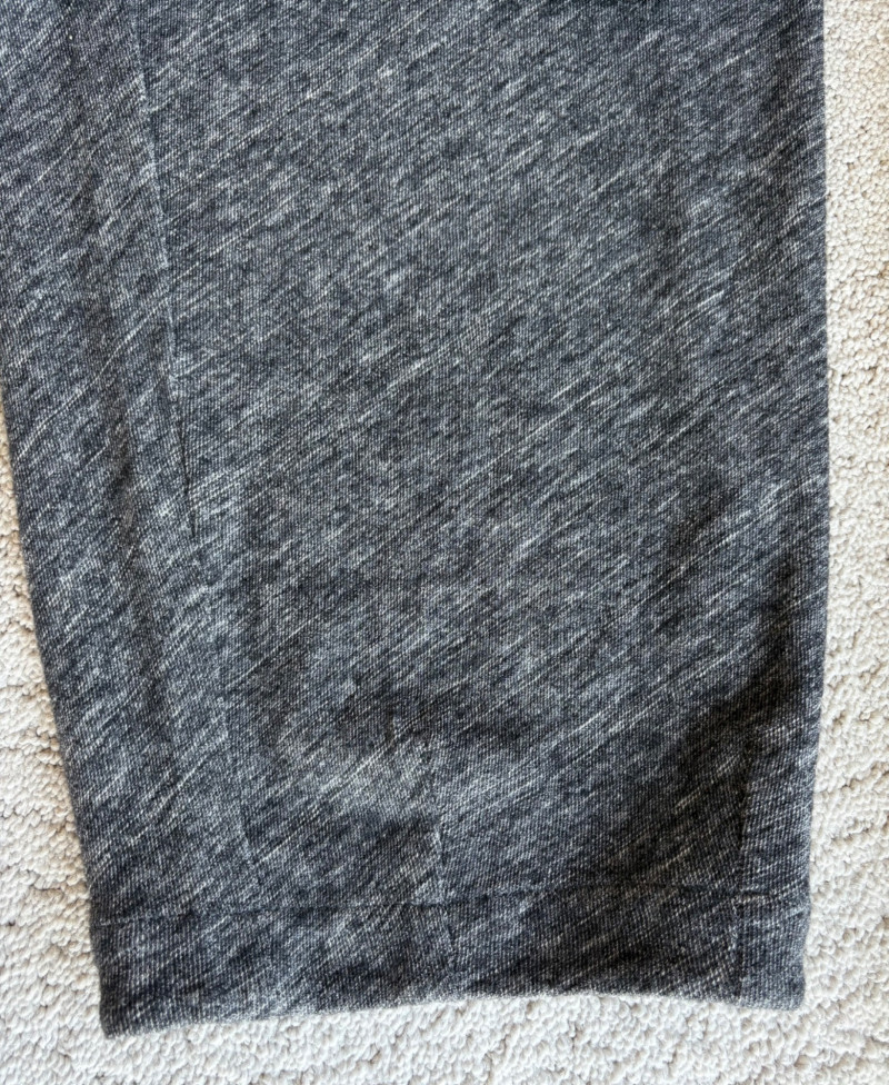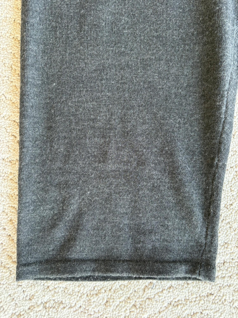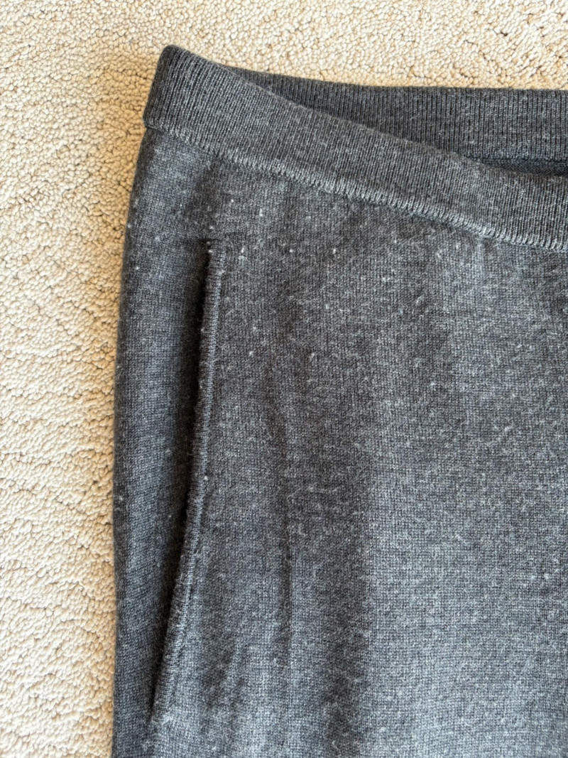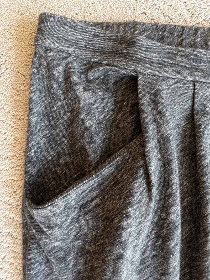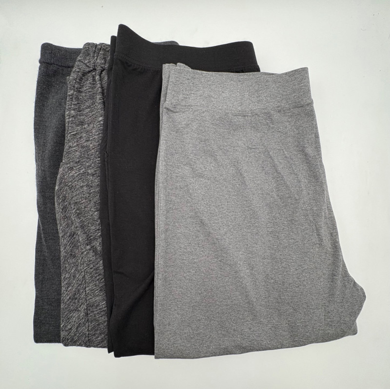 4 pairs of comfortable knit pants from Eileen Fisher and D&Co that can be dressed up or down. All measure 20" side to side at waist. Grey sweater pants from Eileen Fisher have ribbed elasticated flat waistband with drawstring, in-seam side pockets. and straight legs. 100% merino fine wool. Size tag says XL. Note some slight pilling on the hip line area - would take about 10 minutes with a sweater shaver to look new again. Grey mottled pants from Eileen Fisher have fitted front waistband, elasticated back waistband, set-in front pockets, front pleating, and darted leg hems to form a fuller leg to the hem. Cotton/wool/nylon blend. Size tag says XL. Light grey smooth knit pants from Eileen Fisher have wide flat elasticated waistband, back darts, wide legs, and are cropped. Organic cotton/spandex blend. Size tag says 1X. Black smooth pants from D&Co have wide flat elastic waist band, set-in front pockets and straight legs. Cotton/rayon/spandex blend. Size tag says XLP.