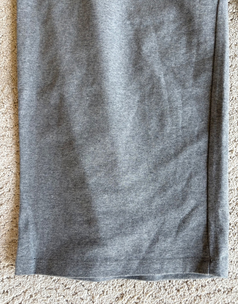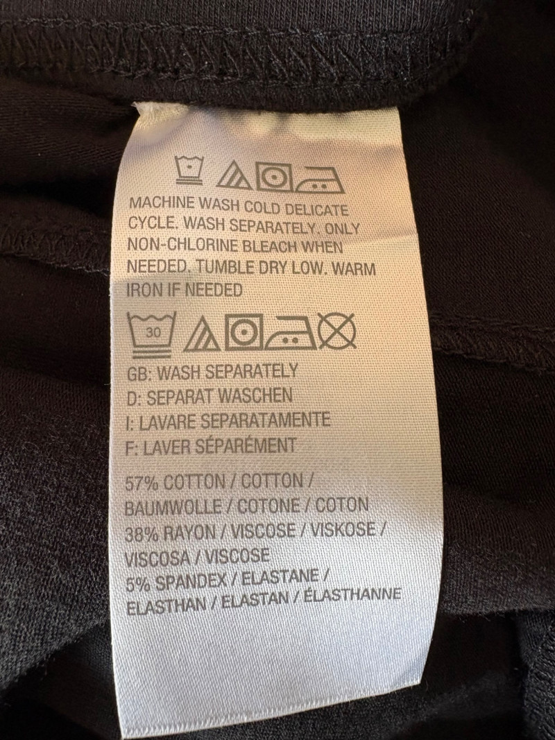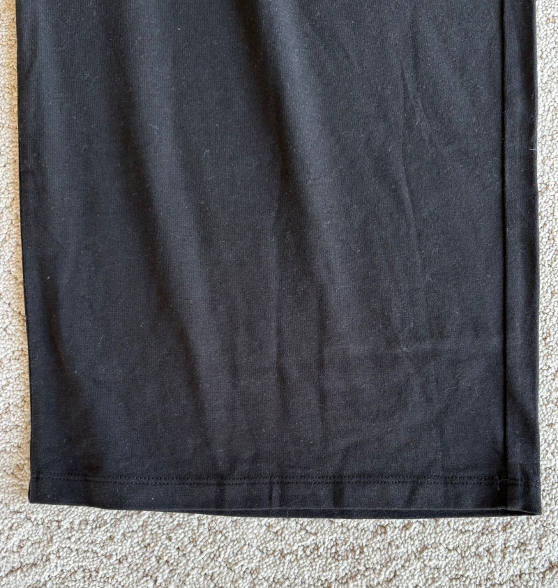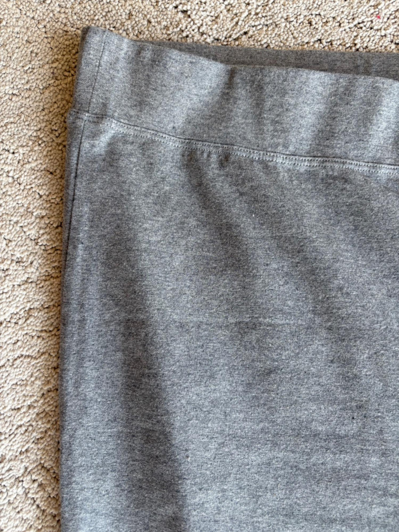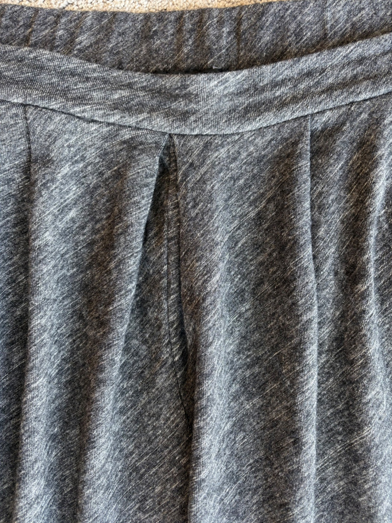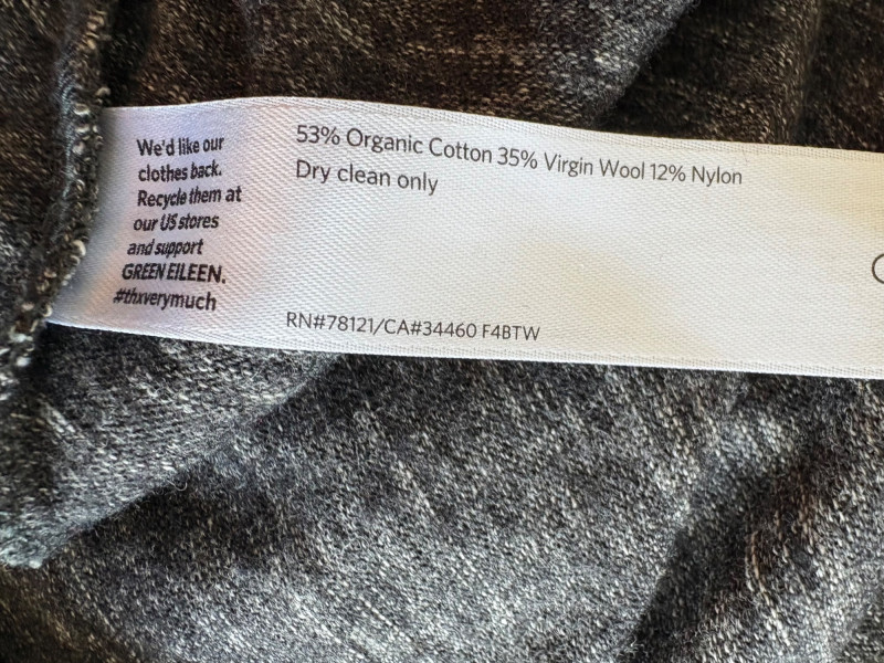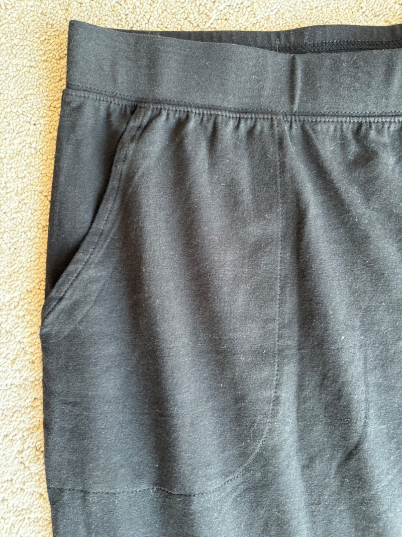4 pairs of comfortable knit pants from Eileen Fisher and D&Co that can be dressed up or down. All measure 20" side to side at waist. Grey sweater pants from Eileen Fisher have ribbed elasticated flat waistband with drawstring, in-seam side pockets. and straight legs. 100% merino fine wool. Size tag says XL. Note some slight pilling on the hip line area - would take about 10 minutes with a sweater shaver to look new again. Grey mottled pants from Eileen Fisher have fitted front waistband, elasticated back waistband, set-in front pockets, front pleating, and darted leg hems to form a fuller leg to the hem. Cotton/wool/nylon blend. Size tag says XL. Light grey smooth knit pants from Eileen Fisher have wide flat elasticated waistband, back darts, wide legs, and are cropped. Organic cotton/spandex blend. Size tag says 1X. Black smooth pants from D&Co have wide flat elastic waist band, set-in front pockets and straight legs. Cotton/rayon/spandex blend. Size tag says XLP.