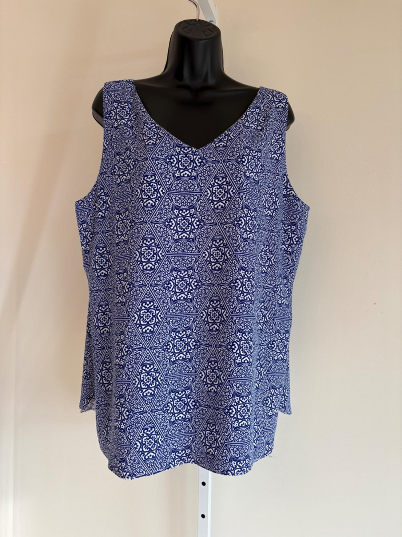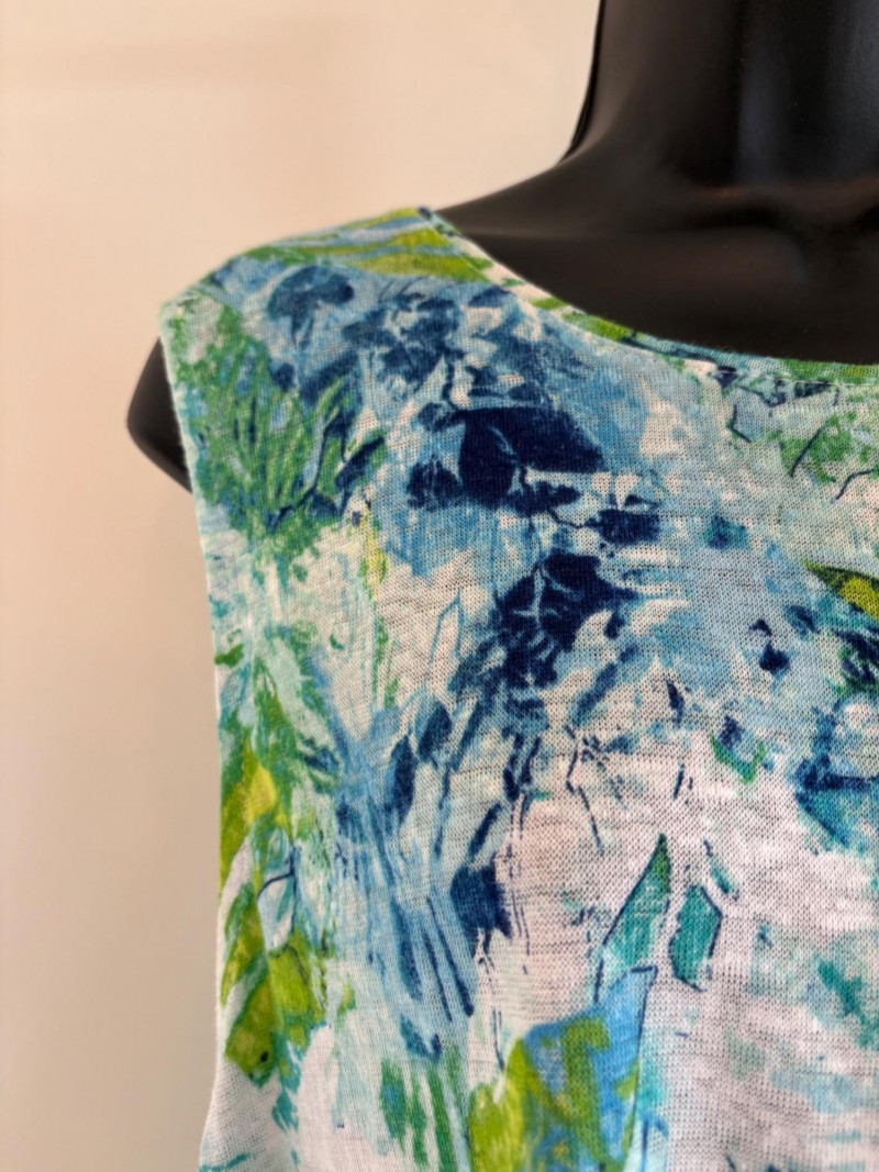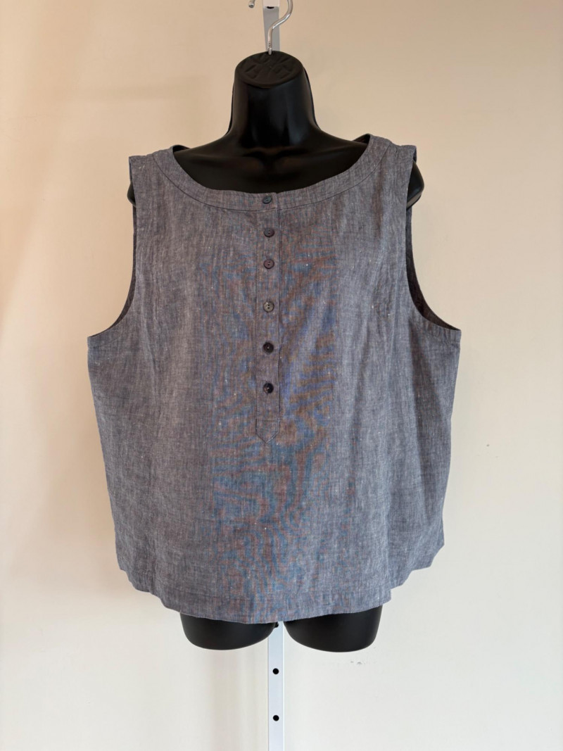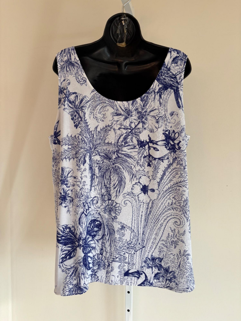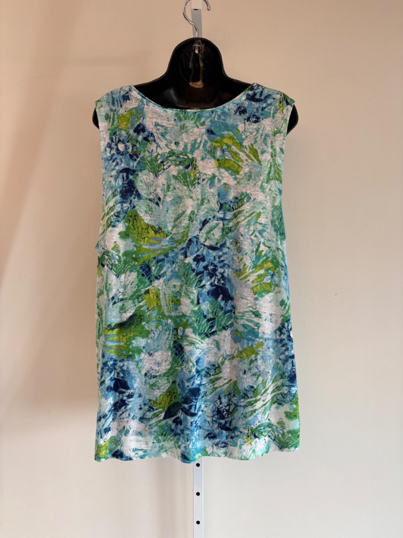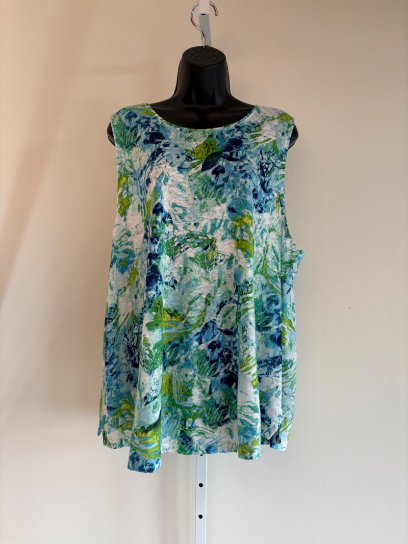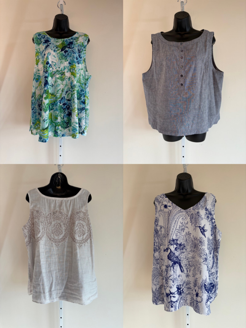 4 sleeveless tops that can be dressed up or down depending upon what you pair with them. All measure 23" pit to pit. Green, blue, and white knit floral top from J. Jill has split hem. 100% linen. Size tag says XL. Solid medium blue top from Eileen Fisher has partial button front with 6 buttons on placket, banded neckline, modified princess seaming, and back yoke. Linen/cotton blend.. Size tag says XL. Blue & white top is fully reversible. White background side has birds and tropical foliage while other side has blue & white intricate design. Top has V-neck AND a low curved neck and curved split hem with thread safeties to allow the fabric to fall evenly no matter which side is on display. We believe this is custom made as it is similar to another piece the client had in similar design. No maker tag or fabric tag, but it is smooth fabric with good flow/fall. Note that when photographing, we discovered about 1" of the side seam of the bird side has come loose - just needs to be stitched back in place. Would take 5 minutes stitching by hand. Pale taupe top with dark taupe embroidered eyelet from J. Jill has elasticated curved neckline.100% linen. Size tag says XL.