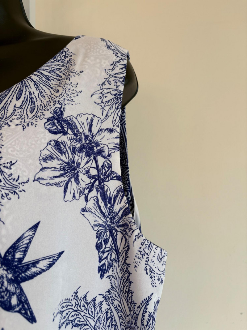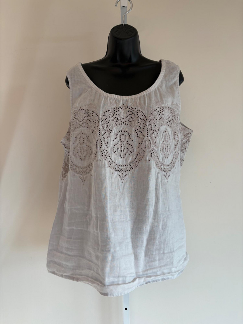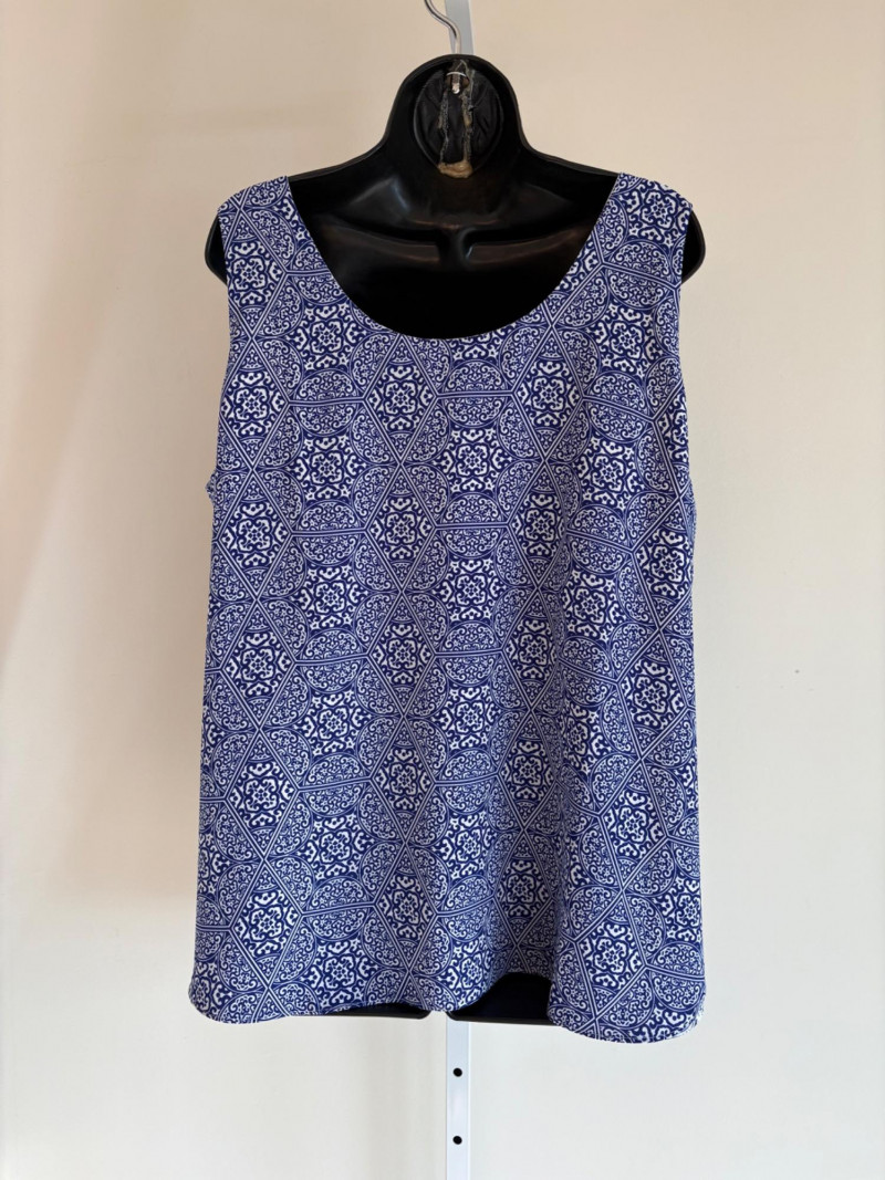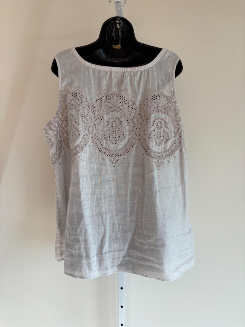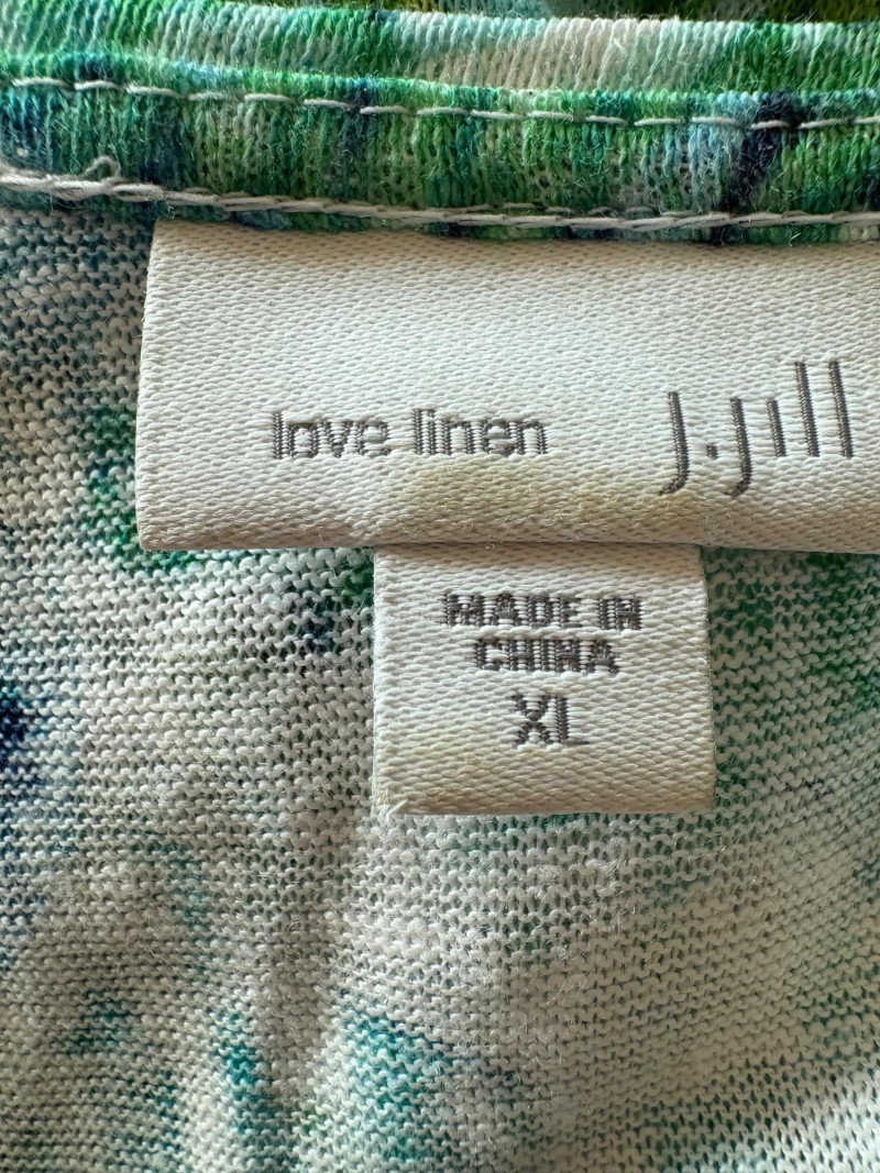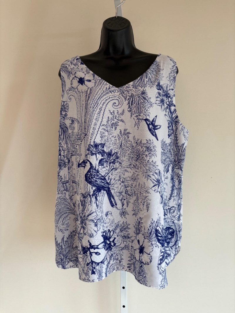 4 sleeveless tops that can be dressed up or down depending upon what you pair with them. All measure 23" pit to pit. Green, blue, and white knit floral top from J. Jill has split hem. 100% linen. Size tag says XL. Solid medium blue top from Eileen Fisher has partial button front with 6 buttons on placket, banded neckline, modified princess seaming, and back yoke. Linen/cotton blend.. Size tag says XL. Blue & white top is fully reversible. White background side has birds and tropical foliage while other side has blue & white intricate design. Top has V-neck AND a low curved neck and curved split hem with thread safeties to allow the fabric to fall evenly no matter which side is on display. We believe this is custom made as it is similar to another piece the client had in similar design. No maker tag or fabric tag, but it is smooth fabric with good flow/fall. Note that when photographing, we discovered about 1" of the side seam of the bird side has come loose - just needs to be stitched back in place. Would take 5 minutes stitching by hand. Pale taupe top with dark taupe embroidered eyelet from J. Jill has elasticated curved neckline.100% linen. Size tag says XL.
