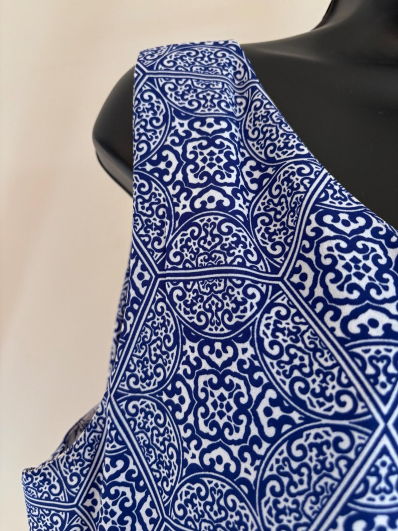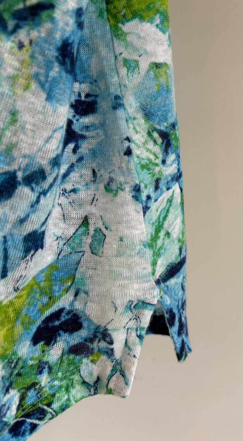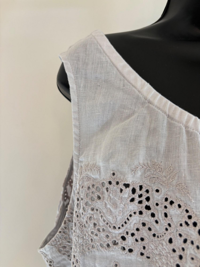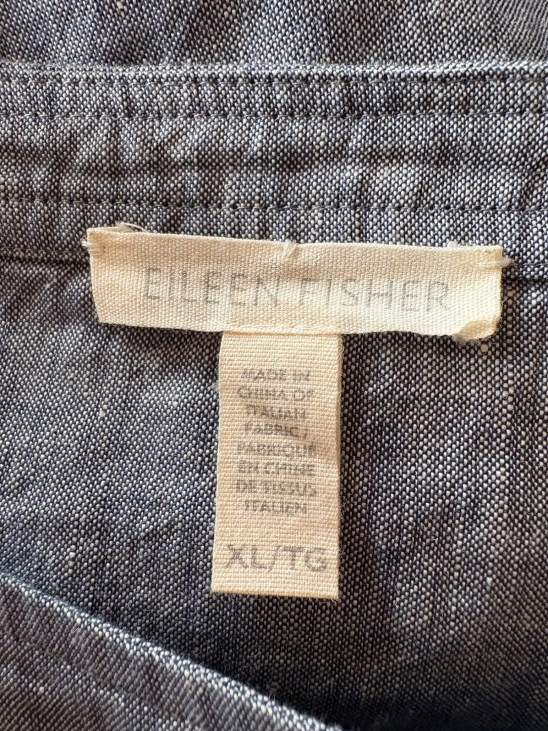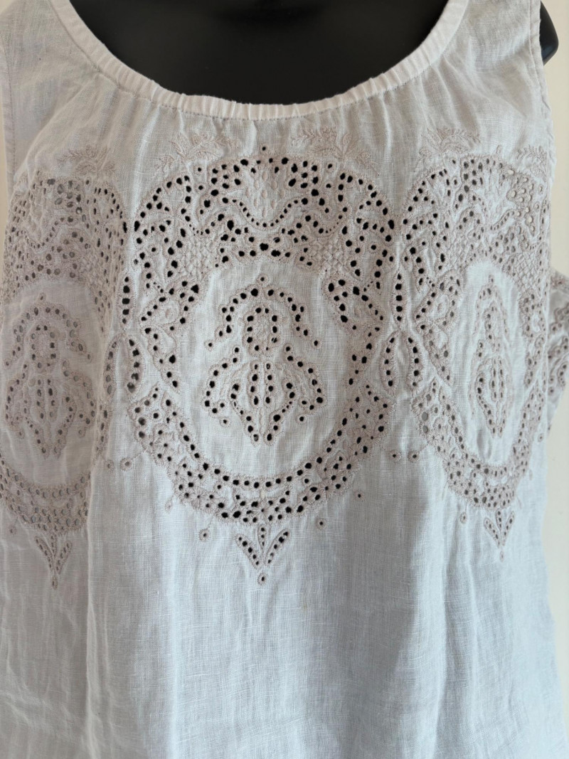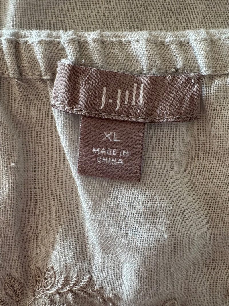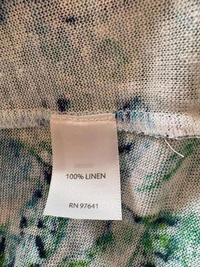 4 sleeveless tops that can be dressed up or down depending upon what you pair with them. All measure 23" pit to pit. Green, blue, and white knit floral top from J. Jill has split hem. 100% linen. Size tag says XL. Solid medium blue top from Eileen Fisher has partial button front with 6 buttons on placket, banded neckline, modified princess seaming, and back yoke. Linen/cotton blend.. Size tag says XL. Blue & white top is fully reversible. White background side has birds and tropical foliage while other side has blue & white intricate design. Top has V-neck AND a low curved neck and curved split hem with thread safeties to allow the fabric to fall evenly no matter which side is on display. We believe this is custom made as it is similar to another piece the client had in similar design. No maker tag or fabric tag, but it is smooth fabric with good flow/fall. Note that when photographing, we discovered about 1" of the side seam of the bird side has come loose - just needs to be stitched back in place. Would take 5 minutes stitching by hand. Pale taupe top with dark taupe embroidered eyelet from J. Jill has elasticated curved neckline.100% linen. Size tag says XL.