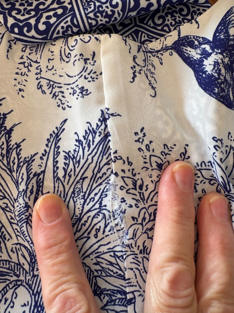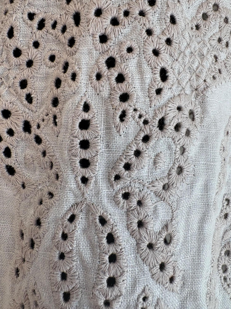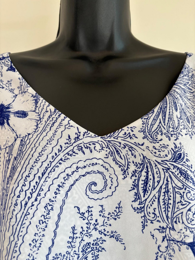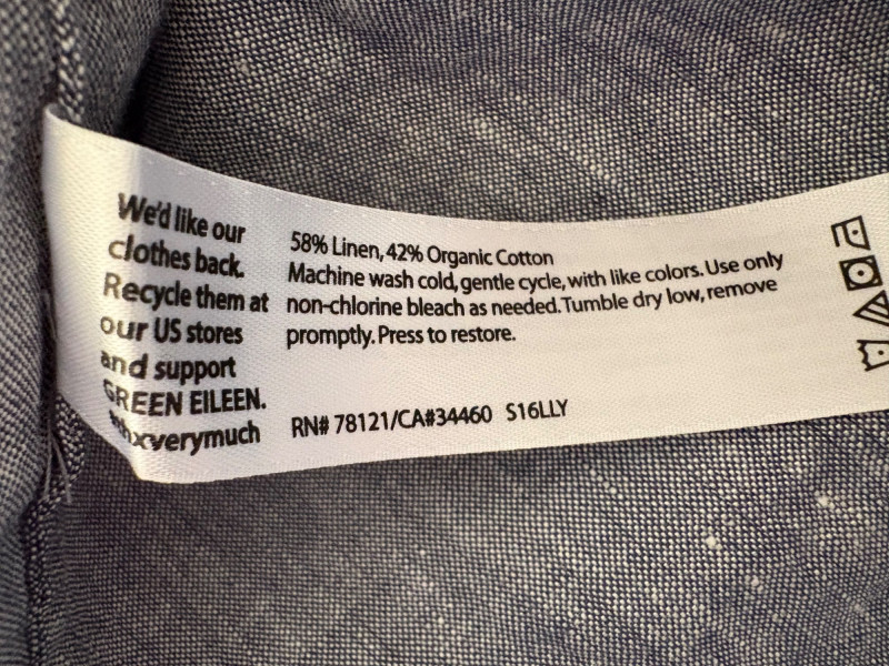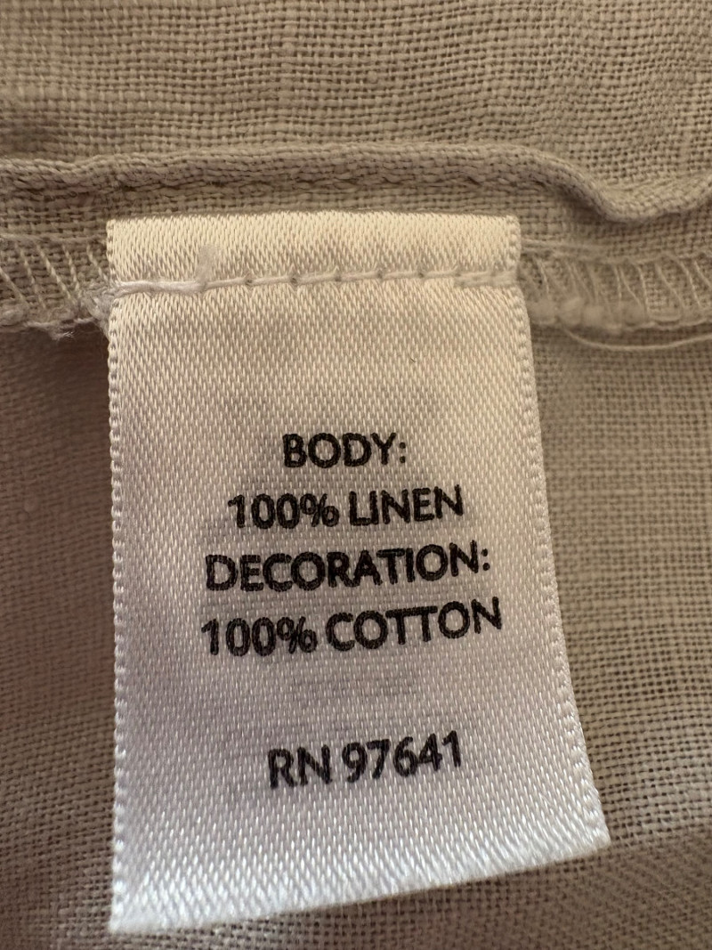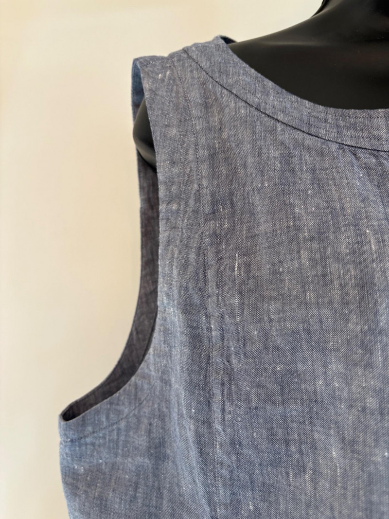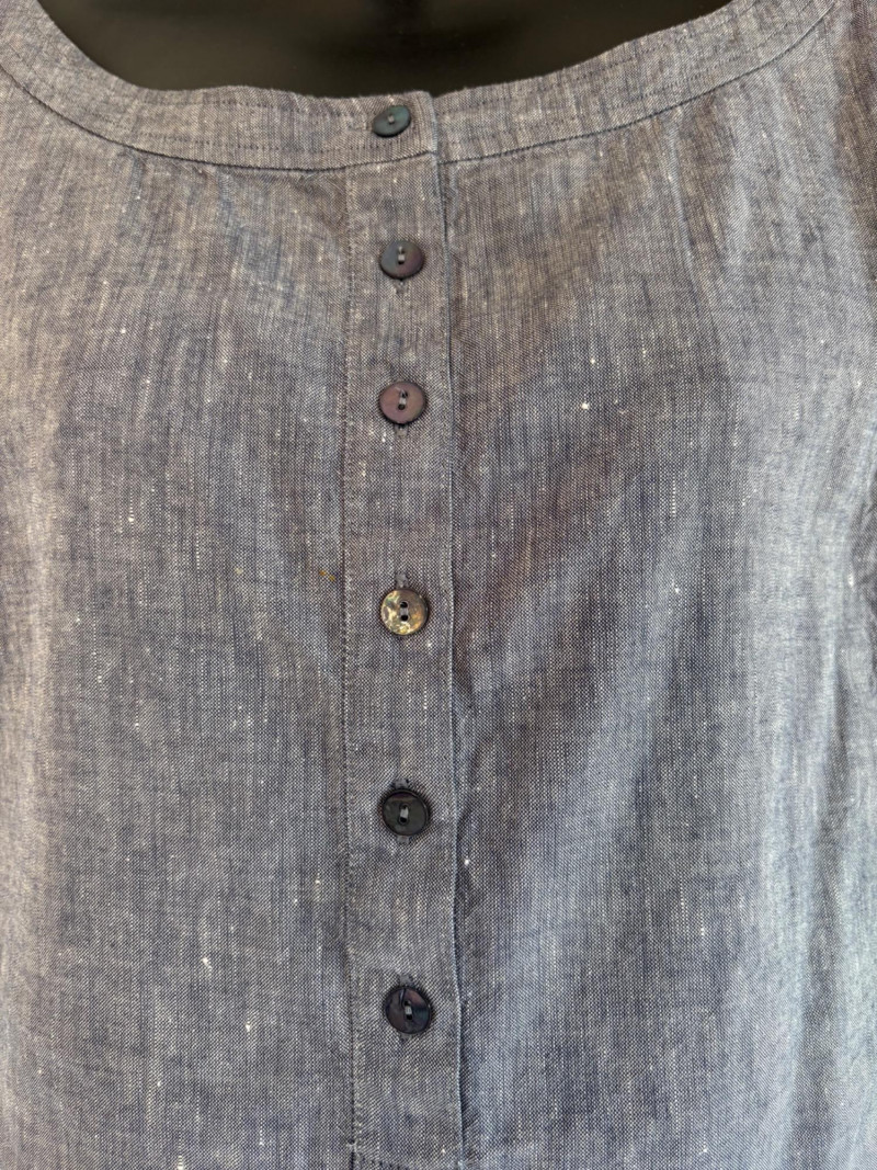 4 sleeveless tops that can be dressed up or down depending upon what you pair with them. All measure 23" pit to pit. Green, blue, and white knit floral top from J. Jill has split hem. 100% linen. Size tag says XL. Solid medium blue top from Eileen Fisher has partial button front with 6 buttons on placket, banded neckline, modified princess seaming, and back yoke. Linen/cotton blend.. Size tag says XL. Blue & white top is fully reversible. White background side has birds and tropical foliage while other side has blue & white intricate design. Top has V-neck AND a low curved neck and curved split hem with thread safeties to allow the fabric to fall evenly no matter which side is on display. We believe this is custom made as it is similar to another piece the client had in similar design. No maker tag or fabric tag, but it is smooth fabric with good flow/fall. Note that when photographing, we discovered about 1" of the side seam of the bird side has come loose - just needs to be stitched back in place. Would take 5 minutes stitching by hand. Pale taupe top with dark taupe embroidered eyelet from J. Jill has elasticated curved neckline.100% linen. Size tag says XL.