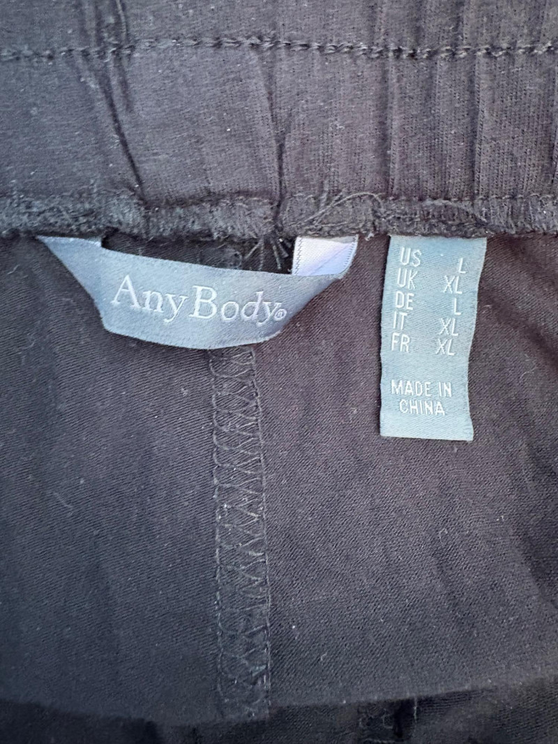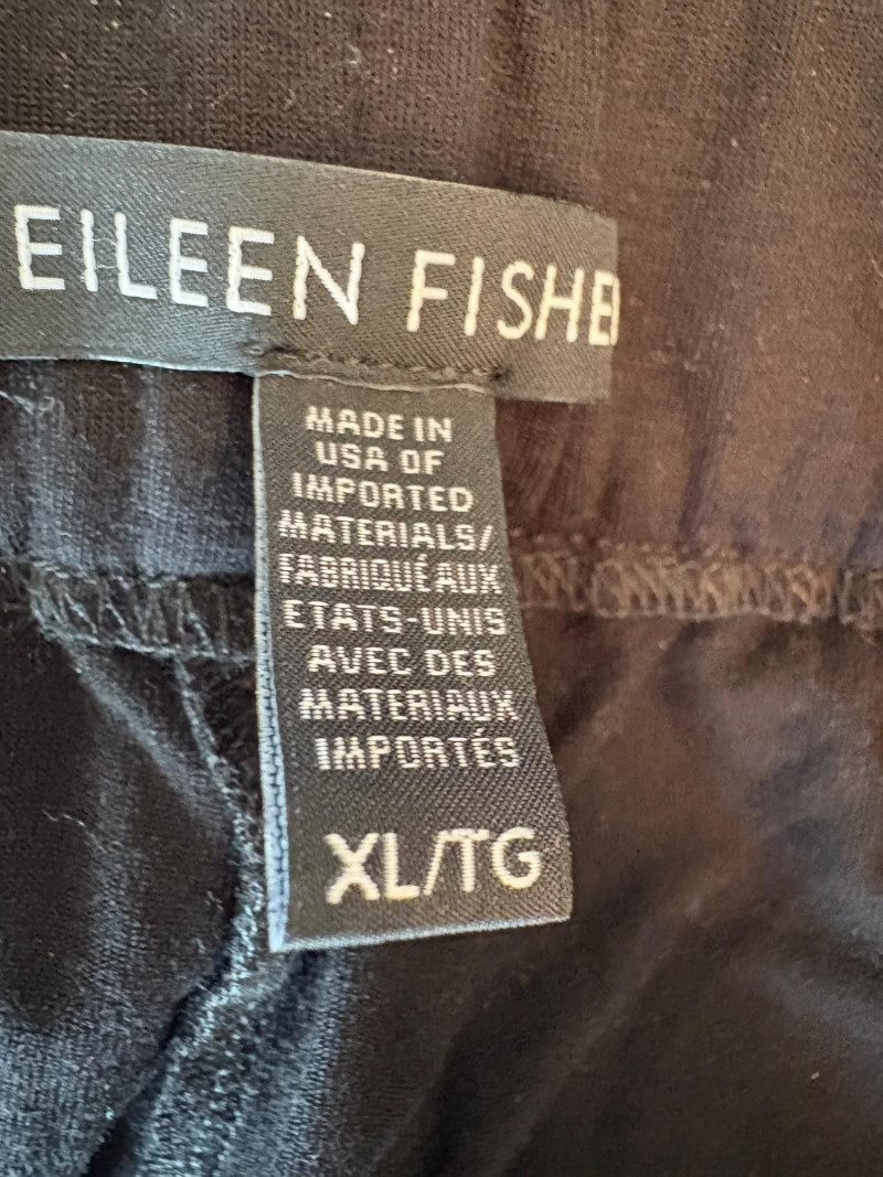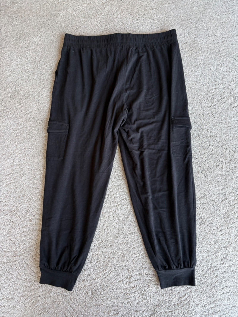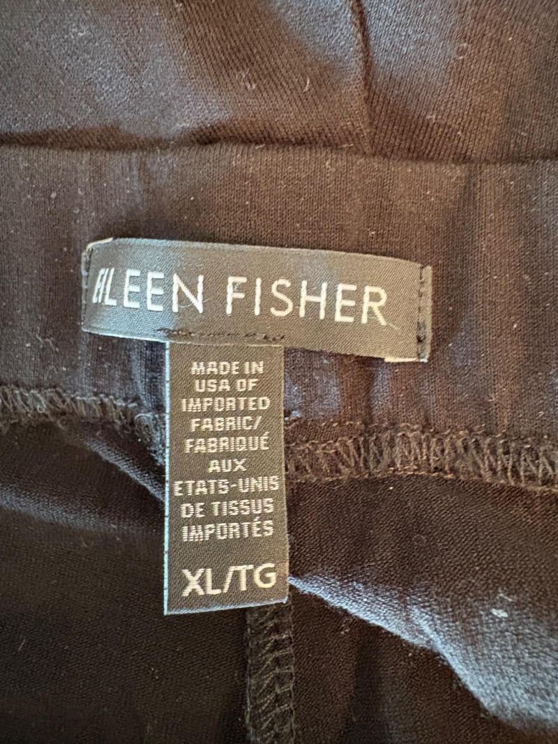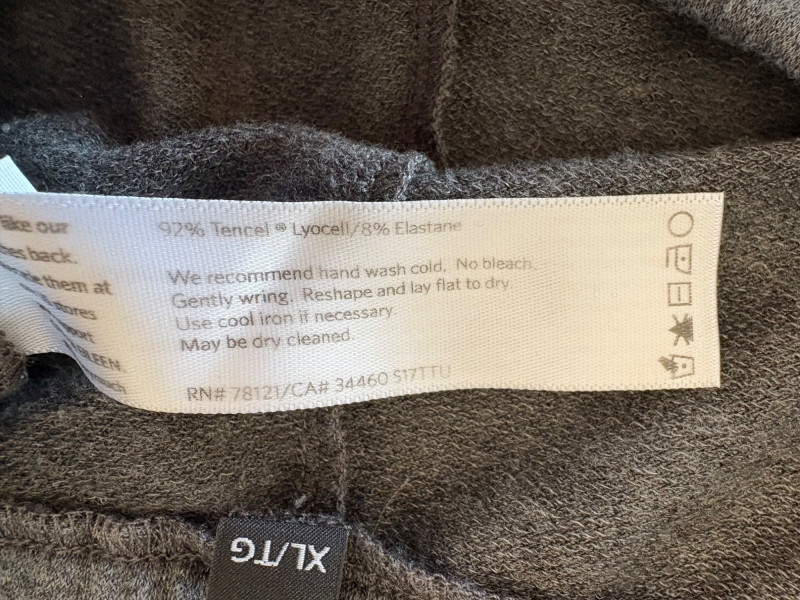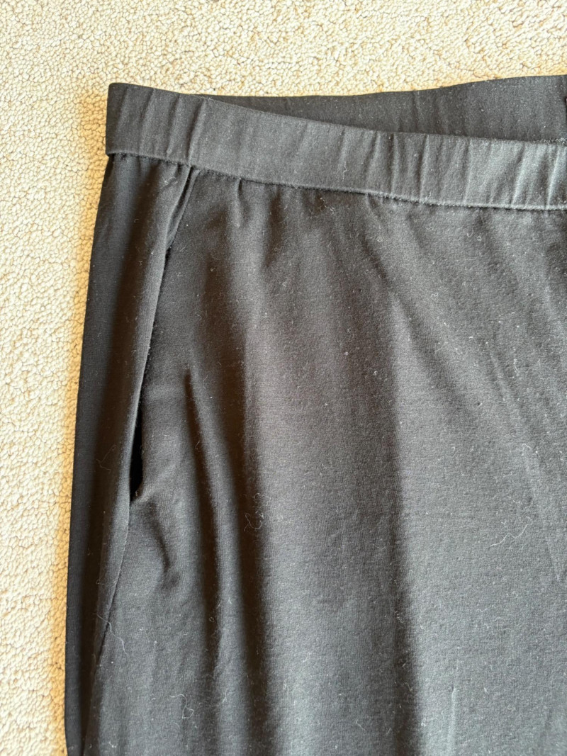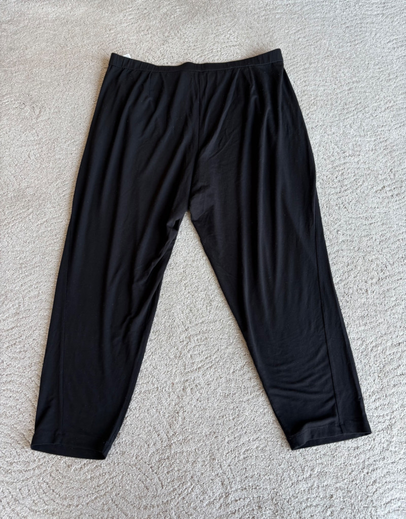 4 pairs of pants for hanging out at home and being comfortable. All are of soft knit and measure between 19" - 19.5" side to side at waist. While 3 of the 4 are black, all are different designs so you have variety in style and fit. Please note that because of the addition of viscose to these pants, there is a tendency to pill a bit - a speed date with your sweater shaver would make them great again, although they are fine as is for lounging around - see last photo for most egregious example. Black super smooth knit pants from Eileen Fisher have wide flat elasticated waistband, back darts, tapered legs, and set-in side pockets. Viscose/spandex blend. Size tag says XL. Black knit cargo pants from Any Body have thigh pockets, ribbed leg cuffs, elasticated waistband, and set-in front pockets. Cotton/modal/spandex blend. Size tag says L. Grey knit pants from Eileen Fisher have wide flat elasticated waistband, back darts, set-in side pockets, and ribbed cuffs. Tencel Lyocell/elastane blend. Size tag says XL. Black pants from Eileen Fisher have generous set-in pockets with pieced legs, ribbed cuffs, and wide elasticated waistband. Tencel Lyocell/spandex blend. Size tag says XL.