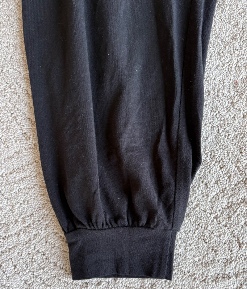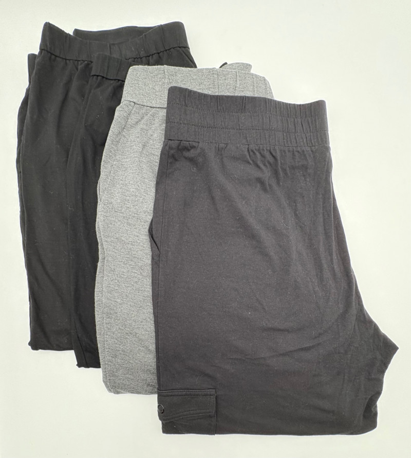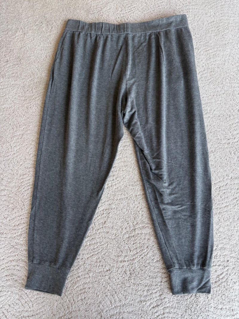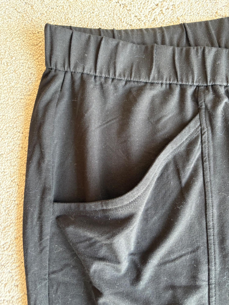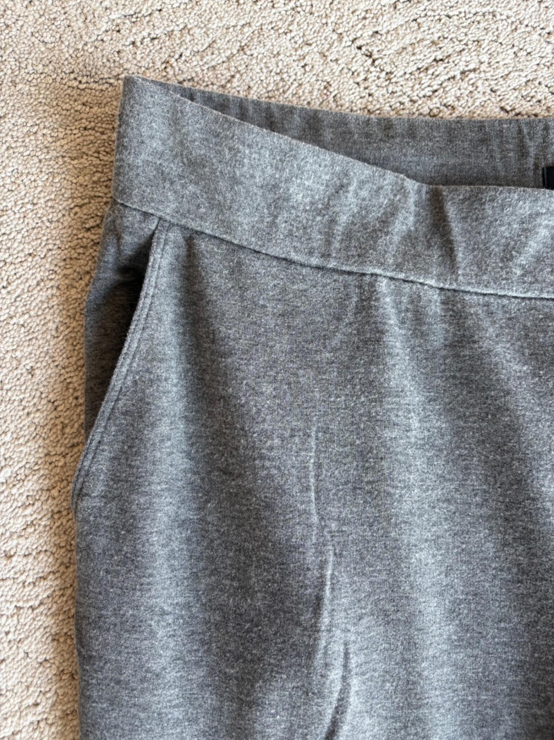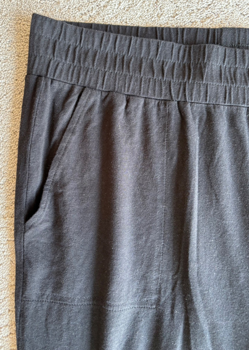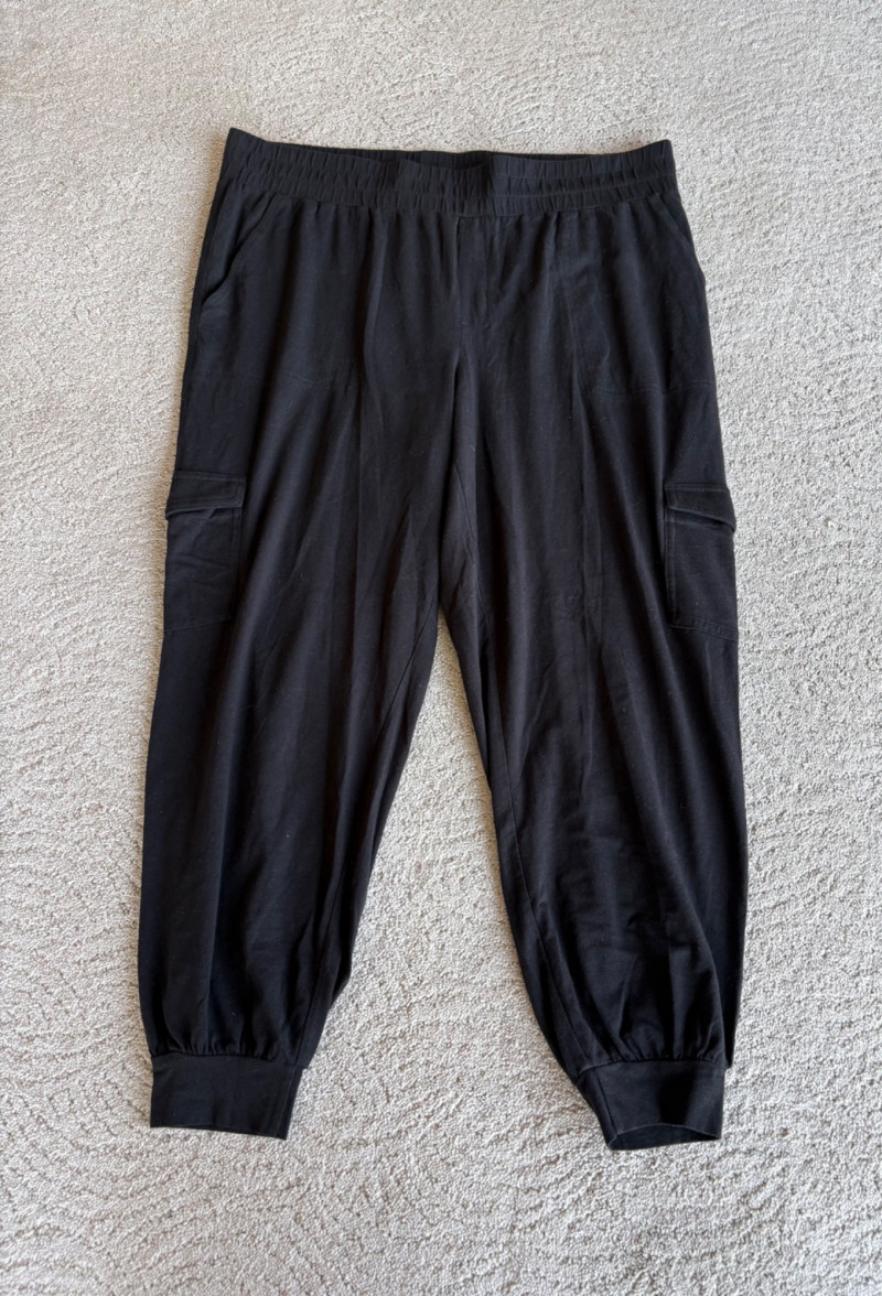 4 pairs of pants for hanging out at home and being comfortable. All are of soft knit and measure between 19" - 19.5" side to side at waist. While 3 of the 4 are black, all are different designs so you have variety in style and fit. Please note that because of the addition of viscose to these pants, there is a tendency to pill a bit - a speed date with your sweater shaver would make them great again, although they are fine as is for lounging around - see last photo for most egregious example. Black super smooth knit pants from Eileen Fisher have wide flat elasticated waistband, back darts, tapered legs, and set-in side pockets. Viscose/spandex blend. Size tag says XL. Black knit cargo pants from Any Body have thigh pockets, ribbed leg cuffs, elasticated waistband, and set-in front pockets. Cotton/modal/spandex blend. Size tag says L. Grey knit pants from Eileen Fisher have wide flat elasticated waistband, back darts, set-in side pockets, and ribbed cuffs. Tencel Lyocell/elastane blend. Size tag says XL. Black pants from Eileen Fisher have generous set-in pockets with pieced legs, ribbed cuffs, and wide elasticated waistband. Tencel Lyocell/spandex blend. Size tag says XL.