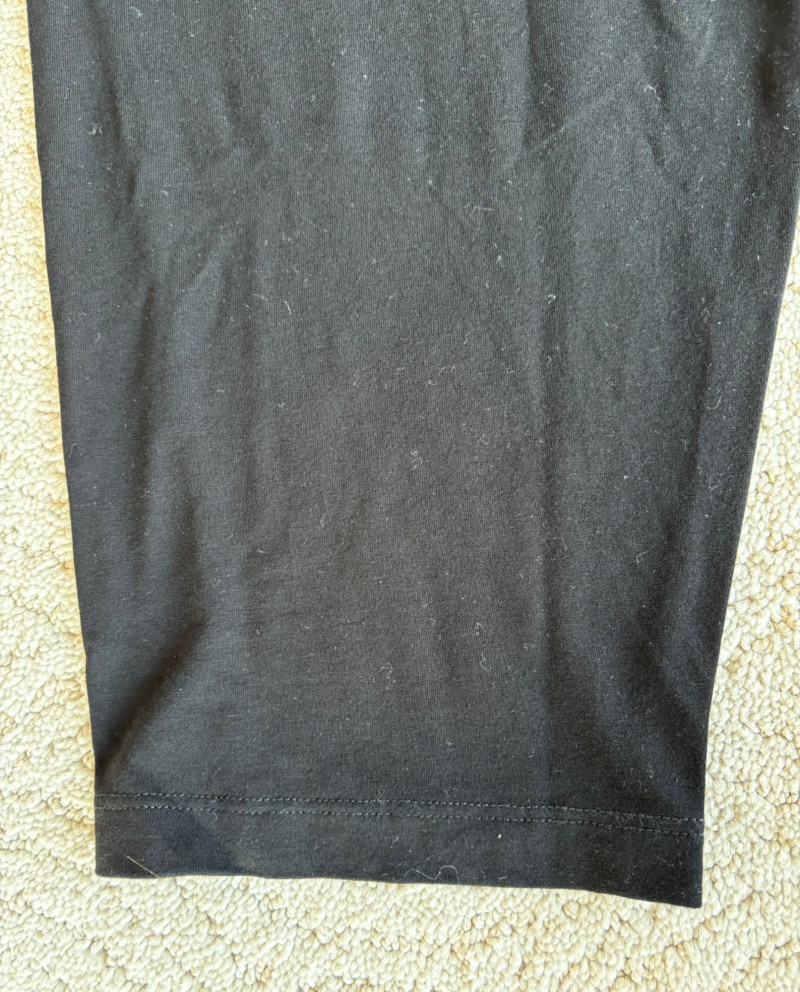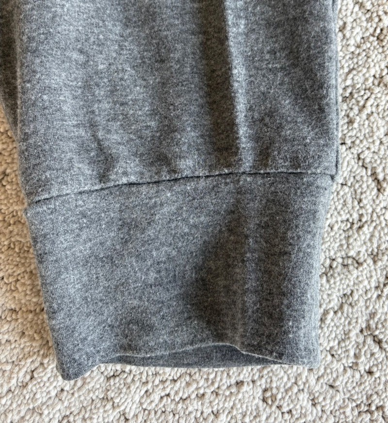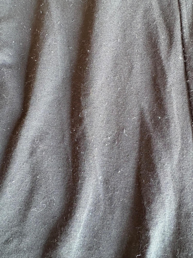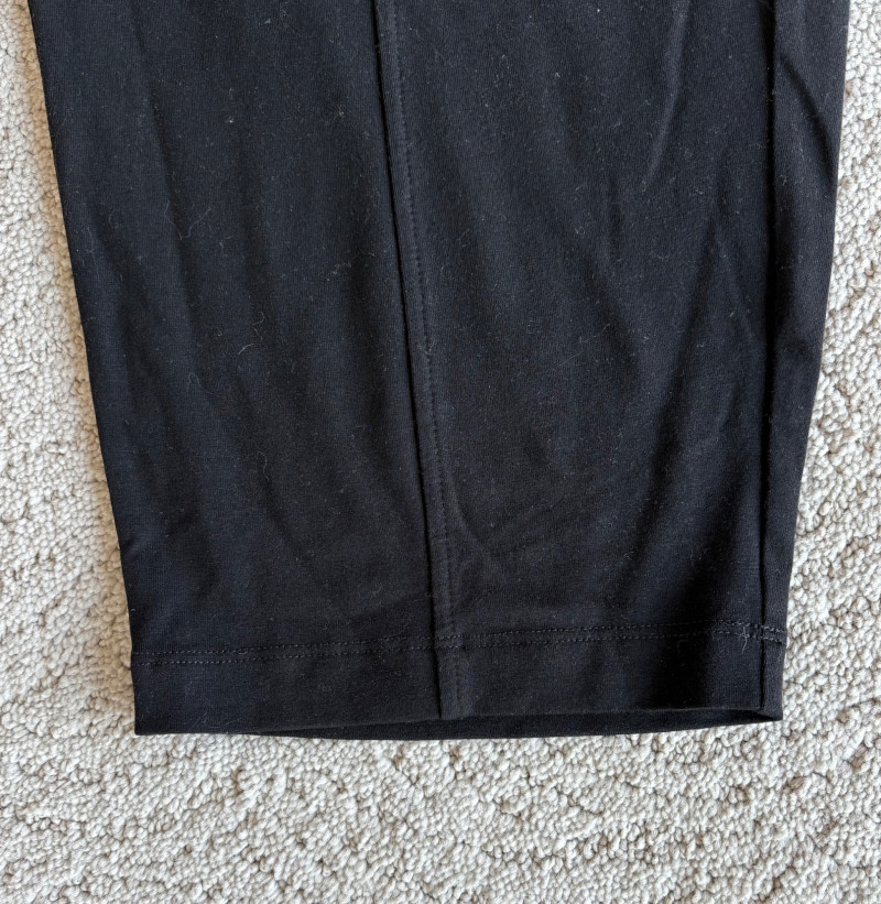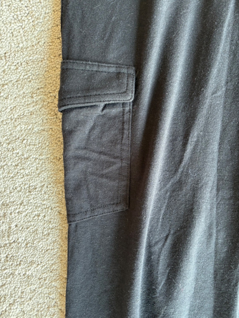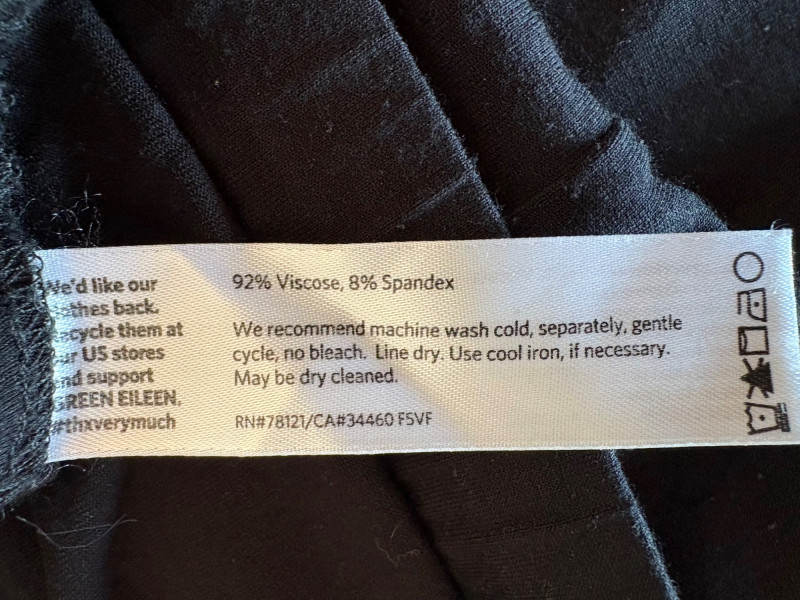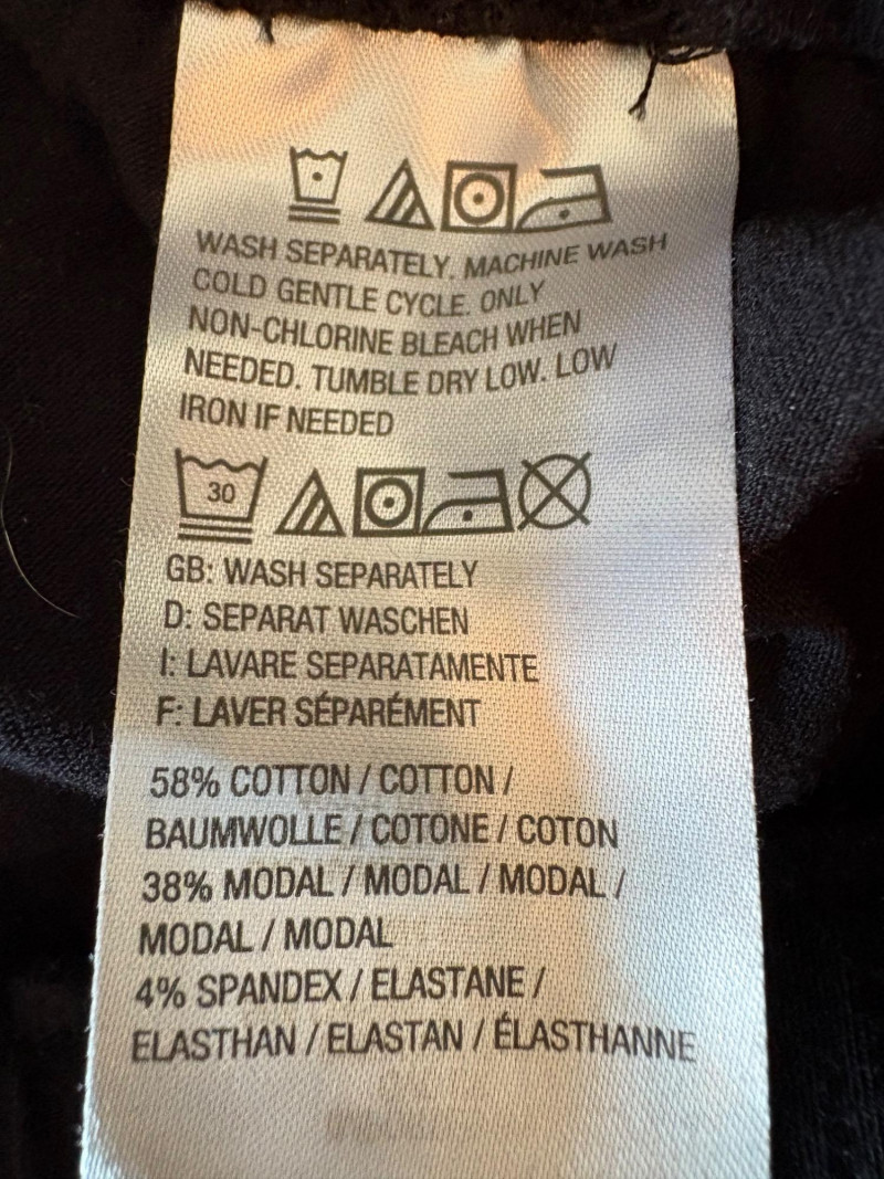 4 pairs of pants for hanging out at home and being comfortable. All are of soft knit and measure between 19" - 19.5" side to side at waist. While 3 of the 4 are black, all are different designs so you have variety in style and fit. Please note that because of the addition of viscose to these pants, there is a tendency to pill a bit - a speed date with your sweater shaver would make them great again, although they are fine as is for lounging around - see last photo for most egregious example. Black super smooth knit pants from Eileen Fisher have wide flat elasticated waistband, back darts, tapered legs, and set-in side pockets. Viscose/spandex blend. Size tag says XL. Black knit cargo pants from Any Body have thigh pockets, ribbed leg cuffs, elasticated waistband, and set-in front pockets. Cotton/modal/spandex blend. Size tag says L. Grey knit pants from Eileen Fisher have wide flat elasticated waistband, back darts, set-in side pockets, and ribbed cuffs. Tencel Lyocell/elastane blend. Size tag says XL. Black pants from Eileen Fisher have generous set-in pockets with pieced legs, ribbed cuffs, and wide elasticated waistband. Tencel Lyocell/spandex blend. Size tag says XL.