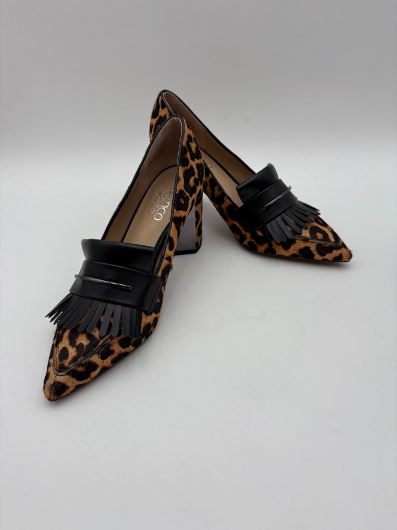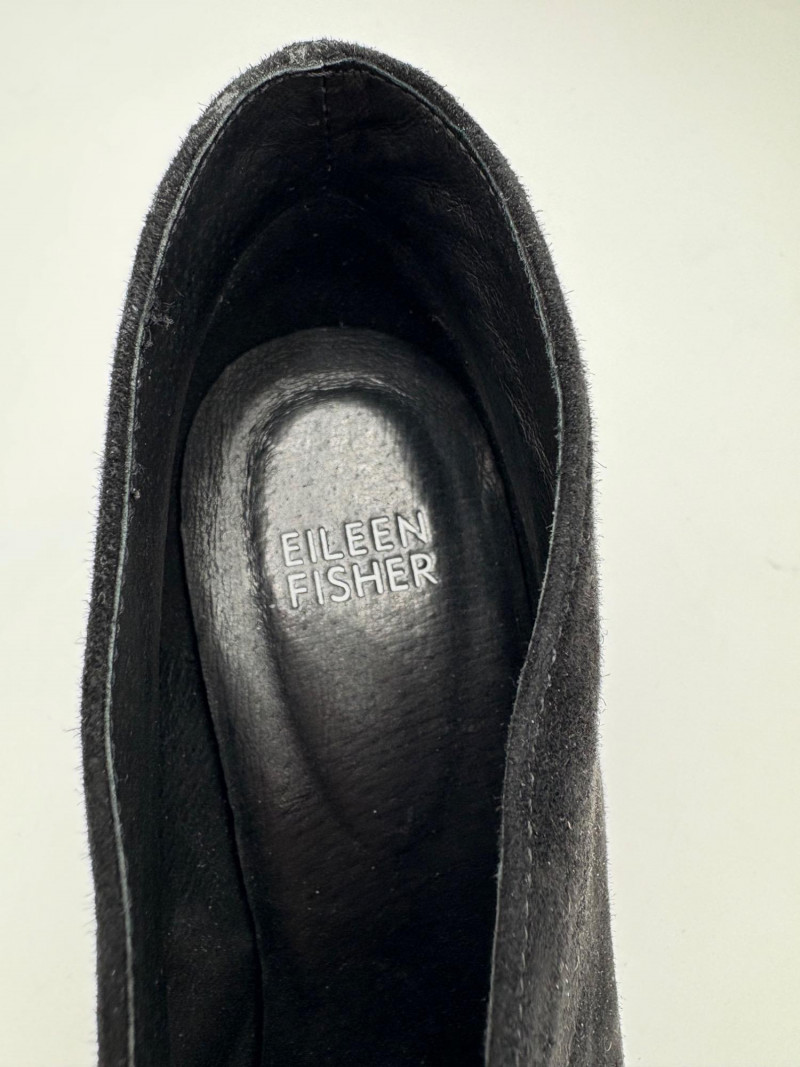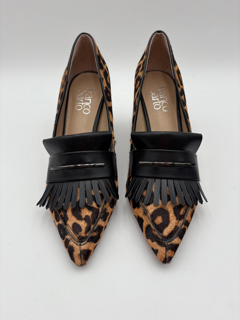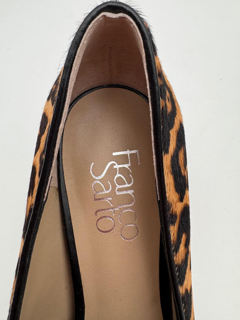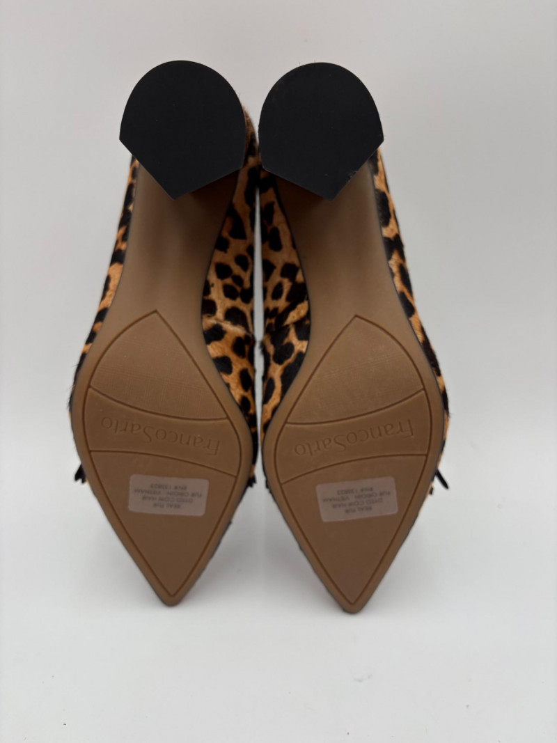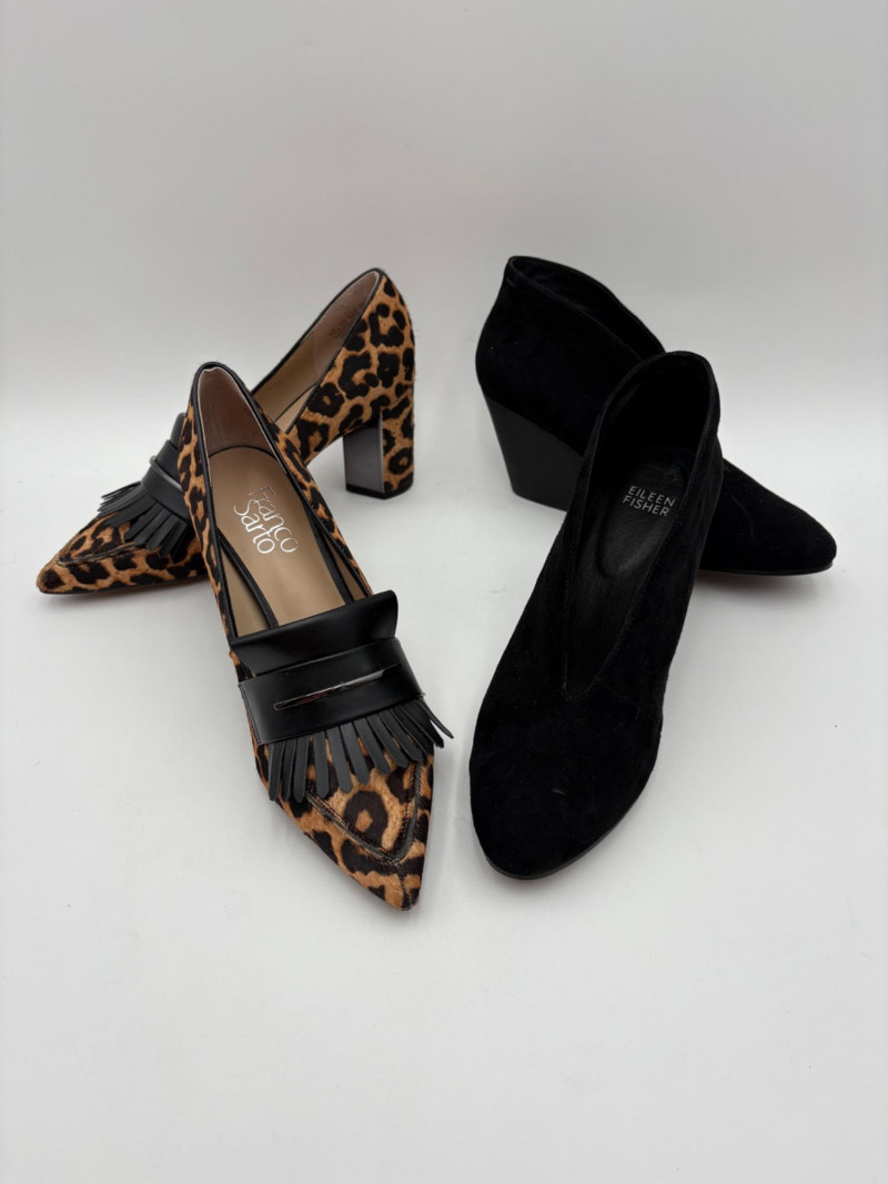 Franco Sarto animal print "pony hair" chunky leather pumps with mirrored interior heels and fringed vamp. Appear to be new. Size 7.5. Eileen Fisher burgundy seude flats with thin black non-slip sole. Size 7.5.