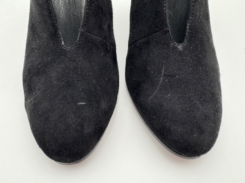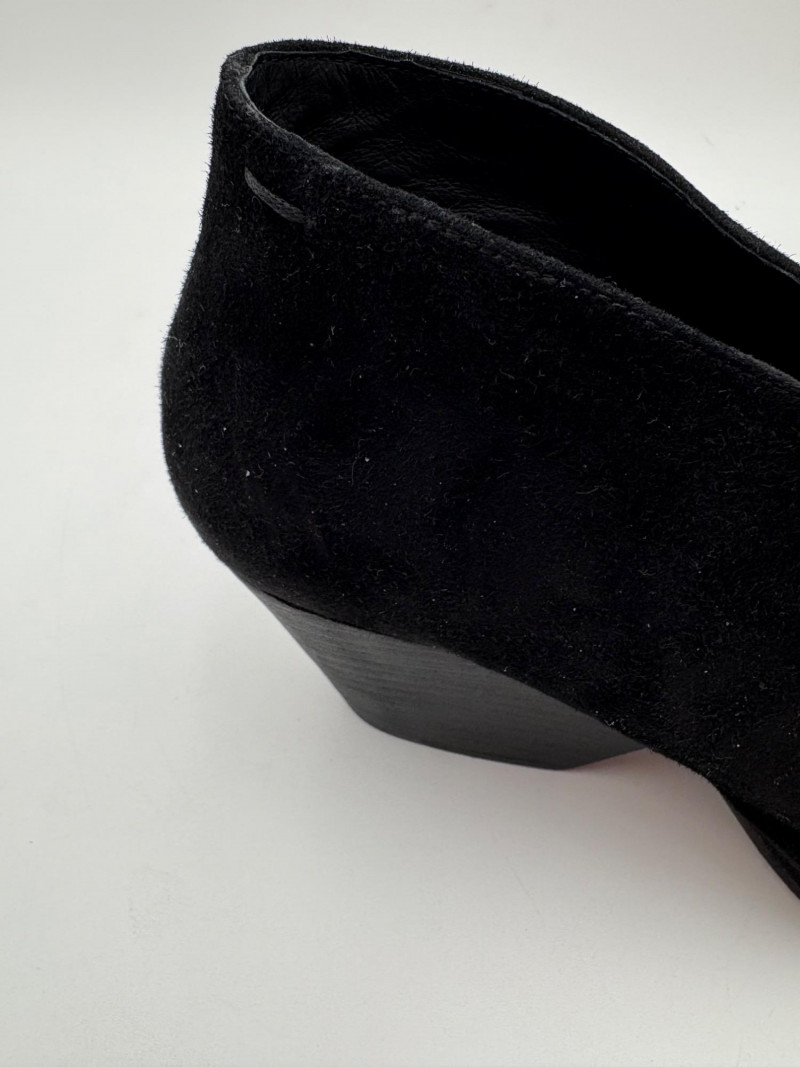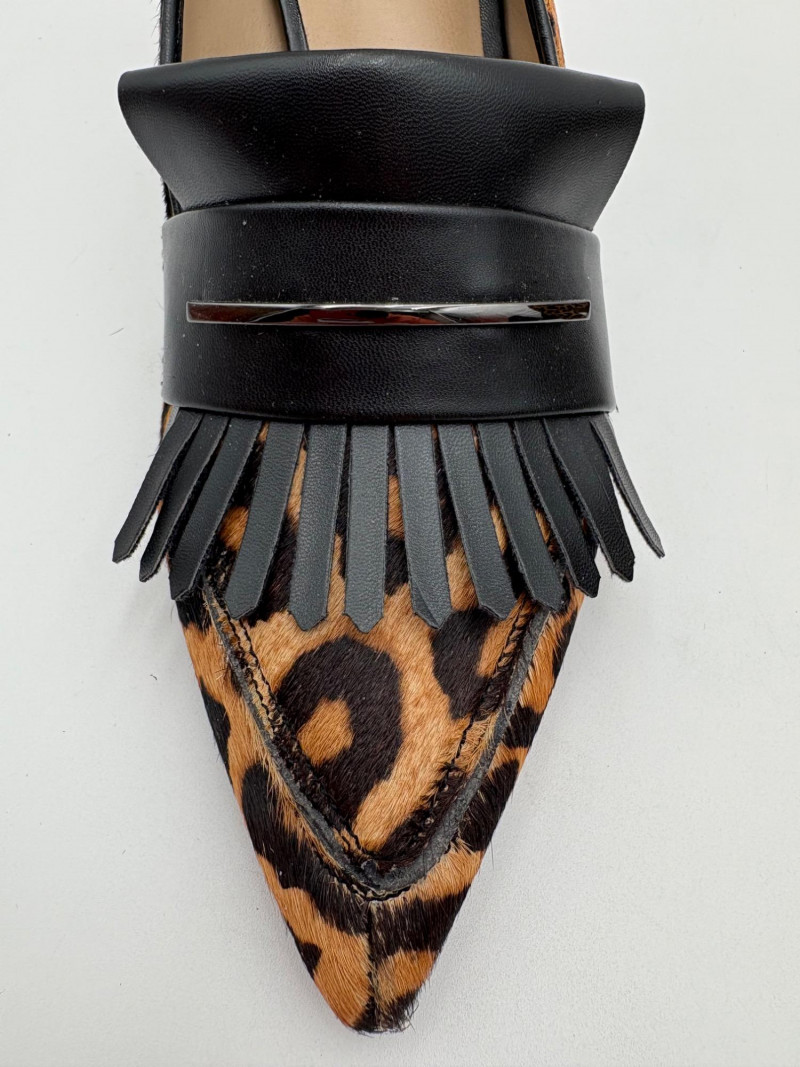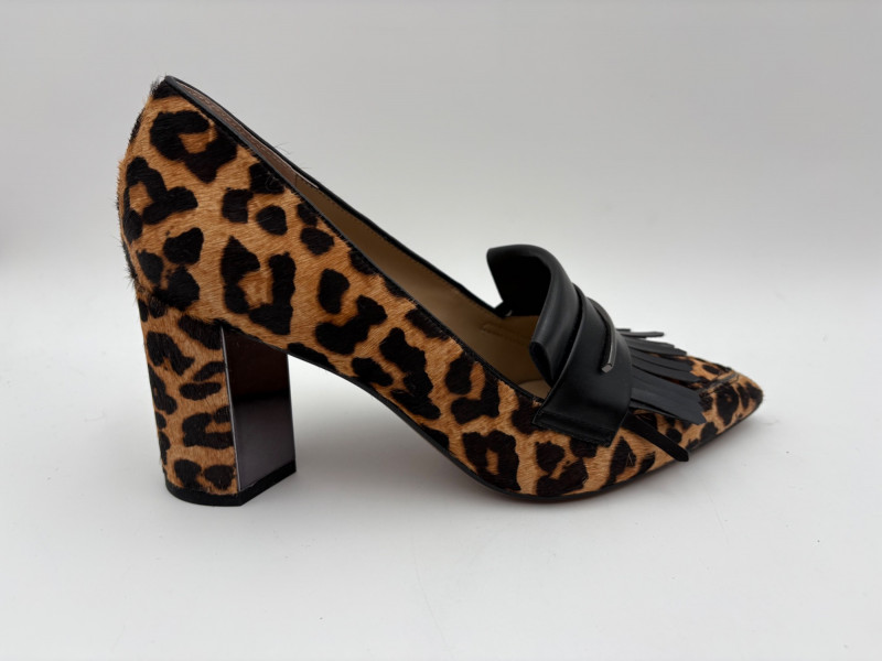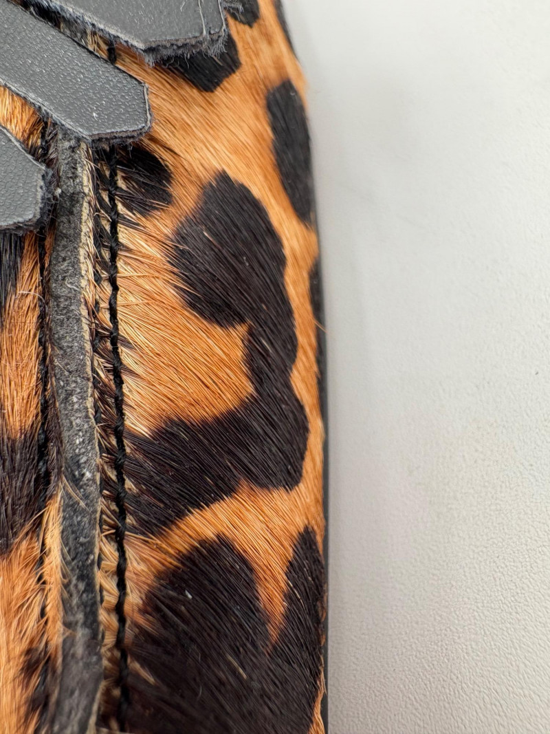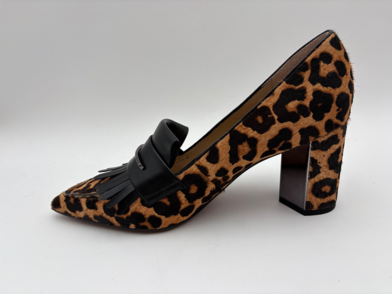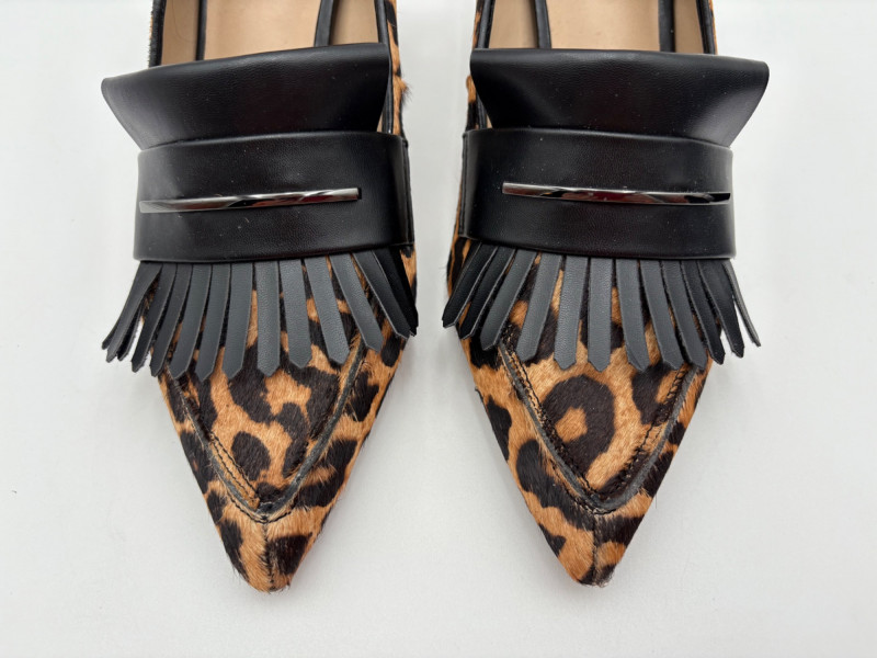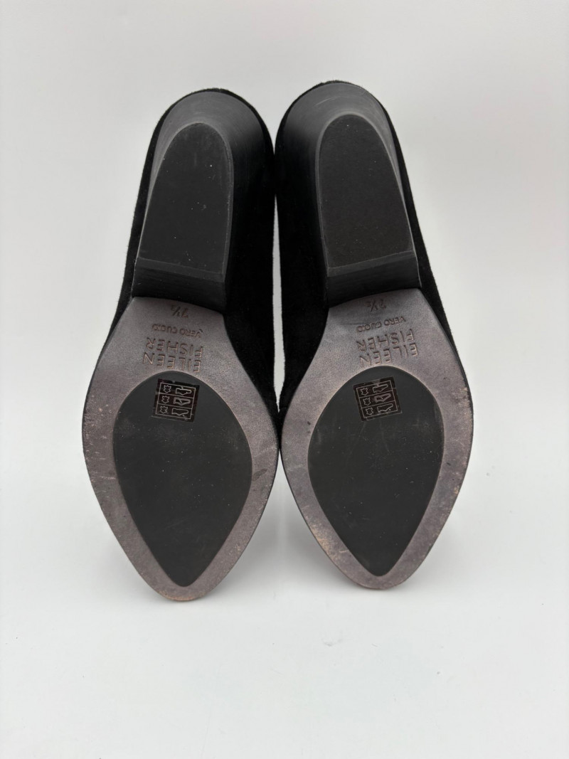 Franco Sarto animal print "pony hair" chunky leather pumps with mirrored interior heels and fringed vamp. Appear to be new. Size 7.5. Eileen Fisher burgundy seude flats with thin black non-slip sole. Size 7.5.