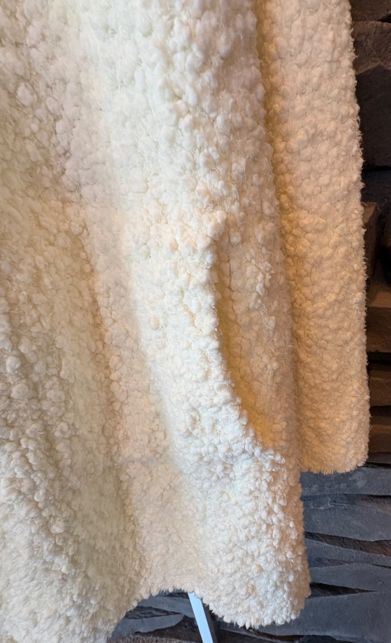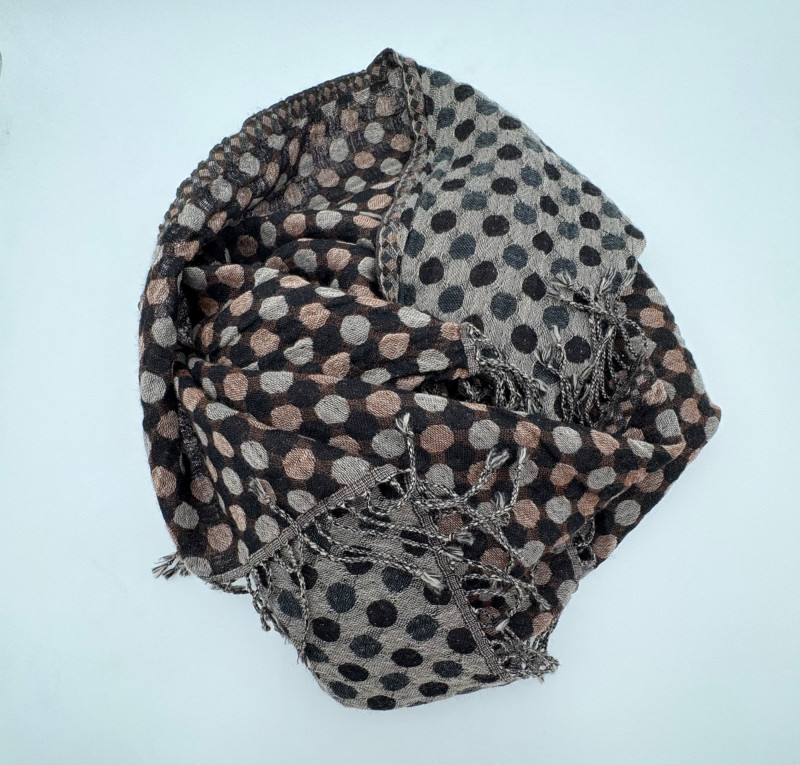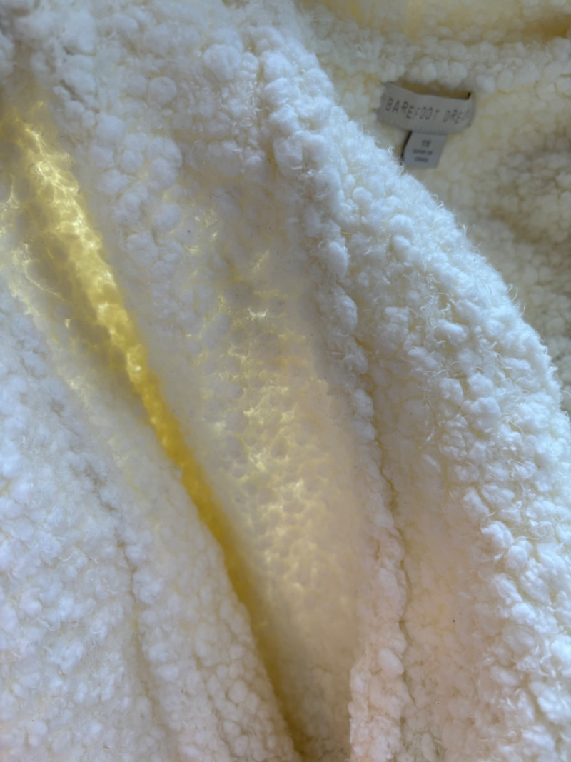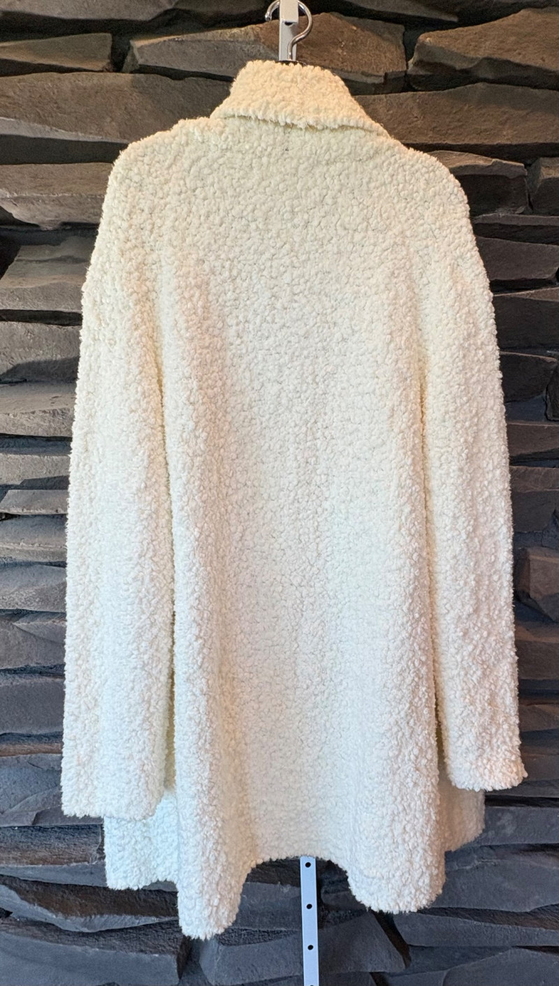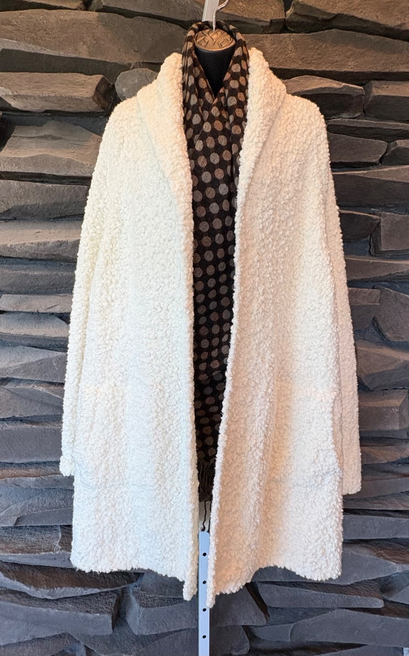Super comfy and soft, this nubby off-white jacket from Barefoot Dreams has shawl collar, welted slash pockets, and fair amount of heft to the fabric - perfect for dashing off to the market on a cold morning. Measures 22" pit to pit and 35" from back neckline to hem. Size tag says 1X. Paired with a polka dot scarf that measures approximately 27“ x 90“. No maker mark or fabric tag, but appears to be cotton with fringe on the short edges.