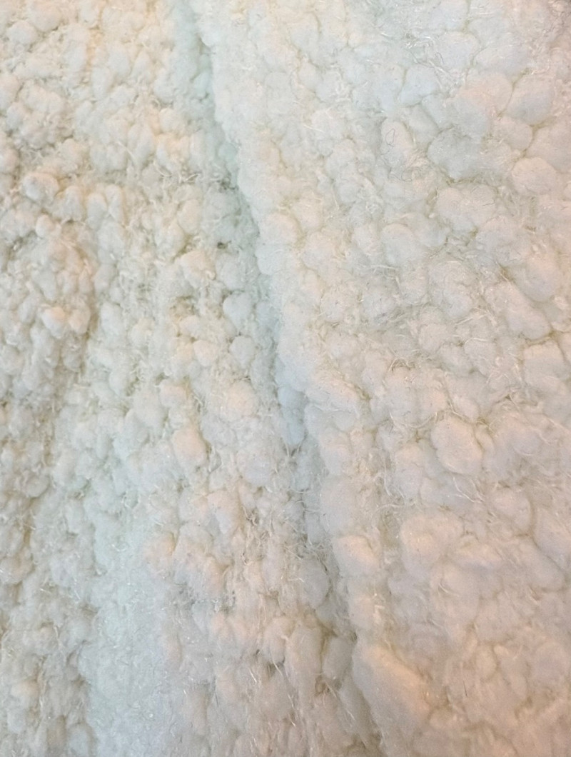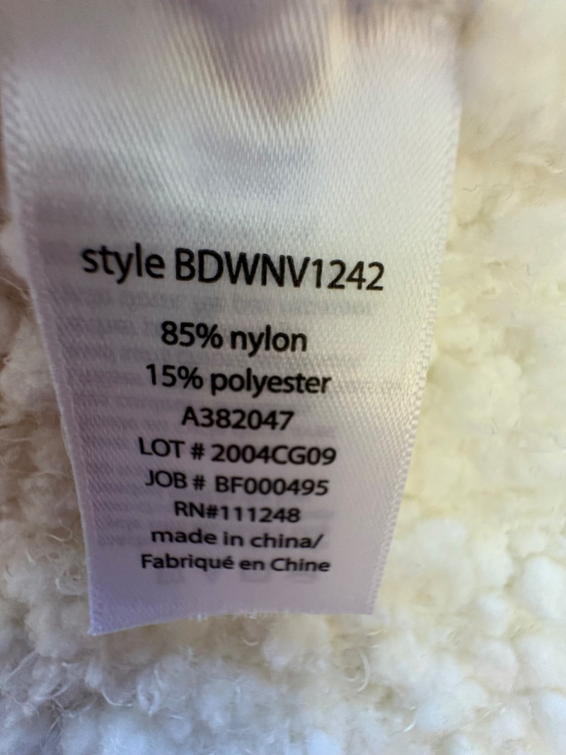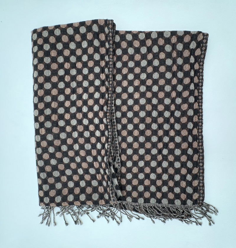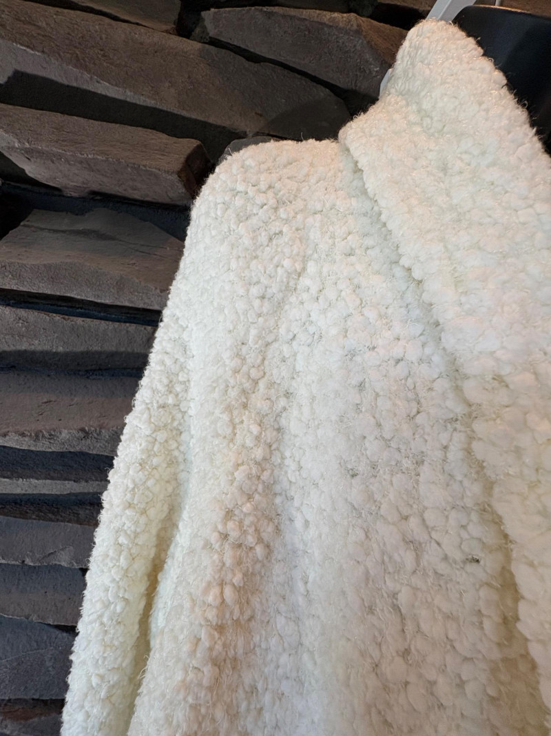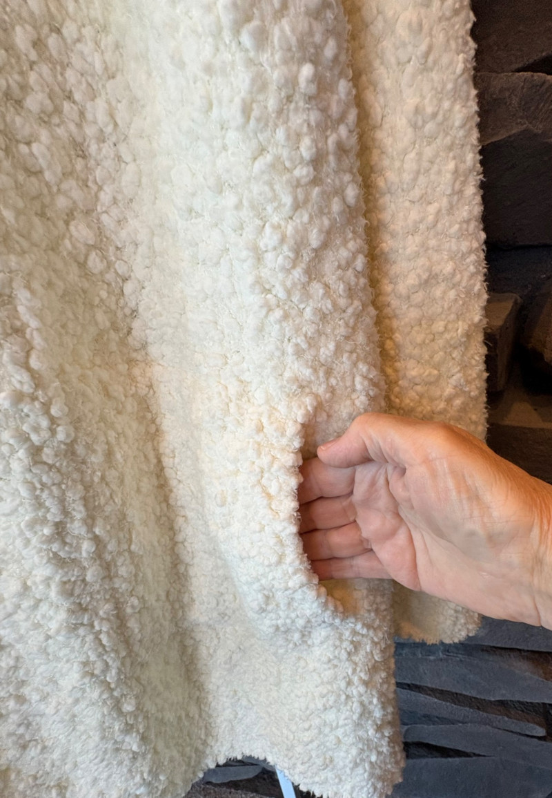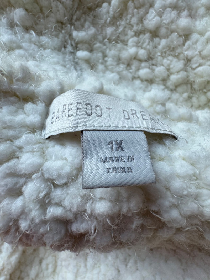 Super comfy and soft, this nubby off-white jacket from Barefoot Dreams has shawl collar, welted slash pockets, and fair amount of heft to the fabric - perfect for dashing off to the market on a cold morning. Measures 22" pit to pit and 35" from back neckline to hem. Size tag says 1X. Paired with a polka dot scarf that measures approximately 27“ x 90“. No maker mark or fabric tag, but appears to be cotton with fringe on the short edges.