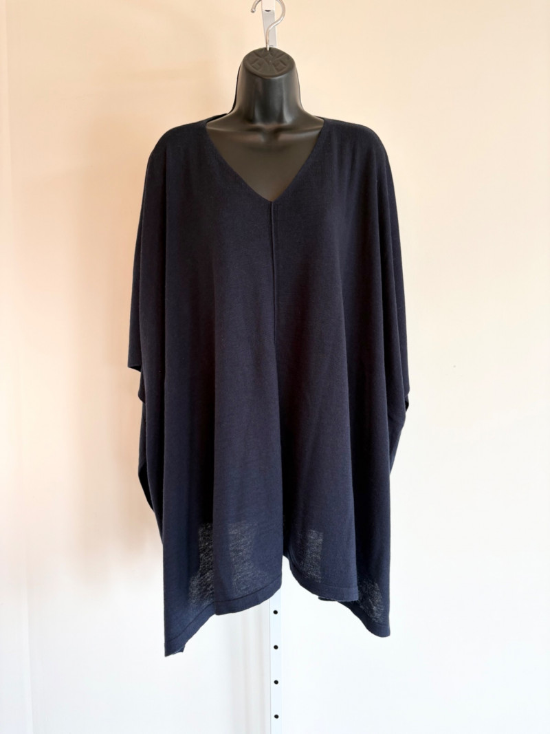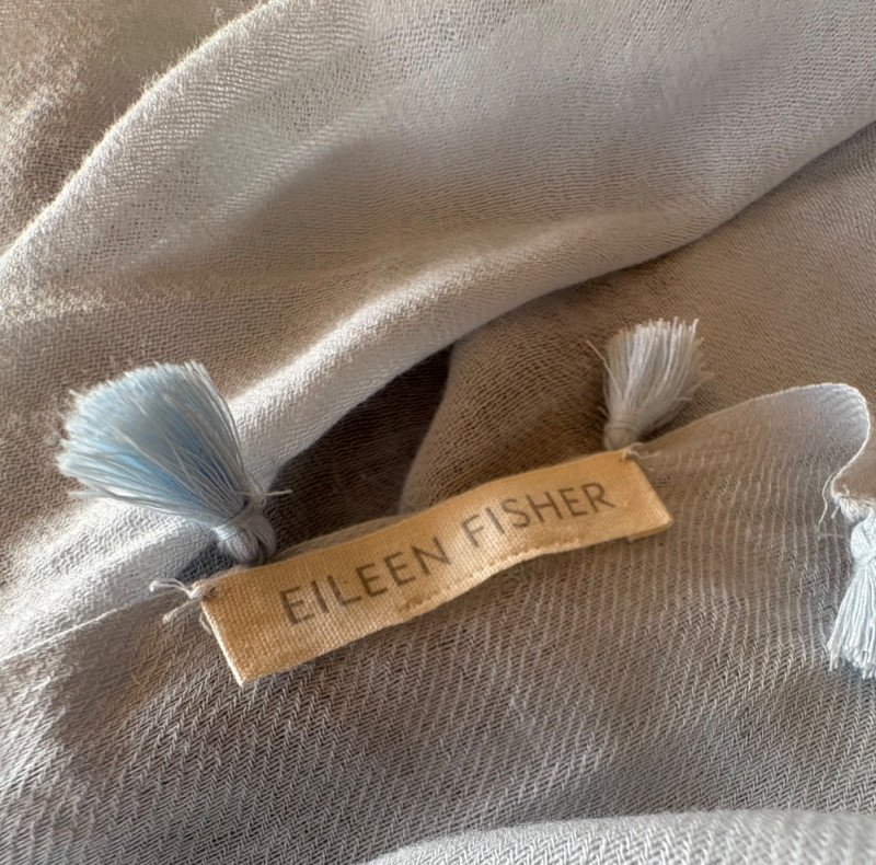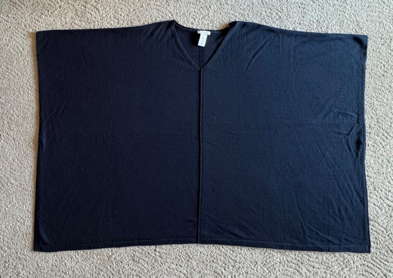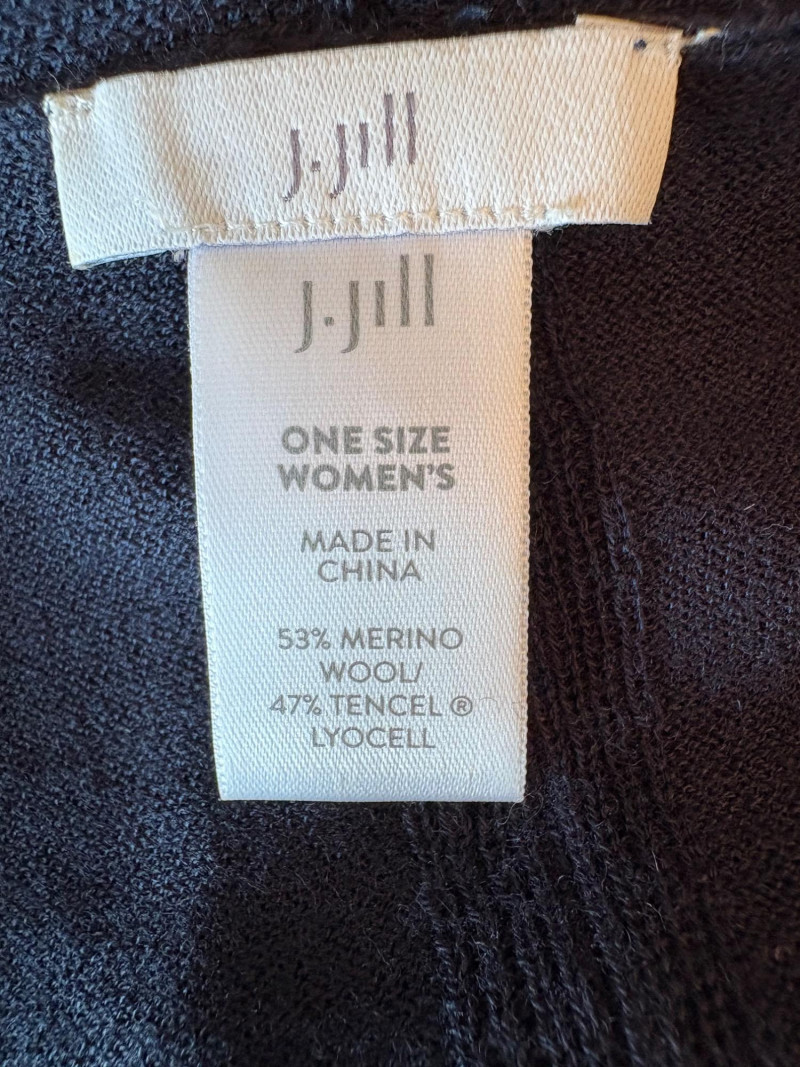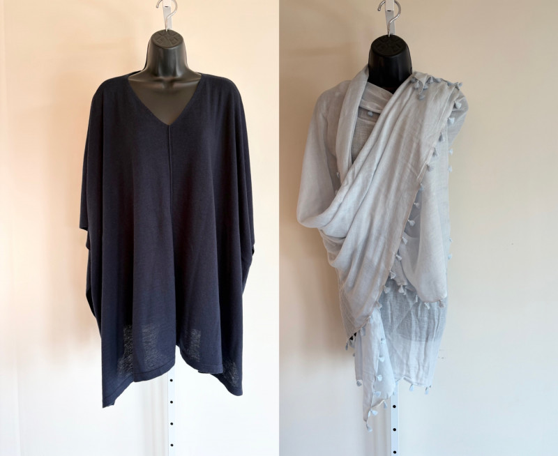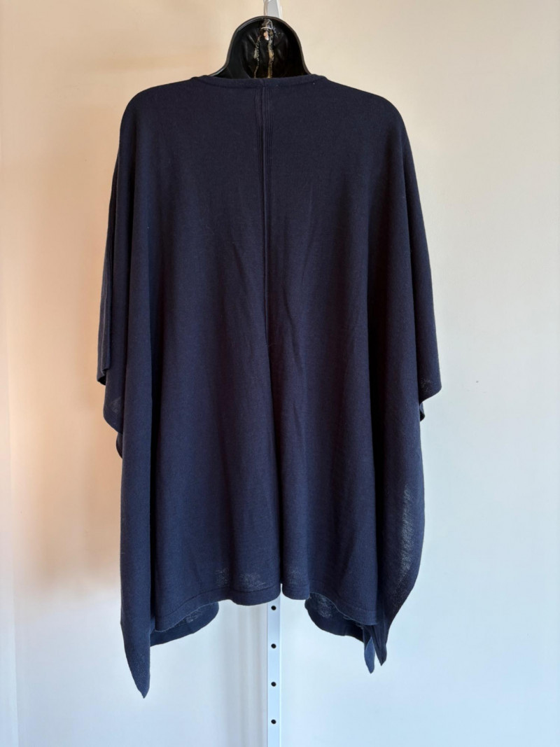 Two blue wraps, one in deep blue from J. Jill and one in pale blue from Eileen Fisher. Dark blue wrap from J Jill is a modified square with a head opening and single button closures at the sides. Merino wool/Lyocell blend. Measures approximately 29" from shoulder to hem x 44" across. Size tag says One Size. Pale blue wrap From Eileen Fisher is a large rectangle with pom-pom fringe on all four sides. No fabric tag but wrap has a lightweight voile-like texture and is quite soft. Measures approximately 40“ x 78".