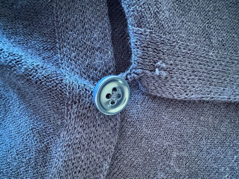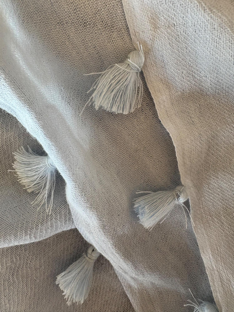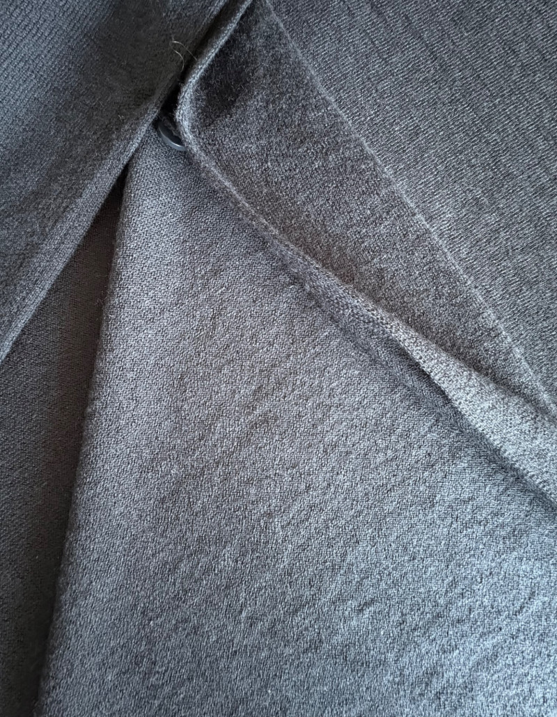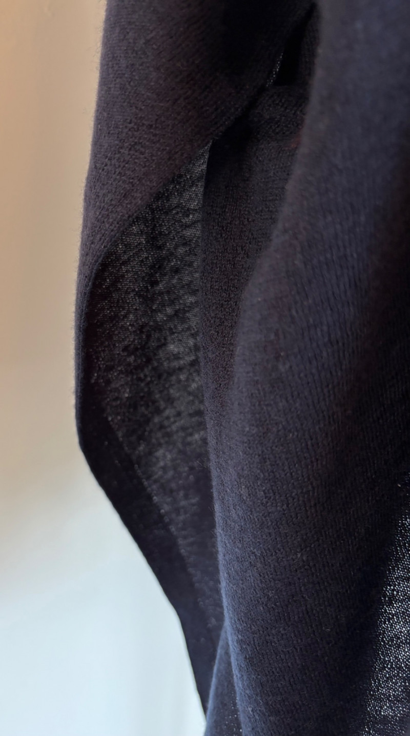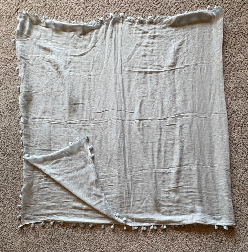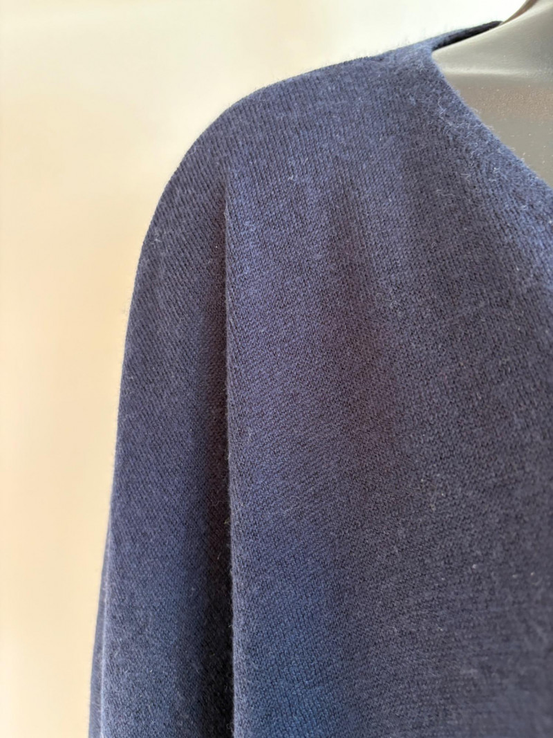 Two blue wraps, one in deep blue from J. Jill and one in pale blue from Eileen Fisher. Dark blue wrap from J Jill is a modified square with a head opening and single button closures at the sides. Merino wool/Lyocell blend. Measures approximately 29" from shoulder to hem x 44" across. Size tag says One Size. Pale blue wrap From Eileen Fisher is a large rectangle with pom-pom fringe on all four sides. No fabric tag but wrap has a lightweight voile-like texture and is quite soft. Measures approximately 40“ x 78".
