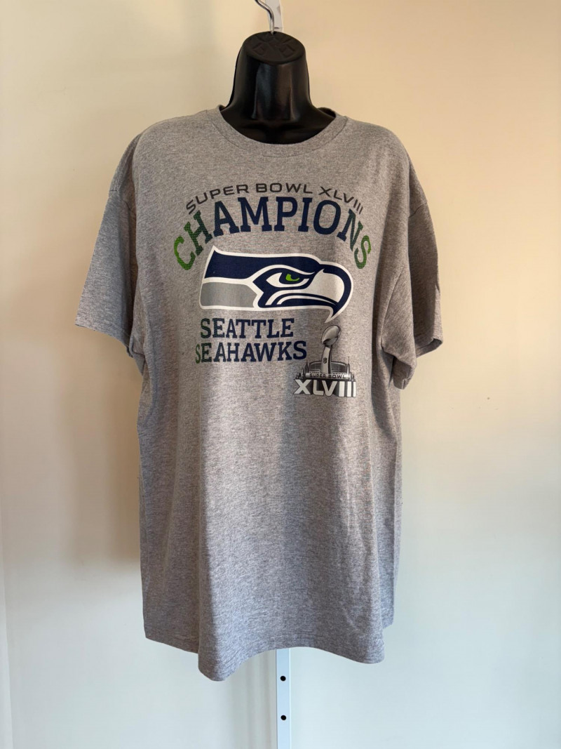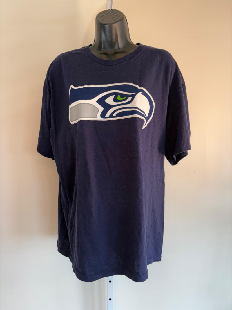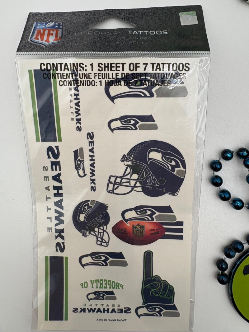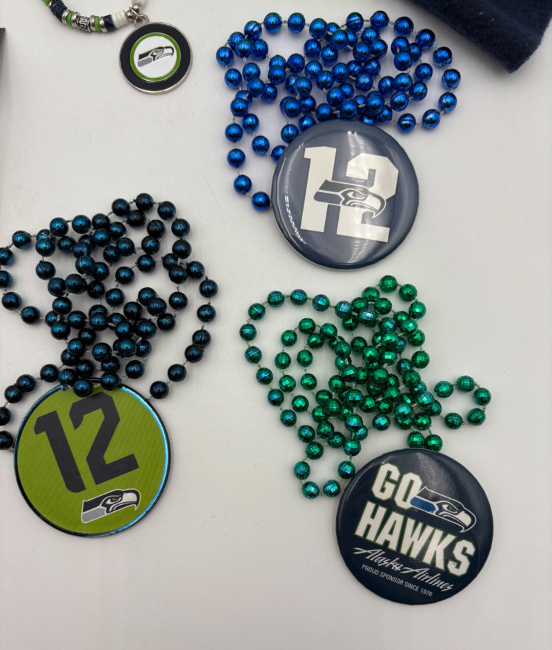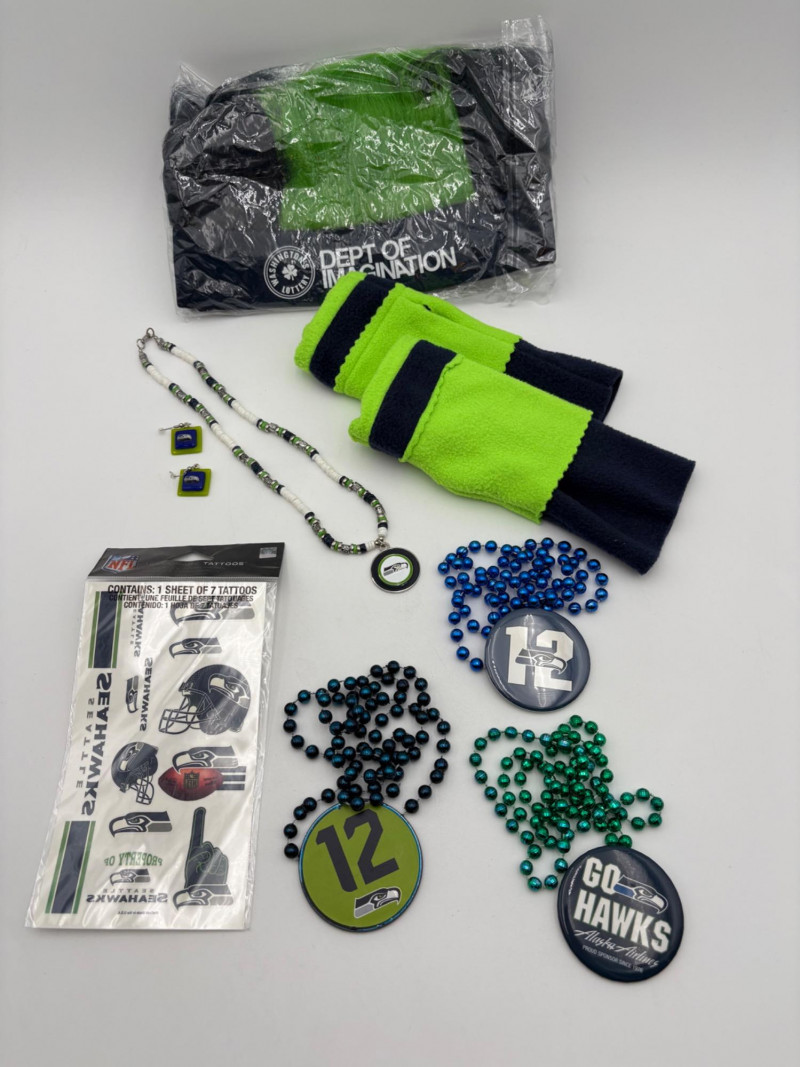 Group of Seahawk fan shirts & novelties. T-shirts are in various sizes - please check the measurements below: White logo shirt with blue raglan sleeves measures 24" pit to pit. Size tag says XXL. Blue shirt with striped short sleeves measures 21" pit to pit. Size tag says XL. Grey long-sleeve shirt measures 23" pit to pit. Size tag says XL. Blue Russell Wilson shirt measures 23" pit to pit. Size tag says XL. Blue long-sleeve shirt measures 22" pit to pit. Size tag says XXL. Shows some wear under arms - needs to be sweater shaved as it is a polyester/rayon blend. Grey Superbowl shirt measures 23" pit to pit. Size tag says XL. Novelty items include faux fur sweatband hat, Seahawks necklace, wrist warmers, Seahawks earrings, three 12th man medallions on bead necklaces, and tattoos.