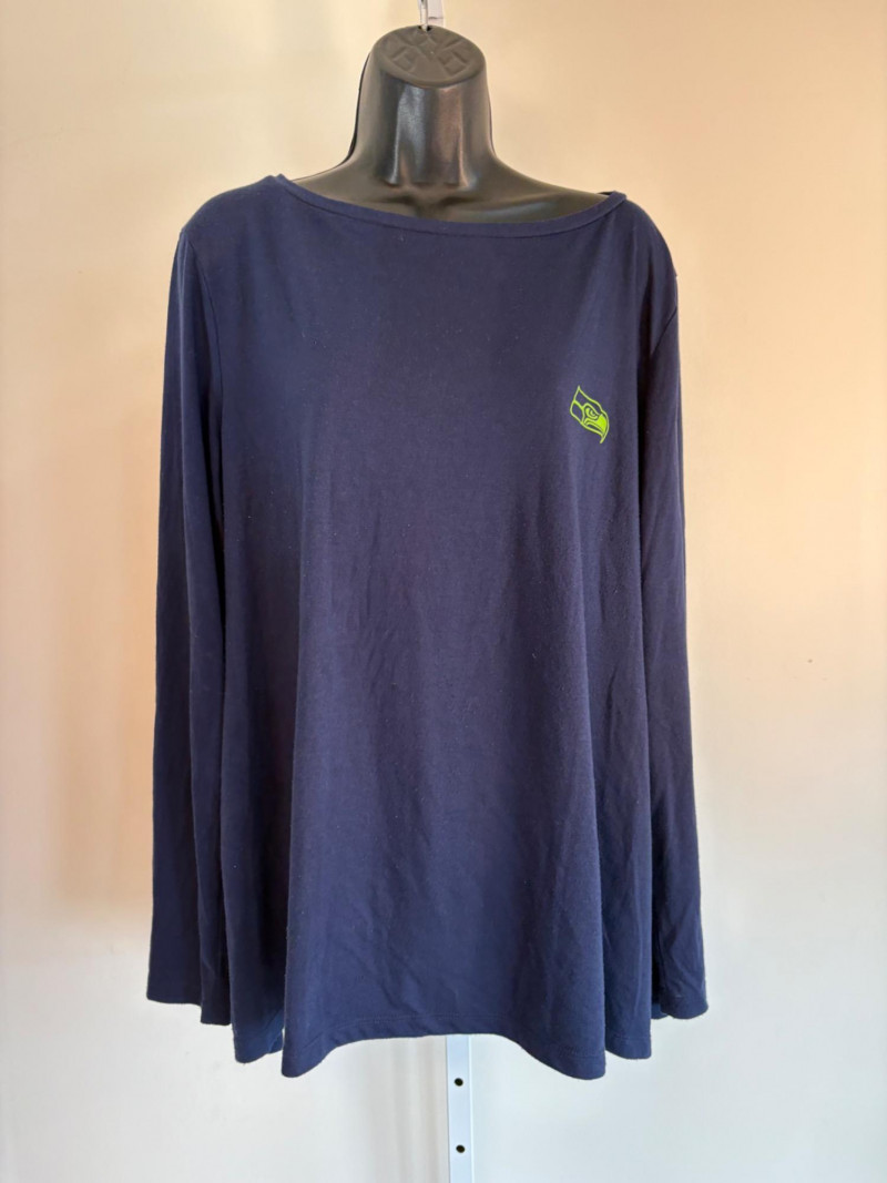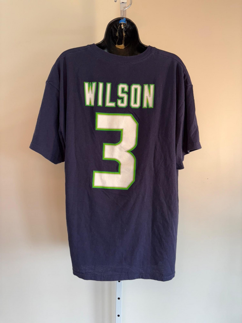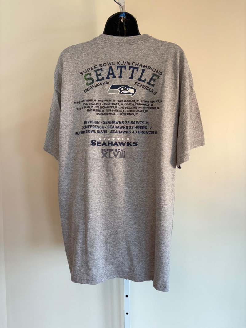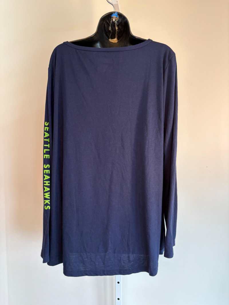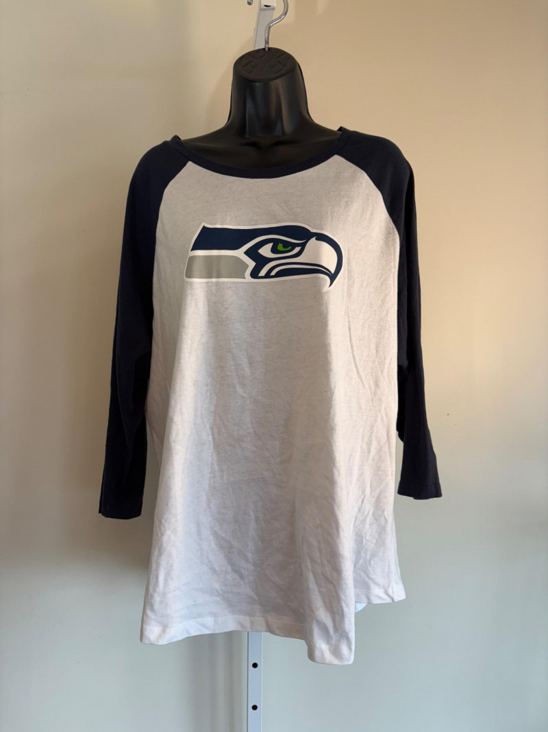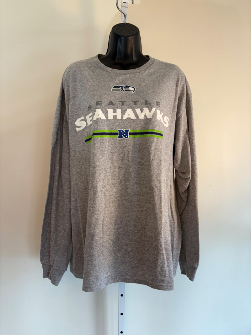 Group of Seahawk fan shirts & novelties. T-shirts are in various sizes - please check the measurements below: White logo shirt with blue raglan sleeves measures 24" pit to pit. Size tag says XXL. Blue shirt with striped short sleeves measures 21" pit to pit. Size tag says XL. Grey long-sleeve shirt measures 23" pit to pit. Size tag says XL. Blue Russell Wilson shirt measures 23" pit to pit. Size tag says XL. Blue long-sleeve shirt measures 22" pit to pit. Size tag says XXL. Shows some wear under arms - needs to be sweater shaved as it is a polyester/rayon blend. Grey Superbowl shirt measures 23" pit to pit. Size tag says XL. Novelty items include faux fur sweatband hat, Seahawks necklace, wrist warmers, Seahawks earrings, three 12th man medallions on bead necklaces, and tattoos.
