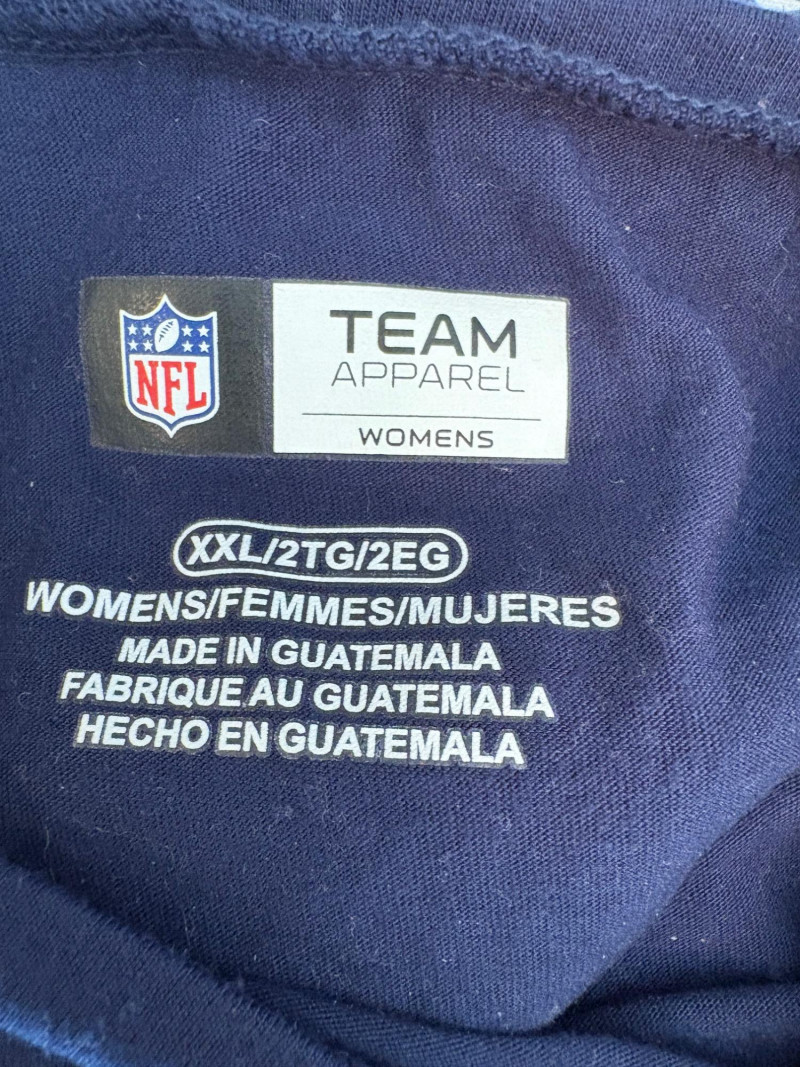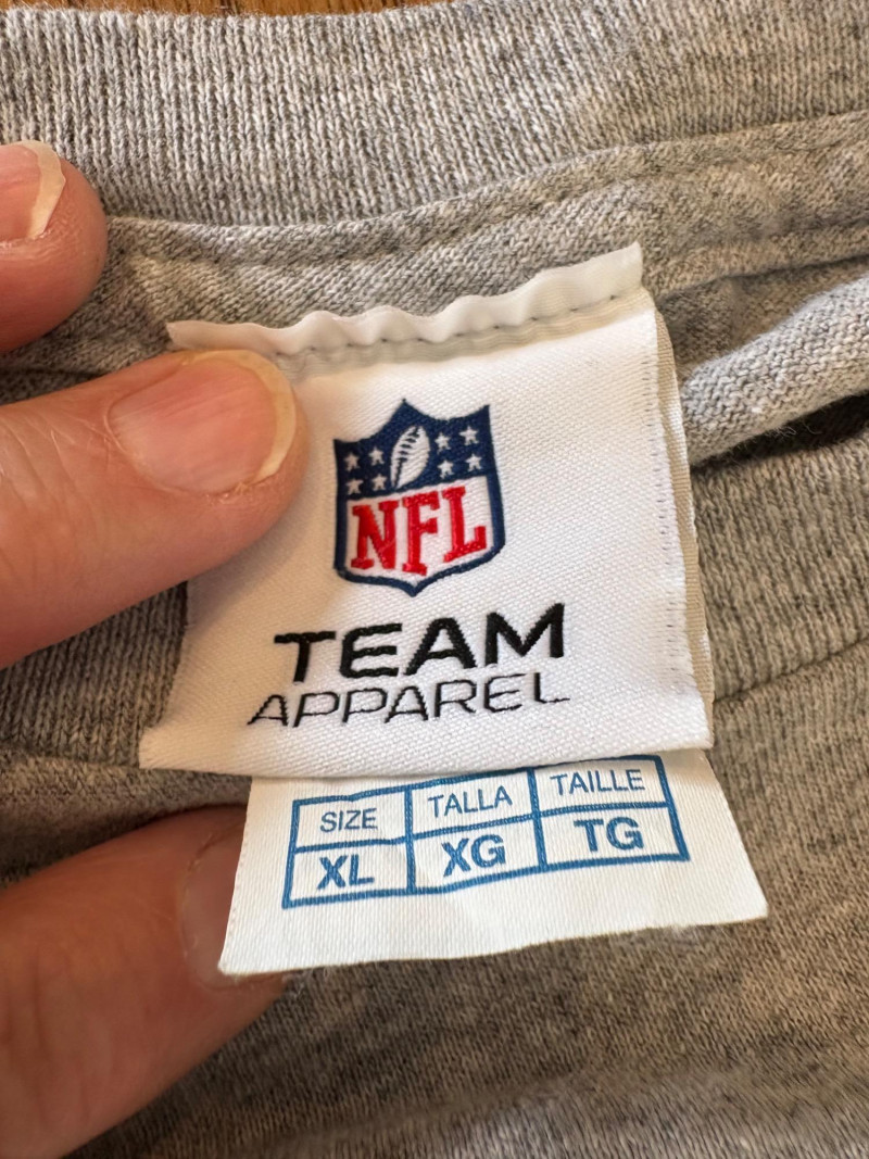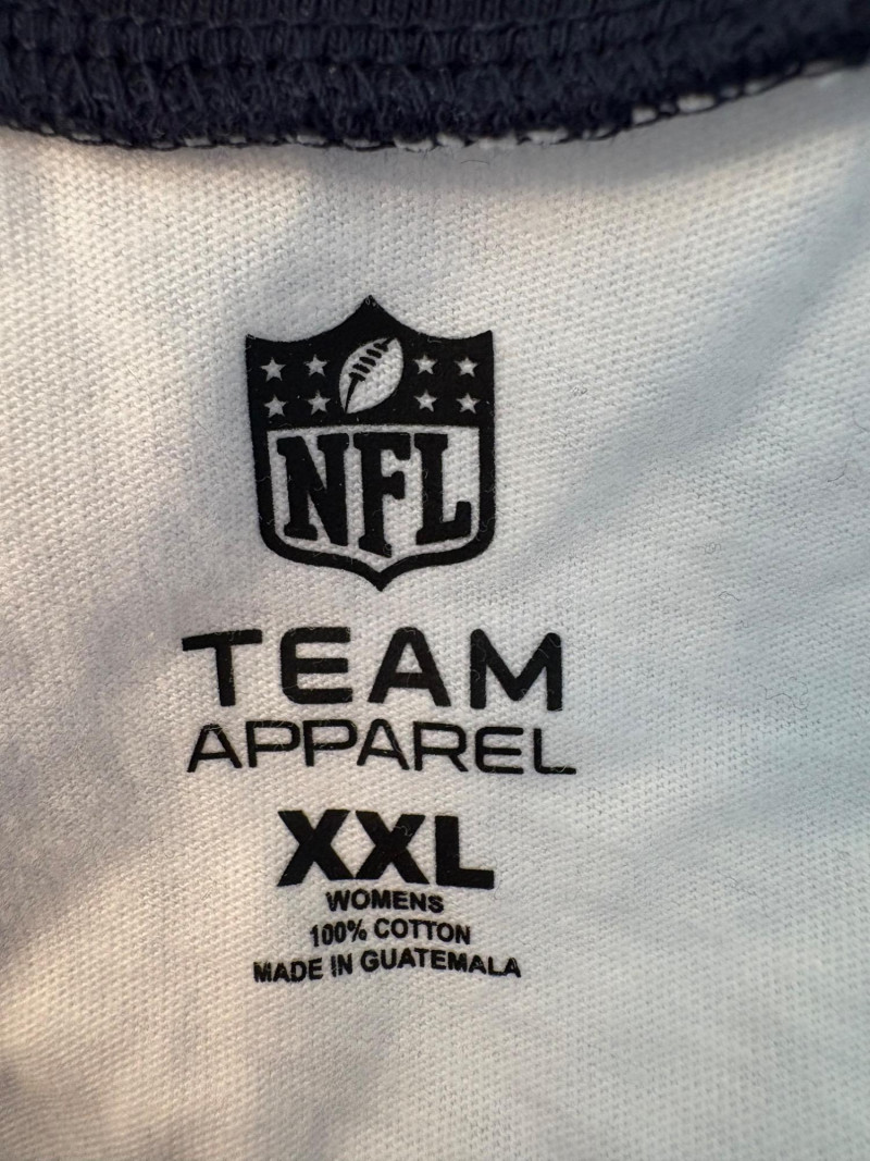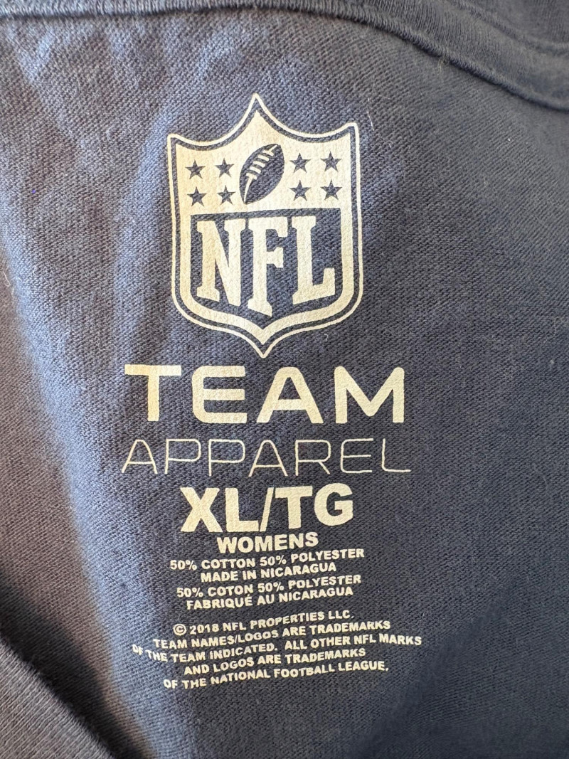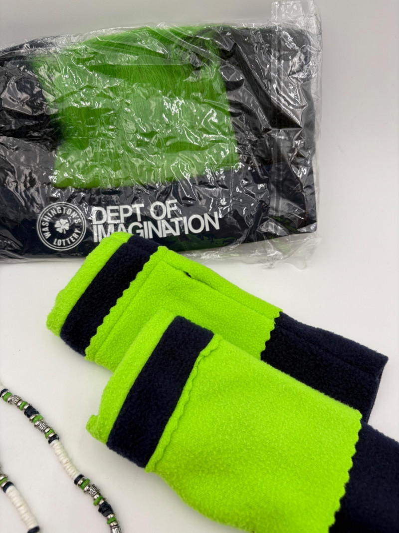 Group of Seahawk fan shirts & novelties. T-shirts are in various sizes - please check the measurements below: White logo shirt with blue raglan sleeves measures 24" pit to pit. Size tag says XXL. Blue shirt with striped short sleeves measures 21" pit to pit. Size tag says XL. Grey long-sleeve shirt measures 23" pit to pit. Size tag says XL. Blue Russell Wilson shirt measures 23" pit to pit. Size tag says XL. Blue long-sleeve shirt measures 22" pit to pit. Size tag says XXL. Shows some wear under arms - needs to be sweater shaved as it is a polyester/rayon blend. Grey Superbowl shirt measures 23" pit to pit. Size tag says XL. Novelty items include faux fur sweatband hat, Seahawks necklace, wrist warmers, Seahawks earrings, three 12th man medallions on bead necklaces, and tattoos.
