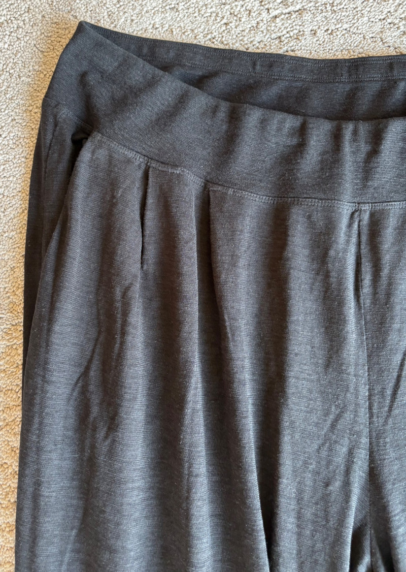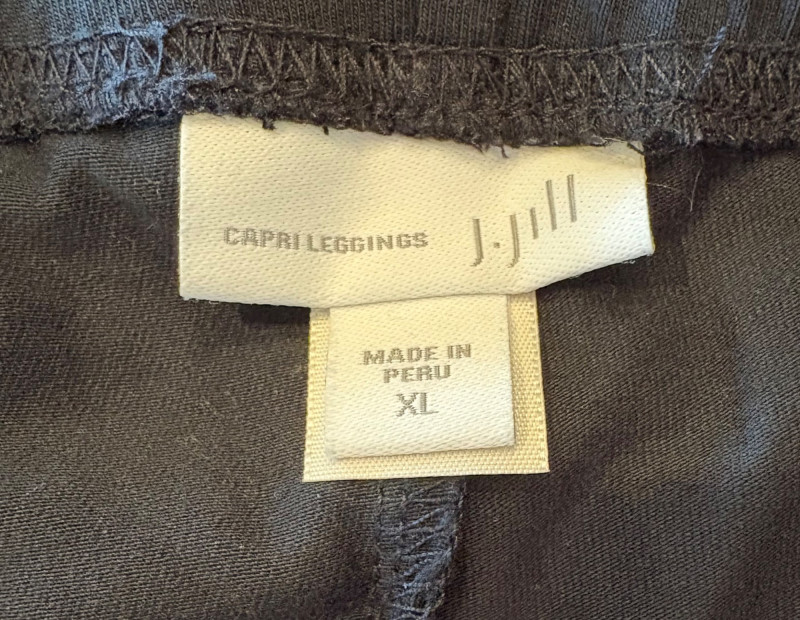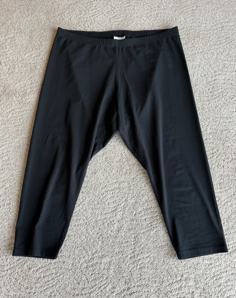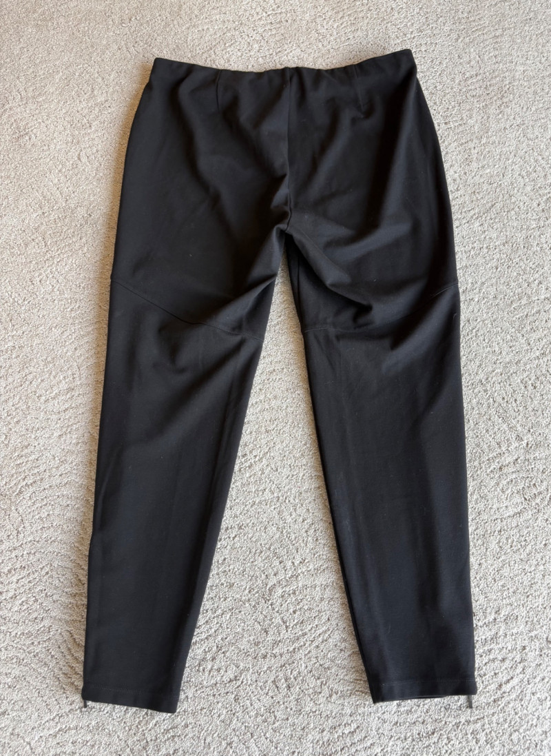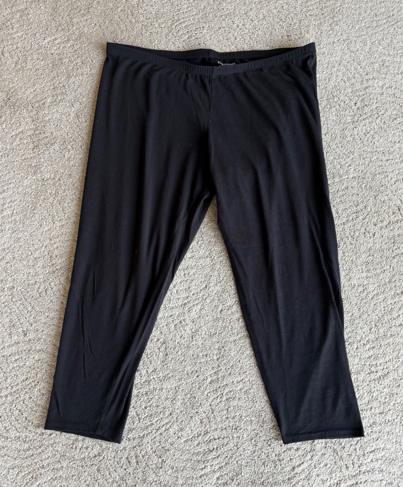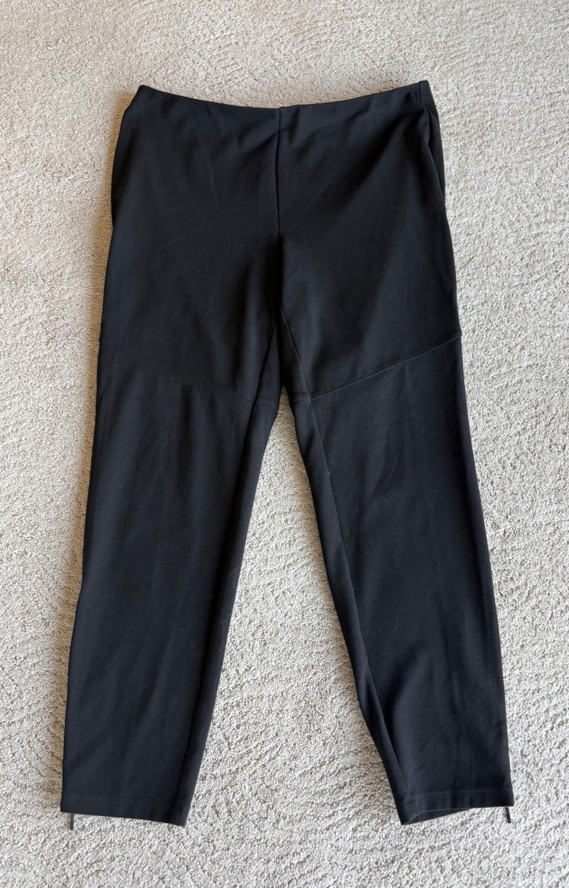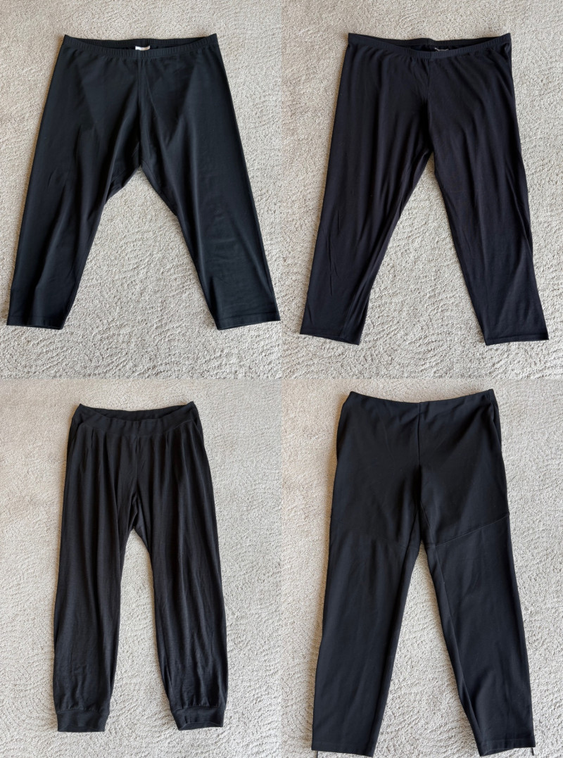 They're all black pants, but all different. All measure 17.5" side to side at waist. Cropped capri leggings from J. Jill are mid-weight, super soft, and tightly woven with lots of stretch. Cotton/spandex blend. Size tag says XL. Lightweight cropped leggings from Eileen Fisher are super stretchy and quite thin. Organic cotton/spandex blend. Size tag says XL. Black super light pants from Eileen Fisher have wide waistband with hidden elastic band inside, front pleats. set-in front pockets, and ribbed cuffs. Hemp/cotton/organic cotton/spandex blend. Size tag says L. Smooth pants (feel like good quality ponte) from Eileen Fisher are very plain but versatile with hidden elastic waistband, tapered legs, knee seams, and zippers at ankle. Viscose/nylon/spandex blend. Size tag says L.