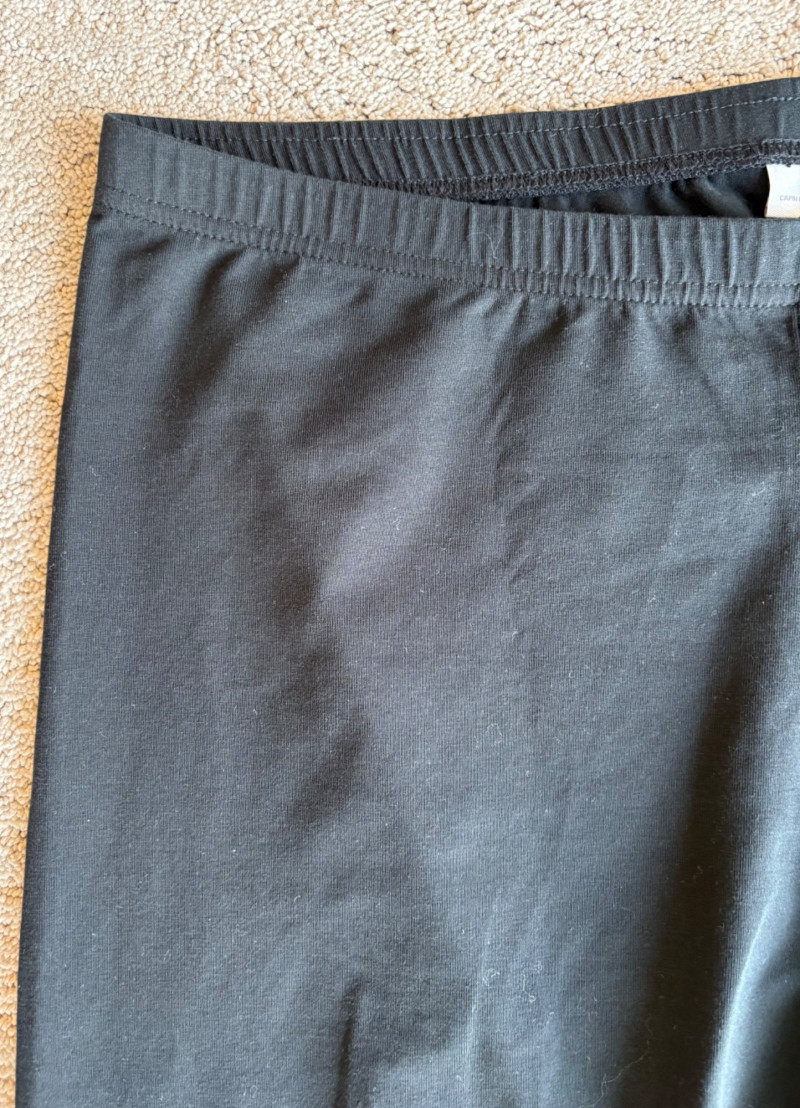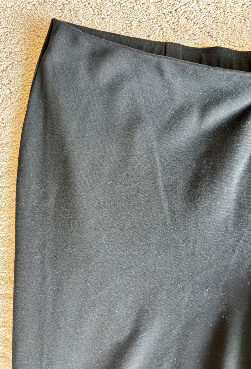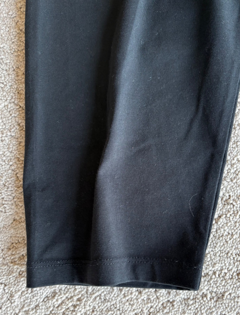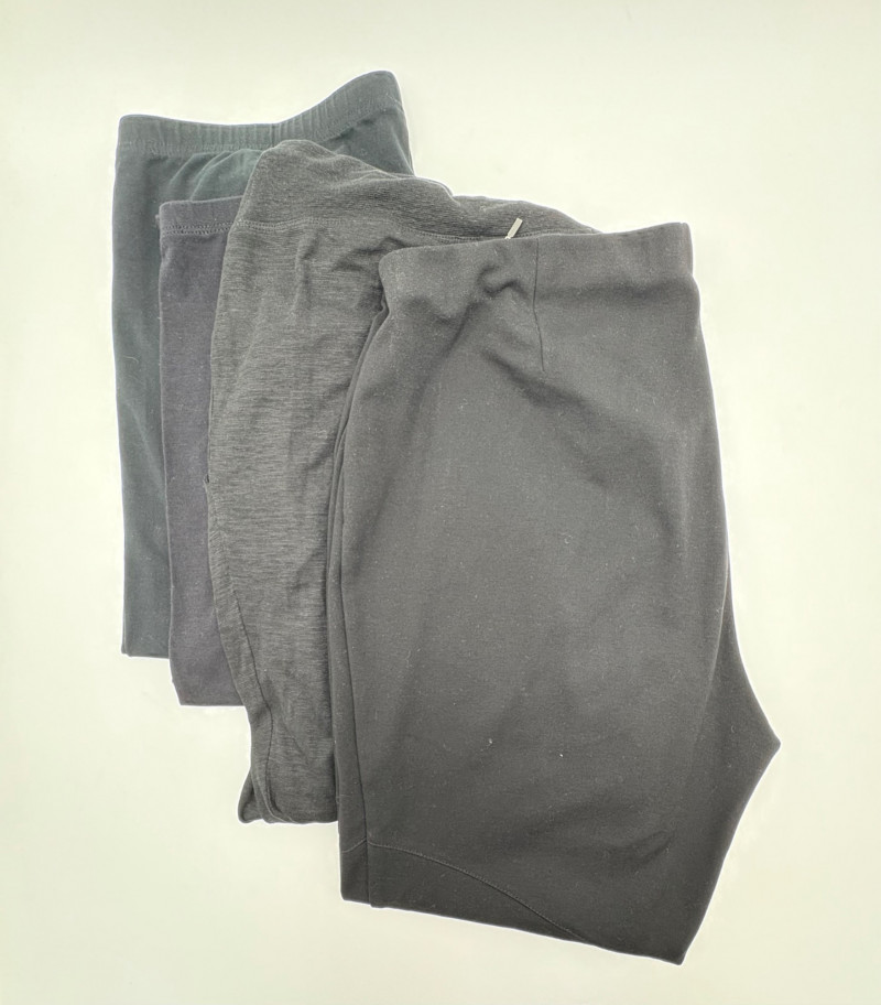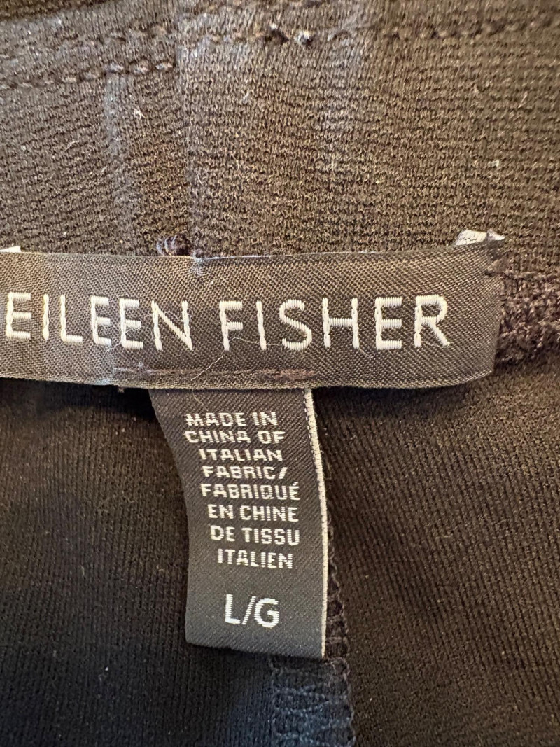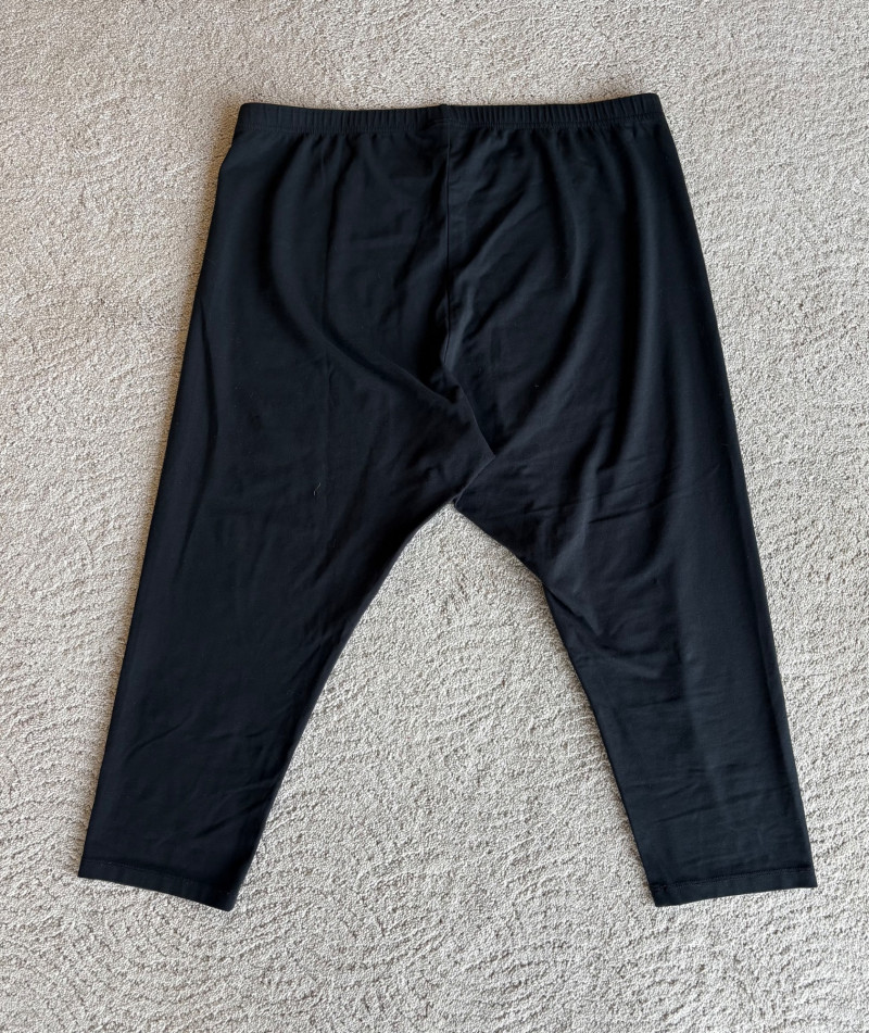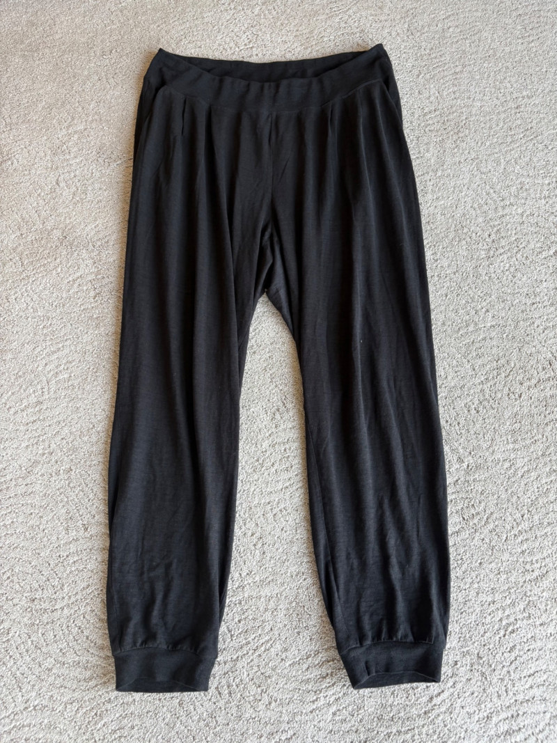 They're all black pants, but all different. All measure 17.5" side to side at waist. Cropped capri leggings from J. Jill are mid-weight, super soft, and tightly woven with lots of stretch. Cotton/spandex blend. Size tag says XL. Lightweight cropped leggings from Eileen Fisher are super stretchy and quite thin. Organic cotton/spandex blend. Size tag says XL. Black super light pants from Eileen Fisher have wide waistband with hidden elastic band inside, front pleats. set-in front pockets, and ribbed cuffs. Hemp/cotton/organic cotton/spandex blend. Size tag says L. Smooth pants (feel like good quality ponte) from Eileen Fisher are very plain but versatile with hidden elastic waistband, tapered legs, knee seams, and zippers at ankle. Viscose/nylon/spandex blend. Size tag says L.
