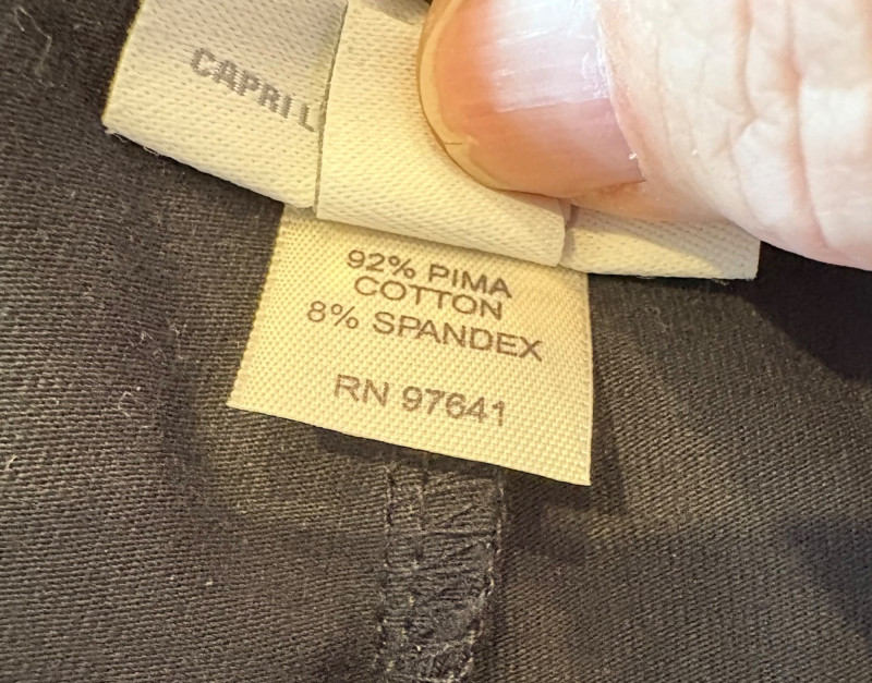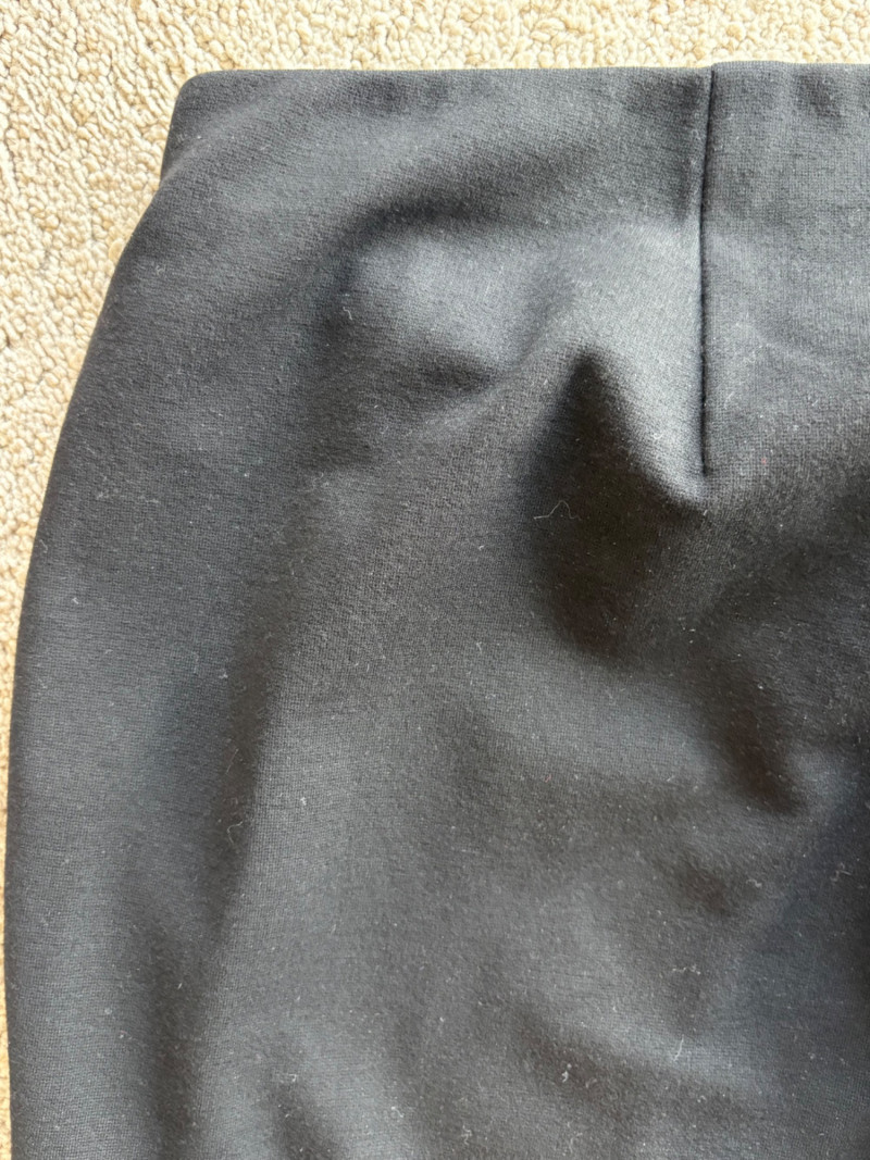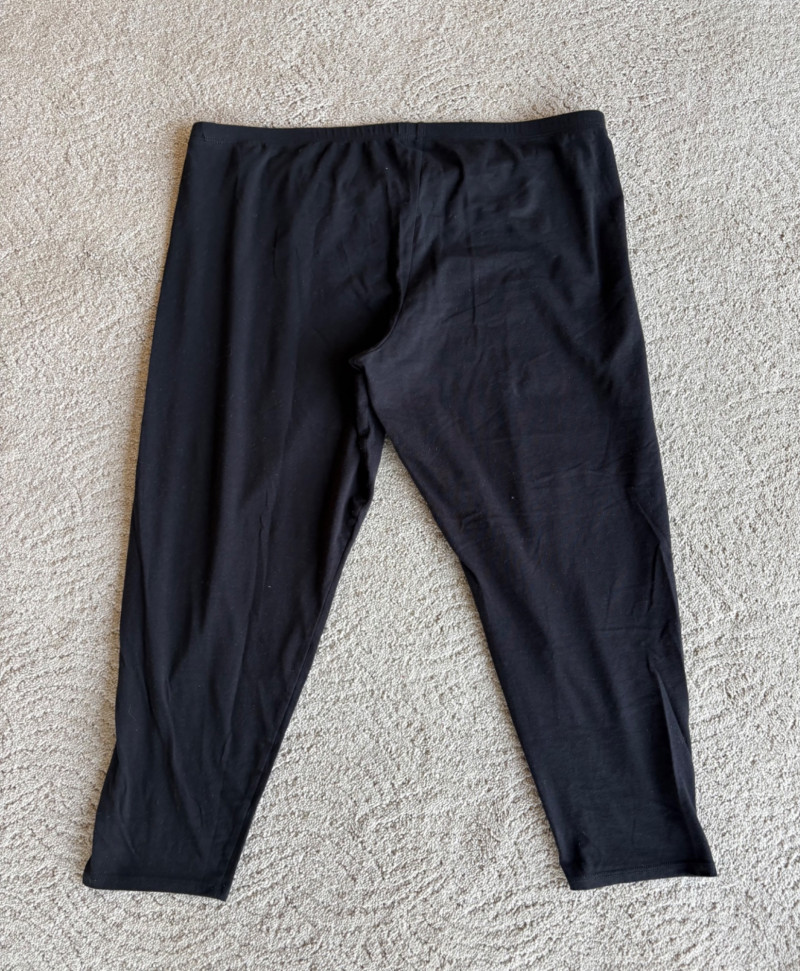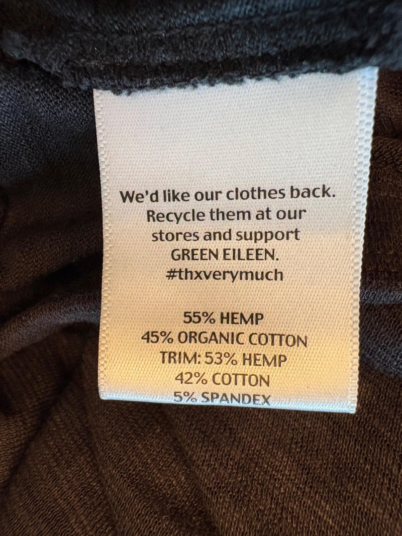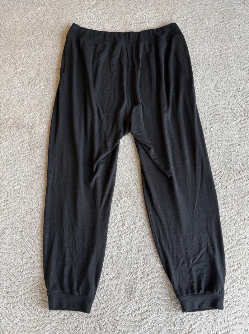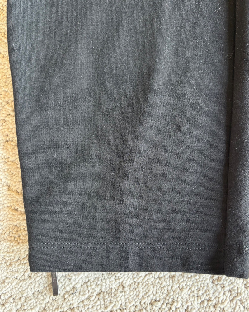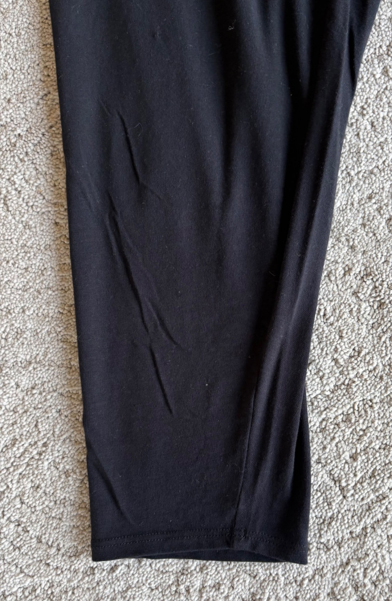 They're all black pants, but all different. All measure 17.5" side to side at waist. Cropped capri leggings from J. Jill are mid-weight, super soft, and tightly woven with lots of stretch. Cotton/spandex blend. Size tag says XL. Lightweight cropped leggings from Eileen Fisher are super stretchy and quite thin. Organic cotton/spandex blend. Size tag says XL. Black super light pants from Eileen Fisher have wide waistband with hidden elastic band inside, front pleats. set-in front pockets, and ribbed cuffs. Hemp/cotton/organic cotton/spandex blend. Size tag says L. Smooth pants (feel like good quality ponte) from Eileen Fisher are very plain but versatile with hidden elastic waistband, tapered legs, knee seams, and zippers at ankle. Viscose/nylon/spandex blend. Size tag says L.