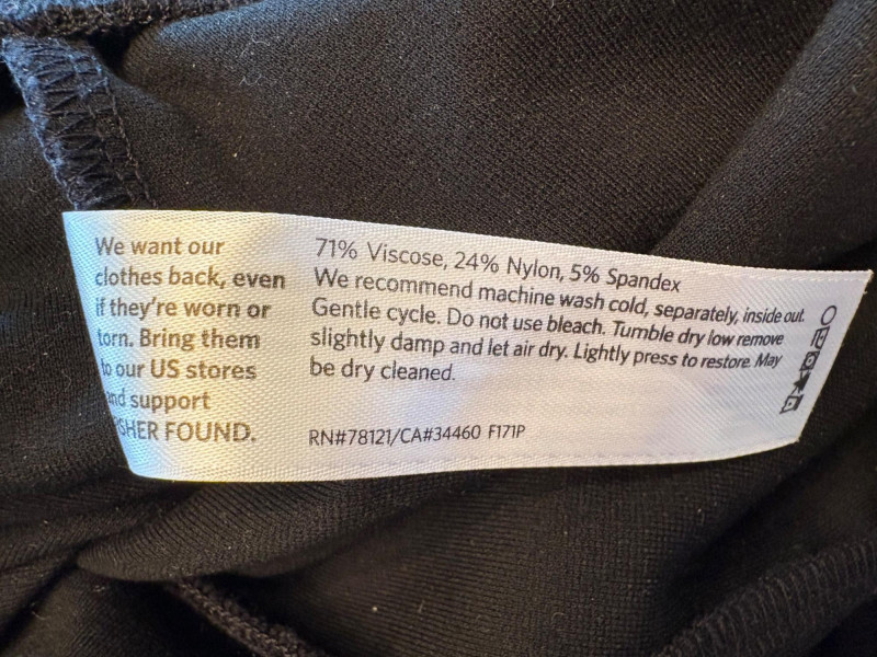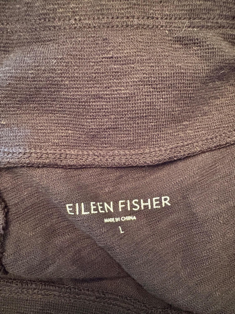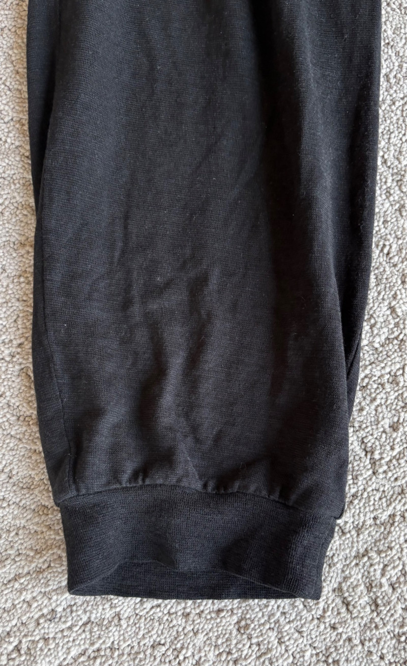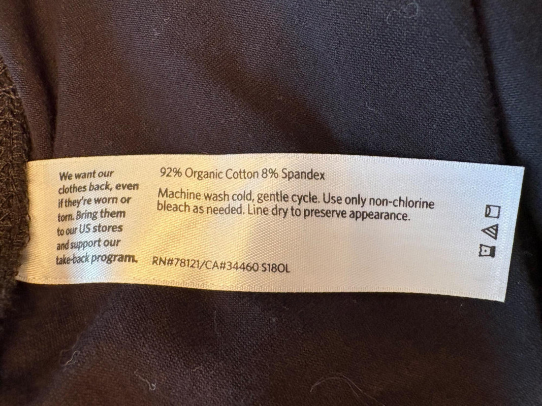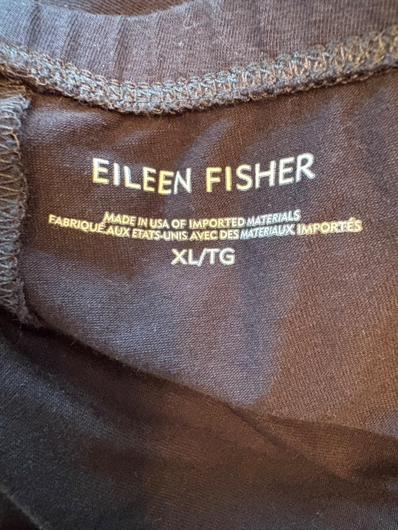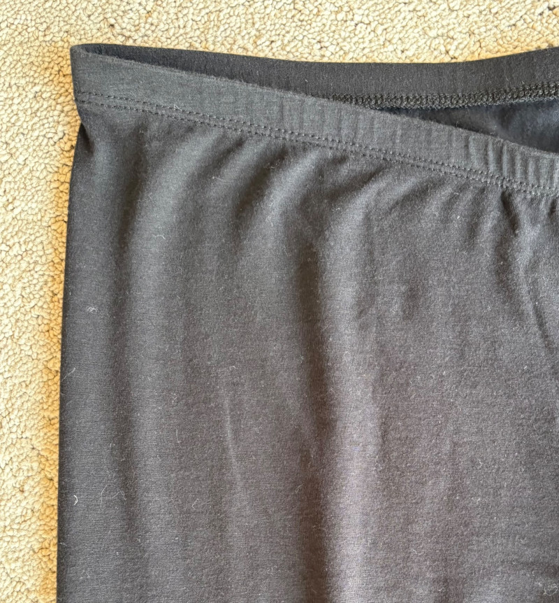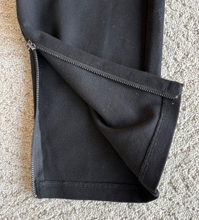 They're all black pants, but all different. All measure 17.5" side to side at waist. Cropped capri leggings from J. Jill are mid-weight, super soft, and tightly woven with lots of stretch. Cotton/spandex blend. Size tag says XL. Lightweight cropped leggings from Eileen Fisher are super stretchy and quite thin. Organic cotton/spandex blend. Size tag says XL. Black super light pants from Eileen Fisher have wide waistband with hidden elastic band inside, front pleats. set-in front pockets, and ribbed cuffs. Hemp/cotton/organic cotton/spandex blend. Size tag says L. Smooth pants (feel like good quality ponte) from Eileen Fisher are very plain but versatile with hidden elastic waistband, tapered legs, knee seams, and zippers at ankle. Viscose/nylon/spandex blend. Size tag says L.