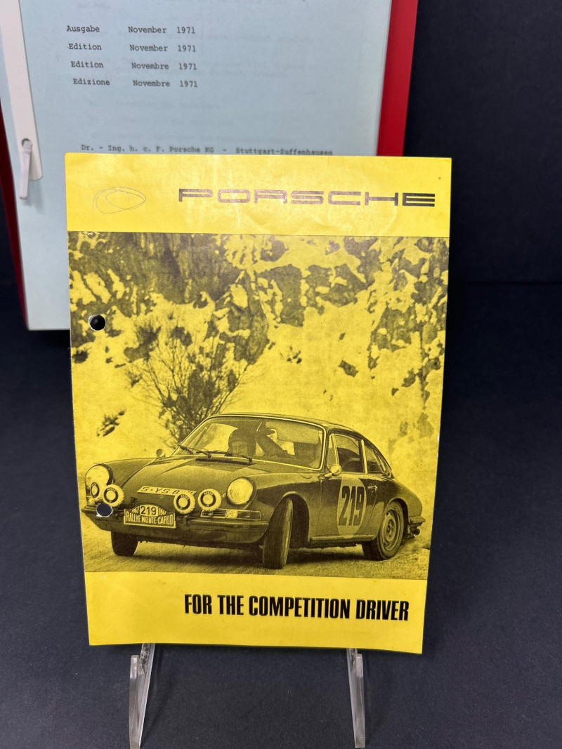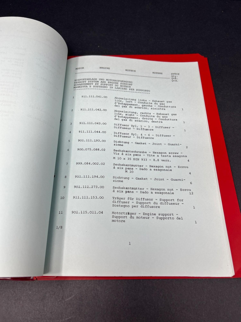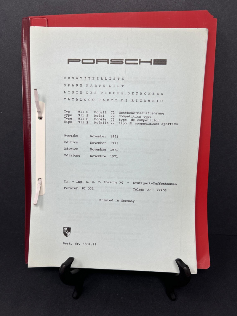 • Typ 911 Modell S 73 Tipo di competizione sportivo Edition Date: November 1971 Issued By: Dr.-Ing. h.c. F. Porsche KG – Stuttgart-Zuffenhausen Document Number: Best. Nr. 6801.14 Format: Multi-language bound catalog with metal fasteners; displayed on stand with red folder