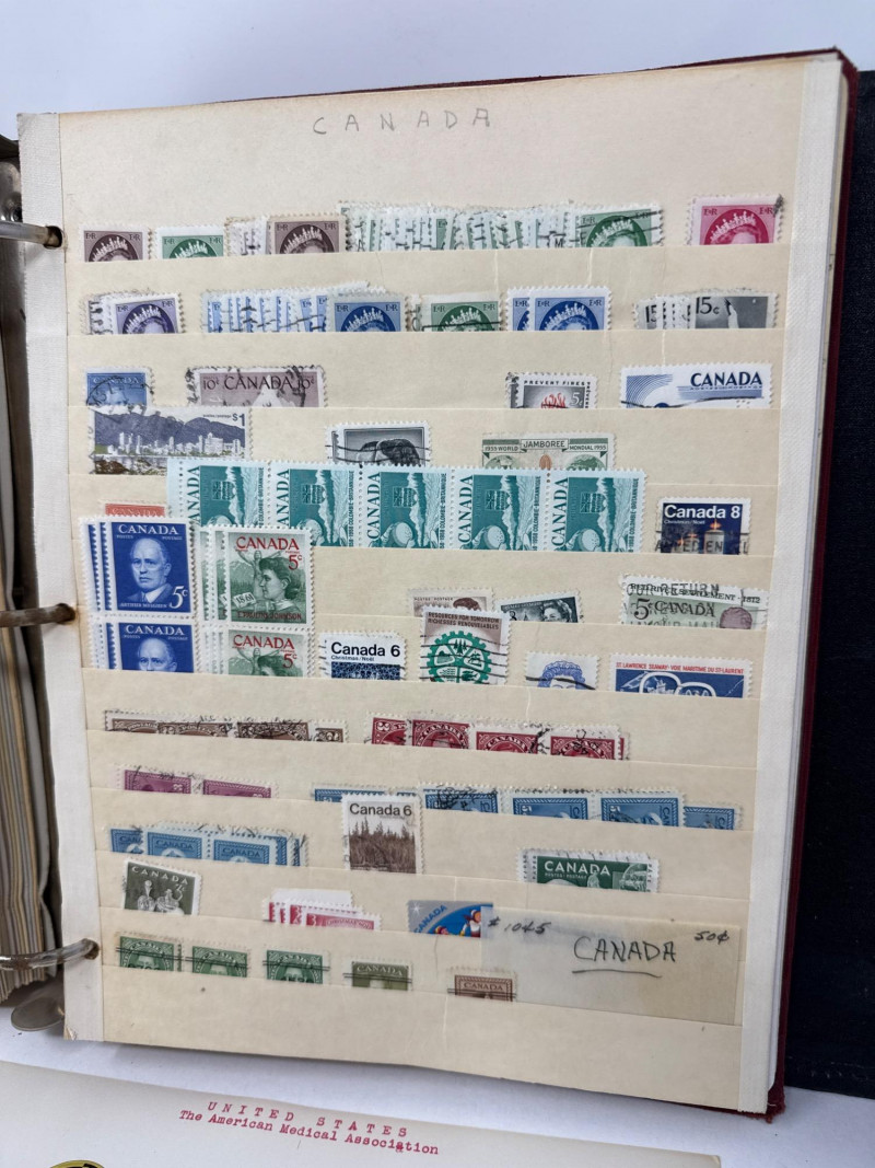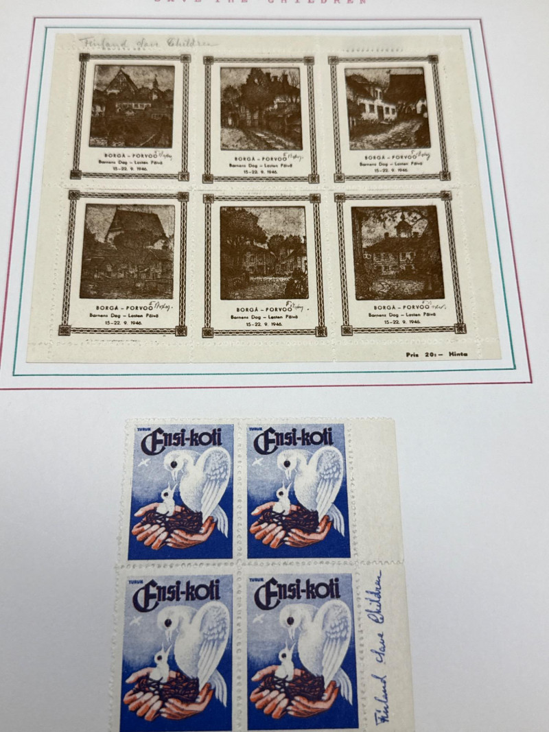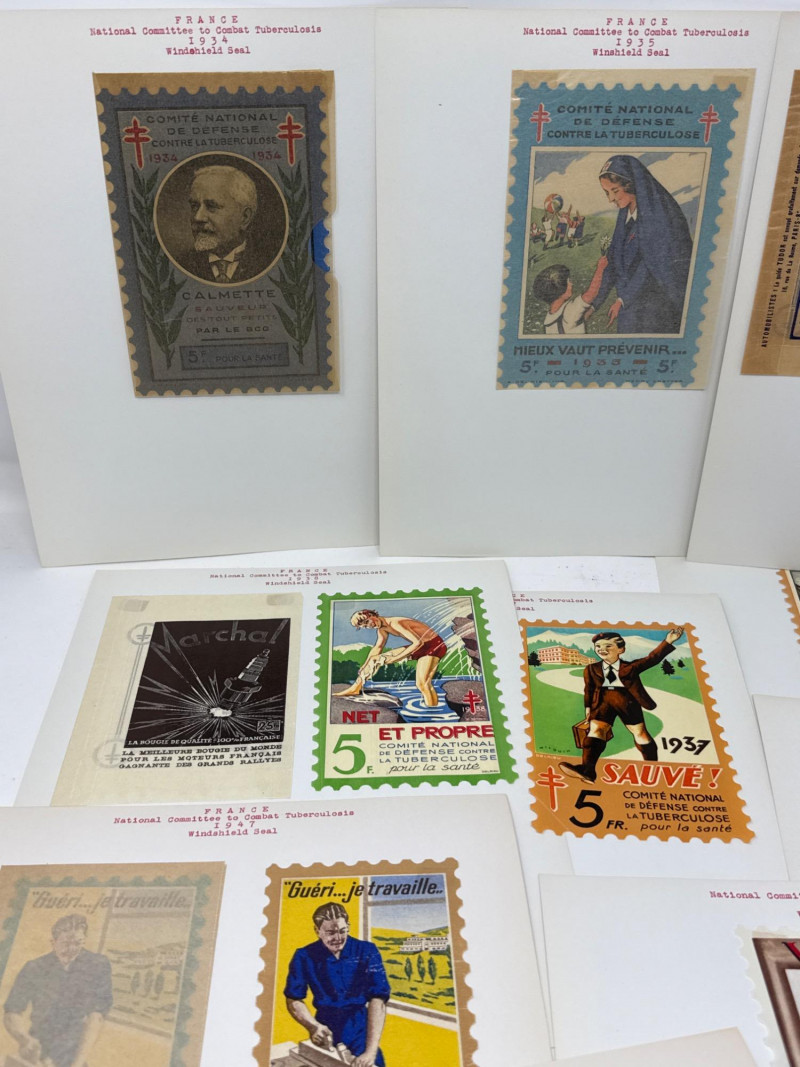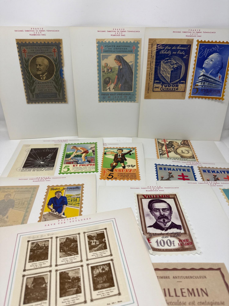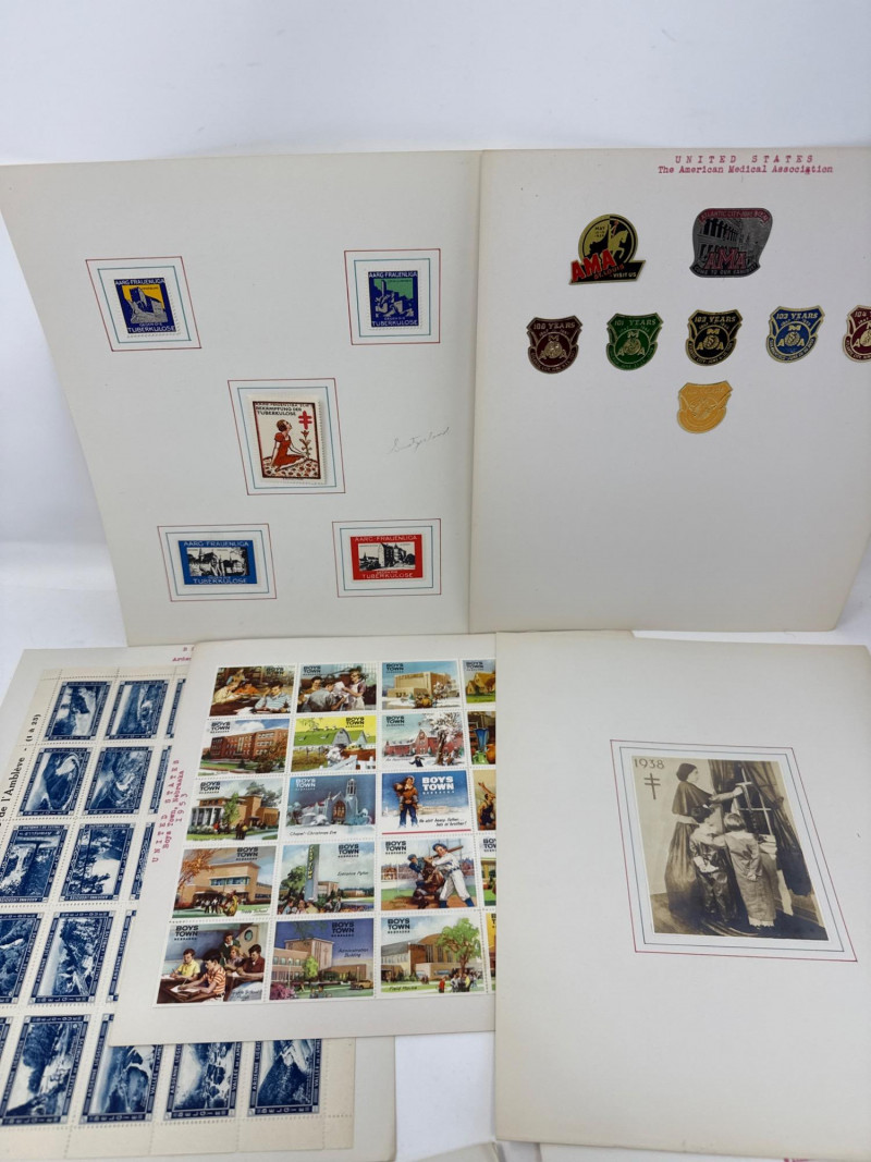 This album bridges traditional philately with social advocacy, showcasing postage stamps and charity seals from across the globe. From mid-century U.S. blocks to European anti-tuberculosis campaigns, each page tells a story. What’s Inside: 🇺🇸 U.S. Stamps: Commemoratives and definitives from the early to mid-1900s, including blocks of four, mint and postmarked, with Scott references. 🇨🇦 Canada: A robust section featuring monarch-themed definitives and commemoratives from multiple decades. 🌍 Charity Seals & Cinderella Gems: French TB “Windshield Seals” (1930s–1950s), with typed annotations. Italian Red Cross-themed seals (1935), full illustrated set of 12. Belgian and French anti-TB campaign labels, bursting with color and graphic charm. Boys Town Nebraska sheets: Heartwarming scenes and the iconic “He Ain’t Heavy…” label. United Nations health-themed postal stationery and commemoratives. Why It Stands Out: Combines philatelic tradition with social history. Full sheets and poster-style seals ideal for display. Rich provenance and thematic appeal for collectors of Red Cross, TB campaigns, and global health. A standout lot for those who value both postal heritage and the stories behind the stamps.
