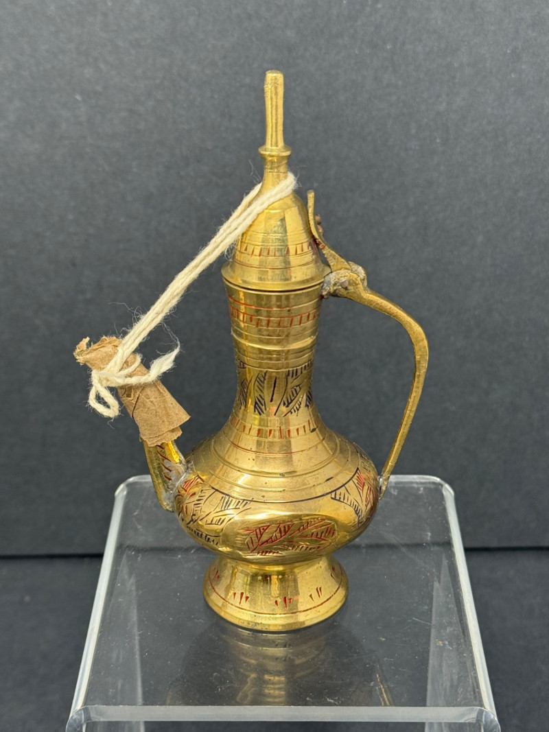 Vintage Brass Decoratives – Miniature Ewers & String of Bells A charming grouping of mid-century brass collectibles featuring finely etched miniature vessels and a set of rustic hanging bells. Perfect for display, bohemian décor, or collectors of global folk art. Included in this collection: Pair of Etched Brass Miniature Ewers Hand-engraved with traditional geometric and floral motifs. Each with hinged lid and slender spout. Height approx. 4.25" – 4.5". Set of 4 Graduated Brass Hanging Bells Cylindrical ribbed form with scalloped edges. Connected with original braided textile cord. Bells range from approx. 1.5" to 2.75" in height. Condition: Collecting Notes: