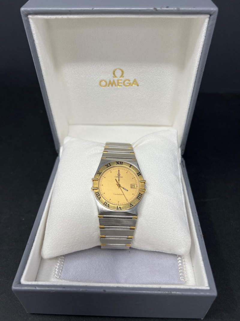 A timeless Omega Constellation wristwatch, complete with its original presentation case, manual insert, and link band. This elegant timepiece features a Roman numeral dial, day viewer, and sweeping second hand. Though it currently requires a new battery, both hands adjust smoothly via independent crown settings. A refined addition for collectors of vintage Swiss horology or those seeking a legacy piece with enduring style. Additional information: face of watch is 1.25" from crown to other side (approx. 3.2 cm). The serial number is 54435767, year 1993 or 1994. The watch is run on battery. The make is a Constellation. There are two additional links for the band (not shown) - Fits 7" diameter wrist at this time. Potentially stainless steel with solid gold bezel (see this vintage Omega info).