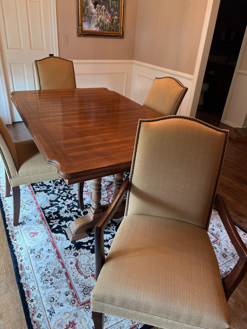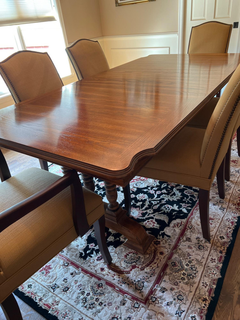 An elegant dining room ensemble featuring a richly crafted table and six high-back padded chairs from Designer Furniture Inc. The table showcases a trio of turned wood posts at each end, supporting a smooth rectangular top with warm wood grain and classic lines. Includes one 18" wide leaf for extended seating and a full set of custom protector pads. The chair set includes two captain chairs and four side chairs, each upholstered in neutral fabric with studded trim detailing. The high backs and generous padding offer comfort and sophistication, ideal for formal gatherings or everyday luxury. A stunning dining presentation. Dimensions: Table: 66" L x 41" W x 29" H (extends to 84" with leaf) Chairs: 39" H x 20" W x 27" D
