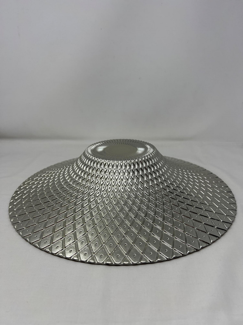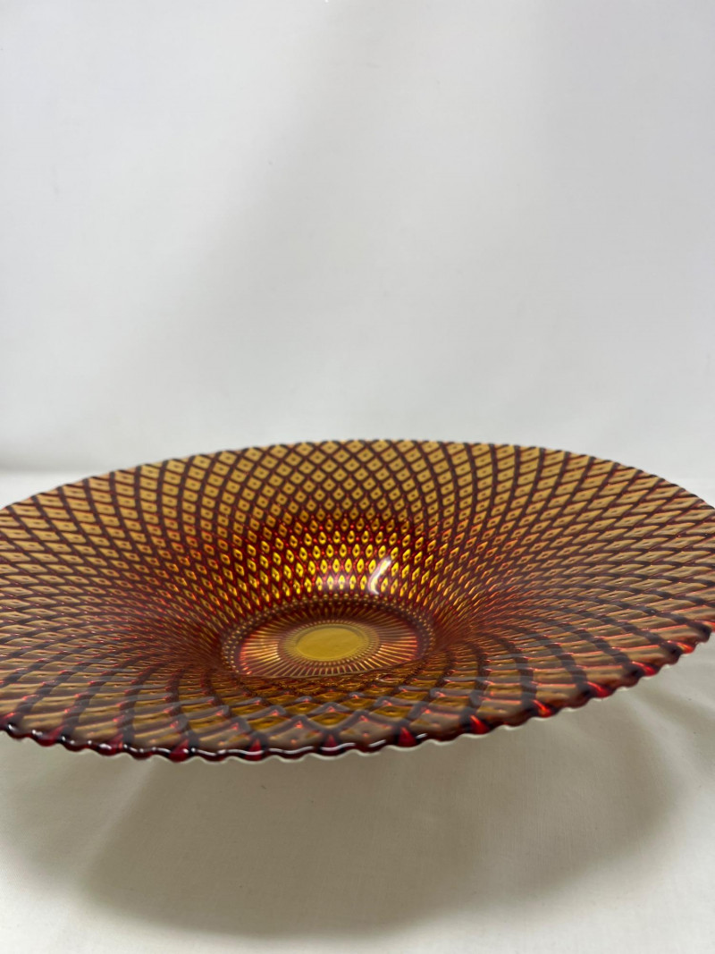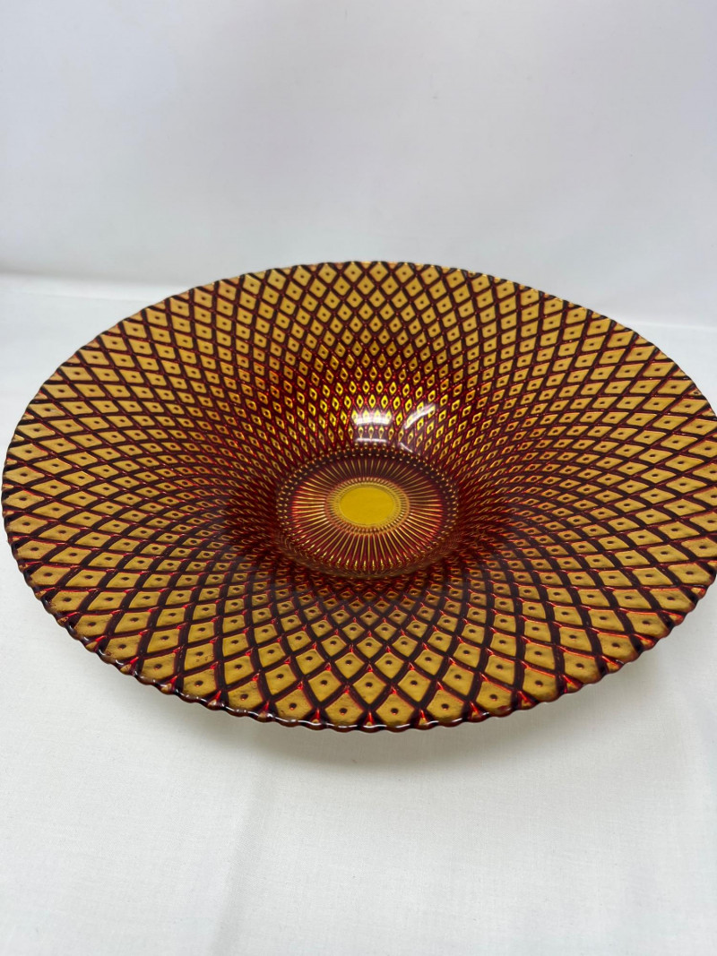 A warm-toned glass bowl with a diamond-cut pattern that catches light like a memory. Its sculptural form and vintage charm make it a versatile accent—whether anchoring a tablescape or adding quiet glamour to a shelf. This piece evokes mid-century hospitality and the golden hour glow of a well-set room. Ideal for collectors who favor texture, translucence, and timeless design.