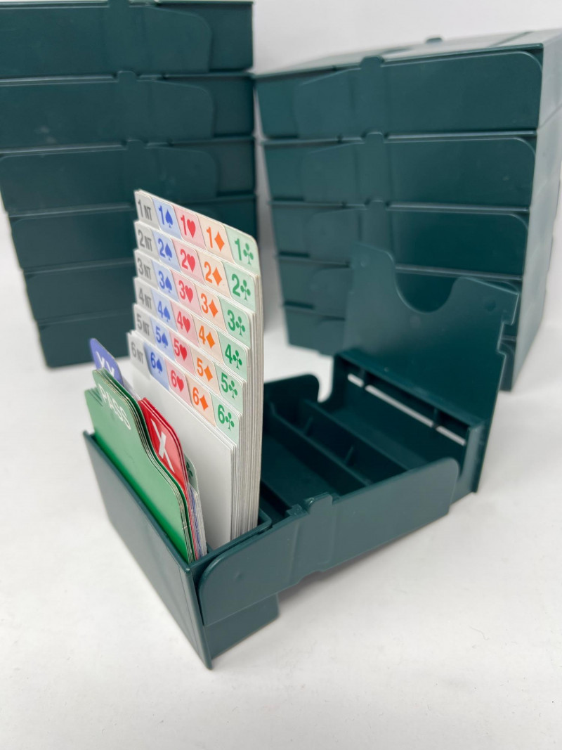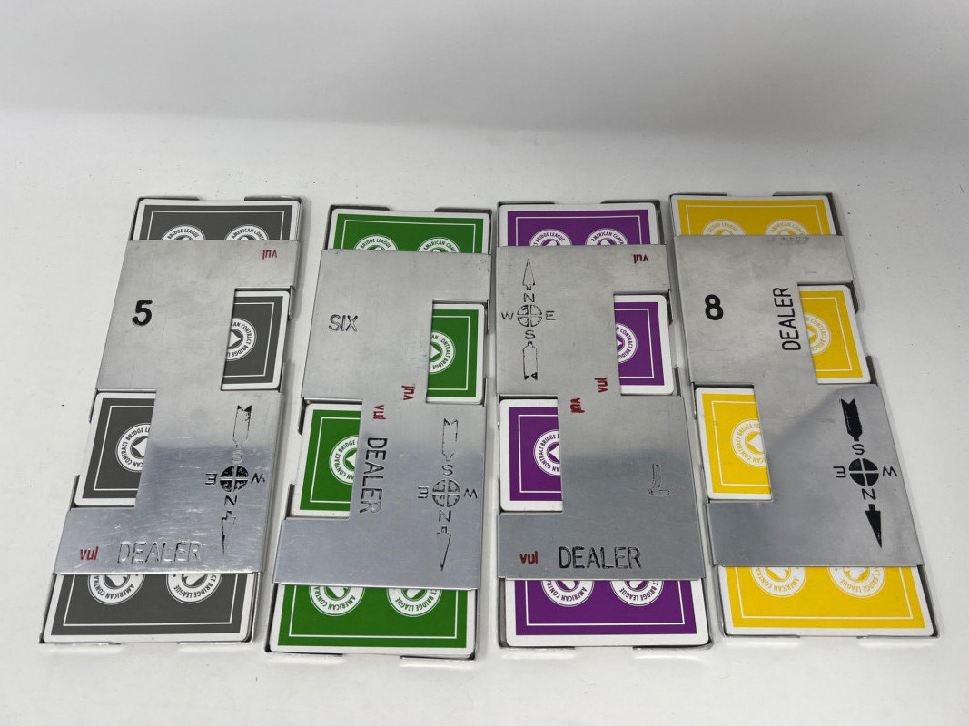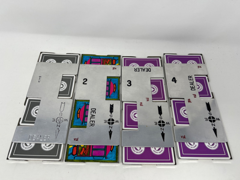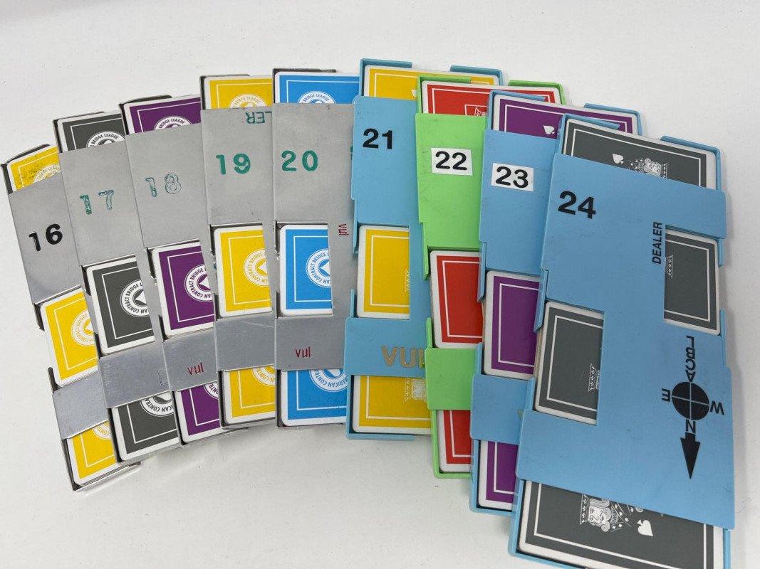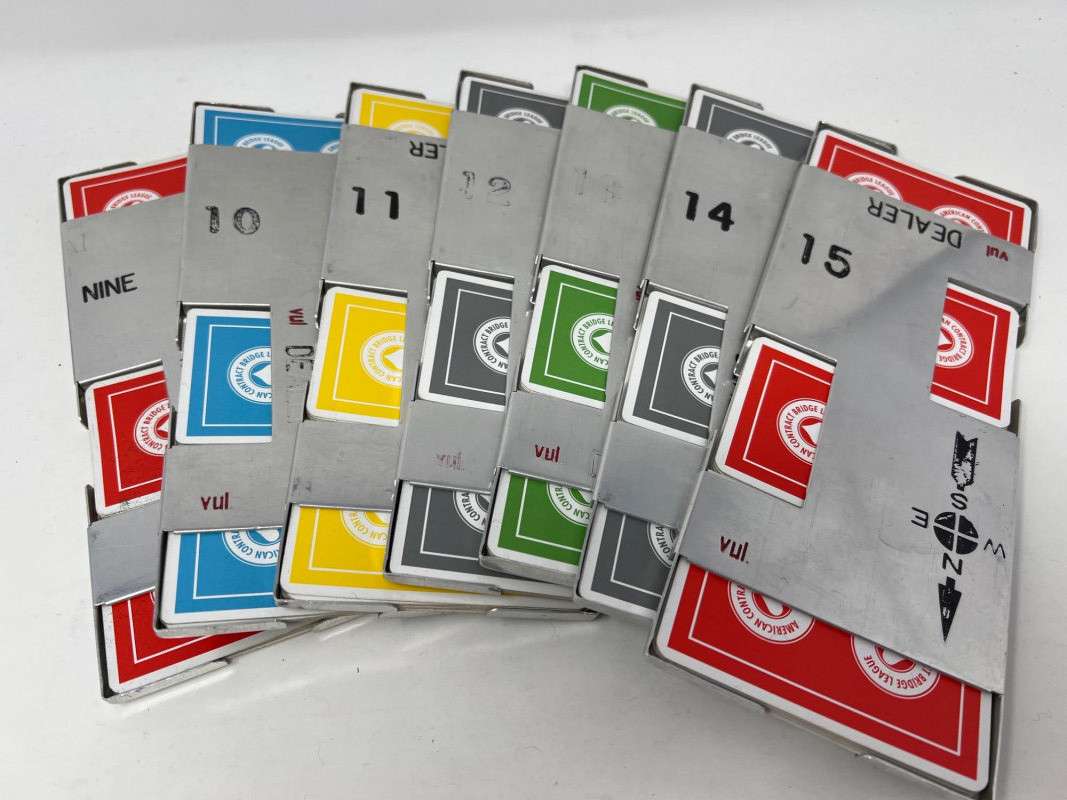 A complete vintage contract bridge set designed for tournament or teaching use. Includes 12 plastic card holders, each containing pre-sorted hands from decks numbered 1 through 23. Ideal for duplicate bridge play, where identical hands are used across tables to test skill and strategy. This set evokes the golden age of bridge clubs and competitive play, offering both nostalgia and utility for collectors, instructors, or enthusiasts.