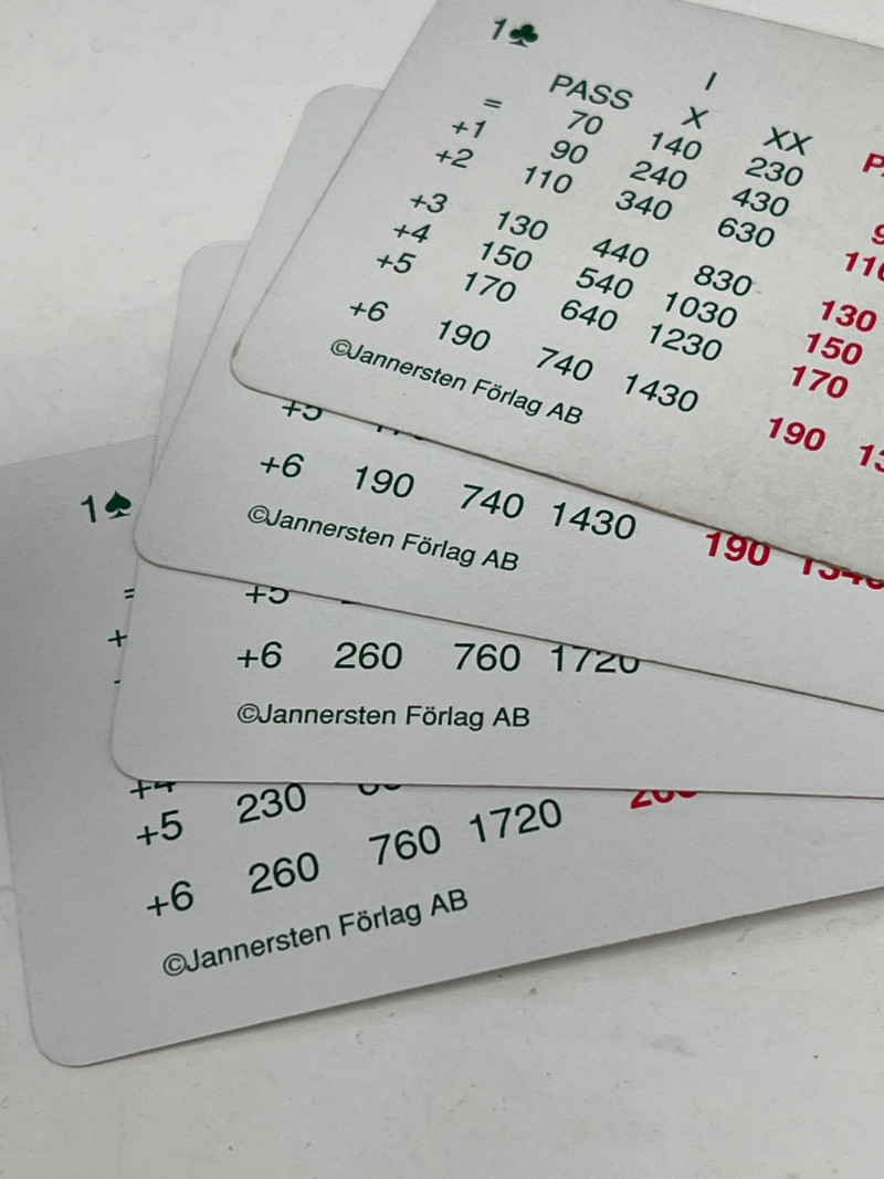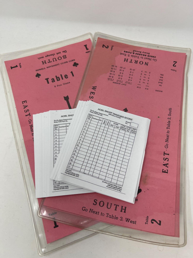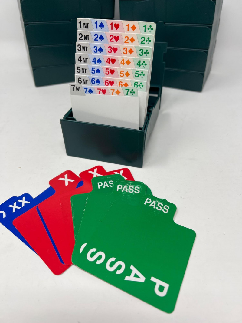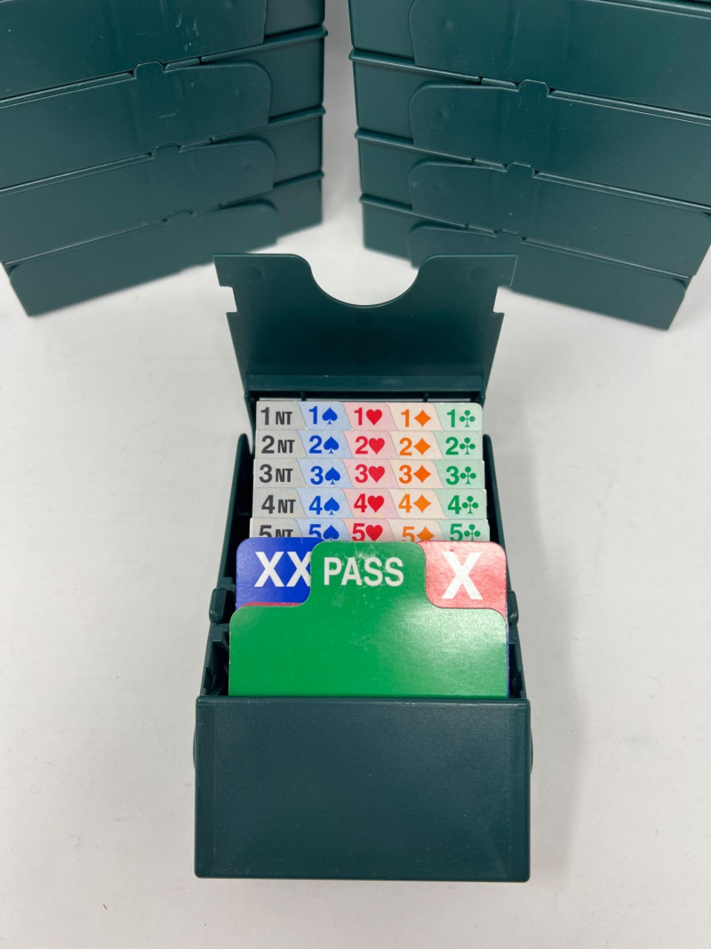 A complete vintage contract bridge set designed for tournament or teaching use. Includes 12 plastic card holders, each containing pre-sorted hands from decks numbered 1 through 23. Ideal for duplicate bridge play, where identical hands are used across tables to test skill and strategy. This set evokes the golden age of bridge clubs and competitive play, offering both nostalgia and utility for collectors, instructors, or enthusiasts.