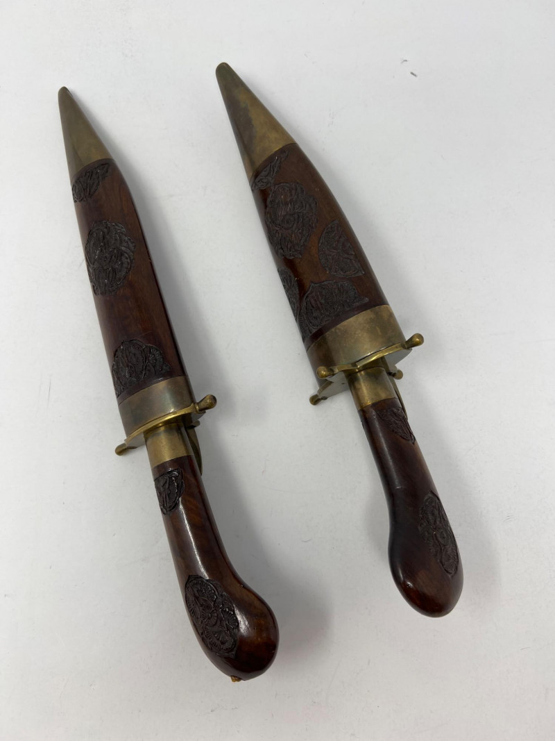 A rare and evocative pairing of knife and fork, each housed in its own hand-carved wooden sheath and adorned with warm brass fittings. Crafted in India, this set likely dates to the early 20th century and reflects ceremonial craftsmanship and colonial-era elegance. The intricate carvings and aged patina speak to its journey through time—an ideal addition for collectors of global artifacts or vintage dining traditions.