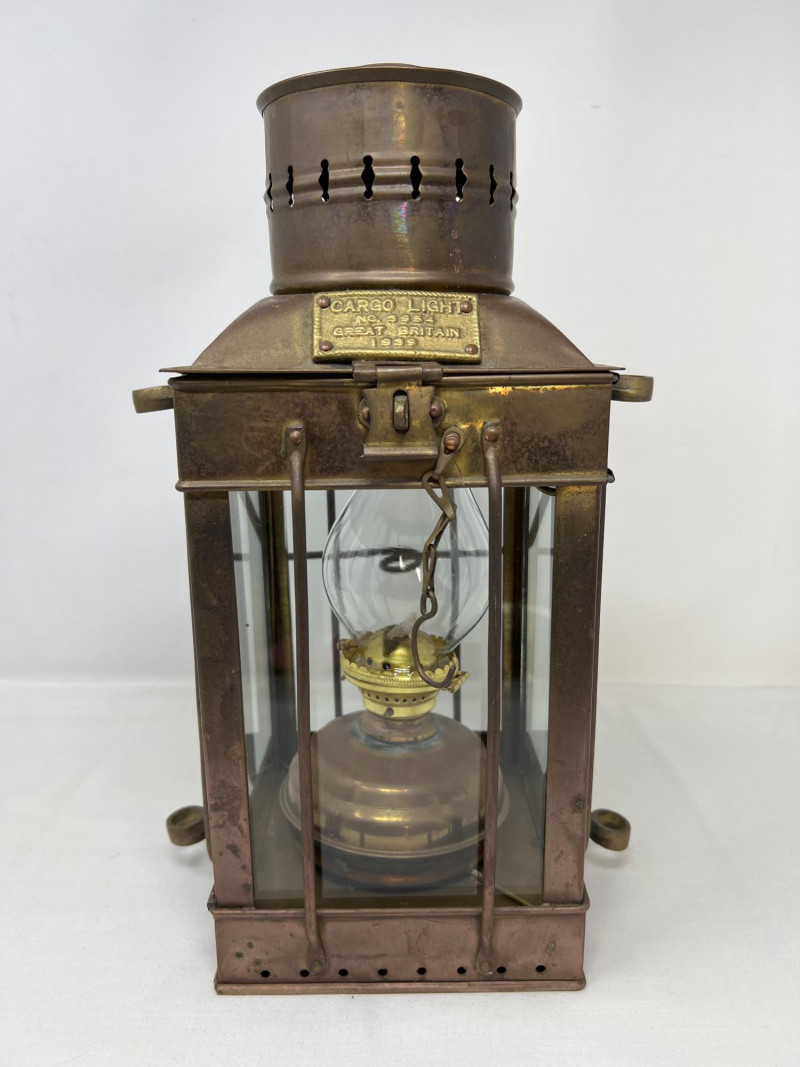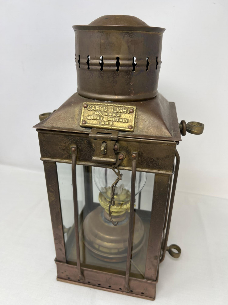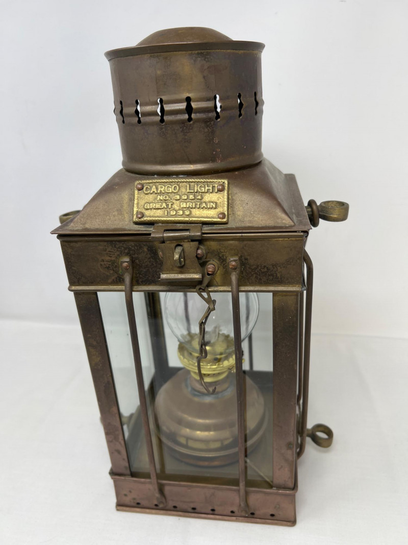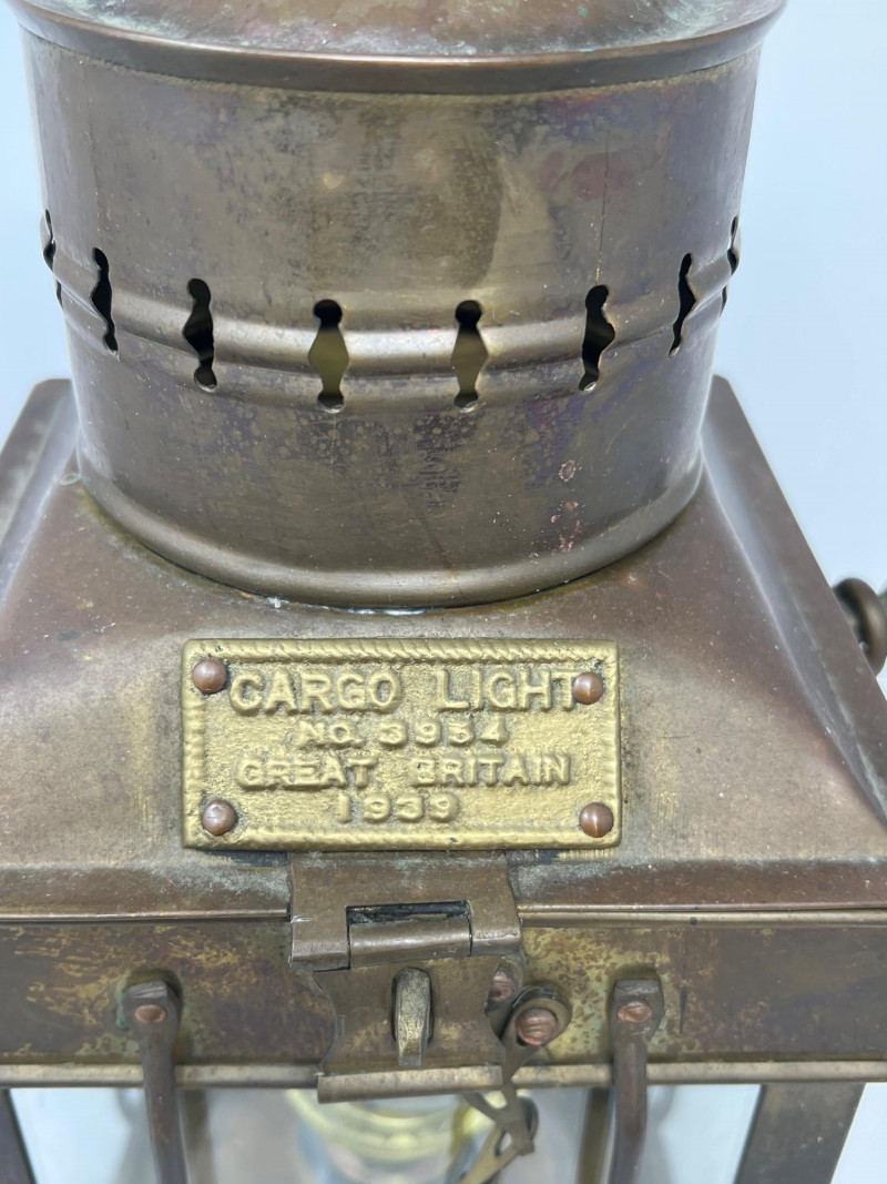 A rare 1939 cargo light from Great Britain, showcasing utilitarian design from the WWII era. This piece blends industrial character with historical significance—ideal for collectors of military artifacts or vintage lighting. Its metal housing and patina reflect decades of service and preservation. Whether displayed as a conversation piece or repurposed for ambient lighting, it offers a tangible link to wartime craftsmanship. This specific lantern with the mark "Cargo Light No. 3954 Great Britain 1939" is a remarkable piece of nautical history. They were widely used on British ships and used to illuminate cargo holds, decks, and general shipboard work where reliable, rugged light sources were necessary. Built to endure the harshest sea conditions, this lantern stands as a prized artifact of early 20th-century maritime innovation and resilience.