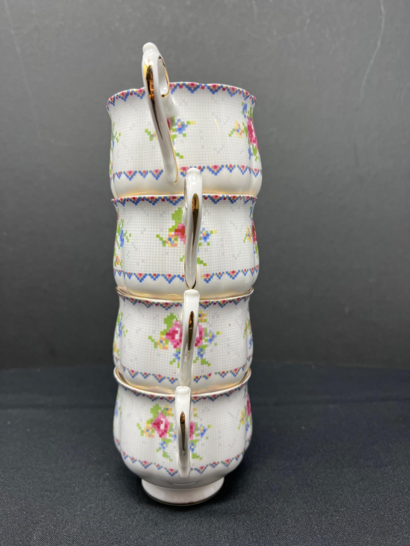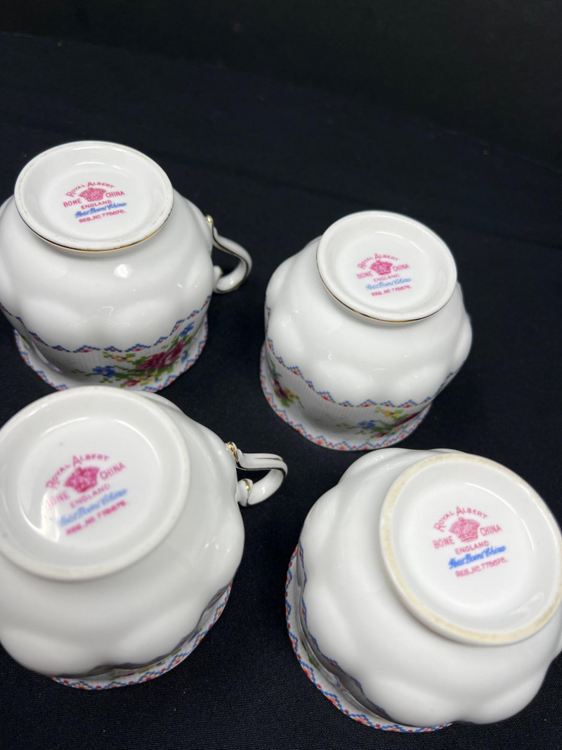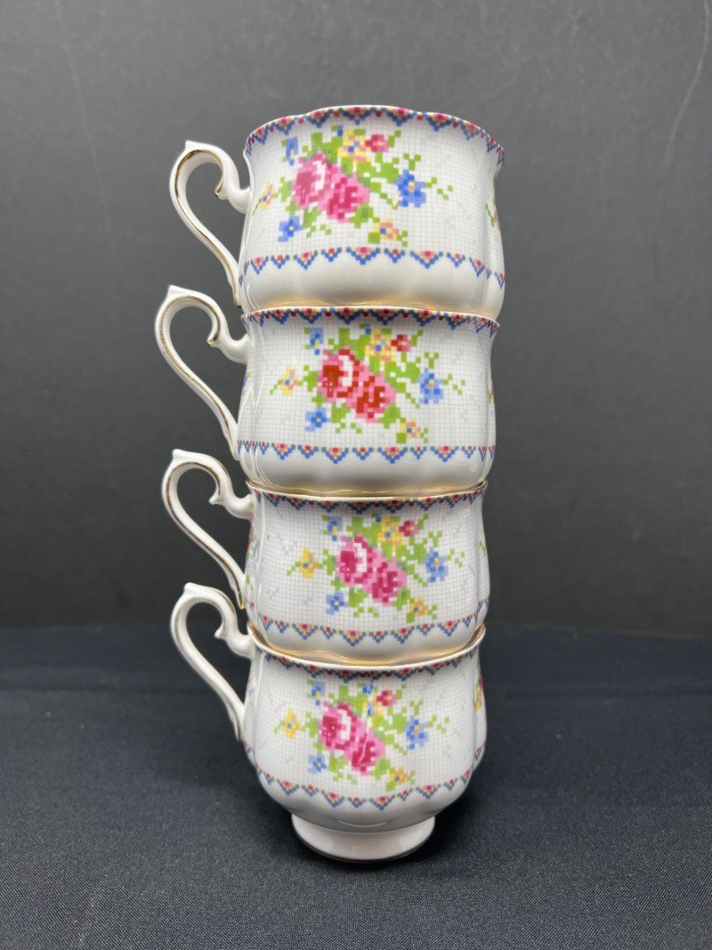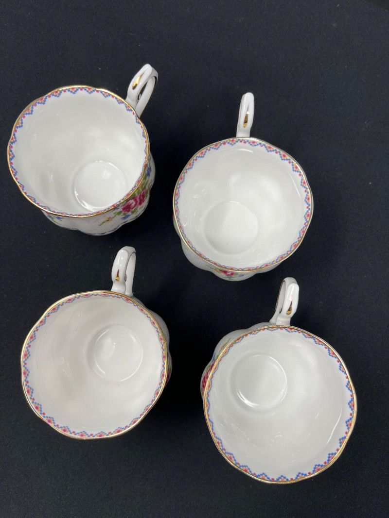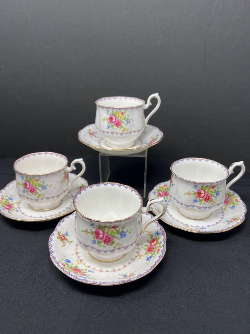 A set of four Royal Albert bone china tea cups and saucers, each adorned in the beloved Petit Point pattern (Reg. No. 778676). Inspired by vintage embroidery, this design mimics delicate cross-stitch florals in soft pinks, reds, greens, and blues—framed by geometric borders and finished with elegant gold trim. Crafted in England, the Petit Point pattern was introduced in the 1940s and remains a favorite among collectors for its nostalgic charm and textile-inspired artistry. The cups feature scalloped edges and ornate handles, making them ideal for display, afternoon tea, or heirloom gifting.