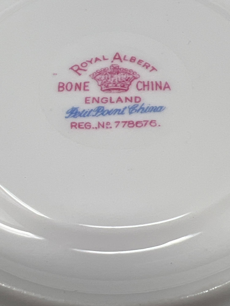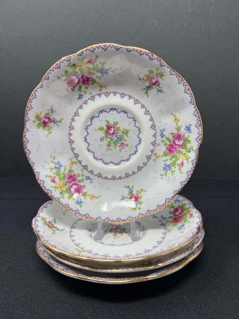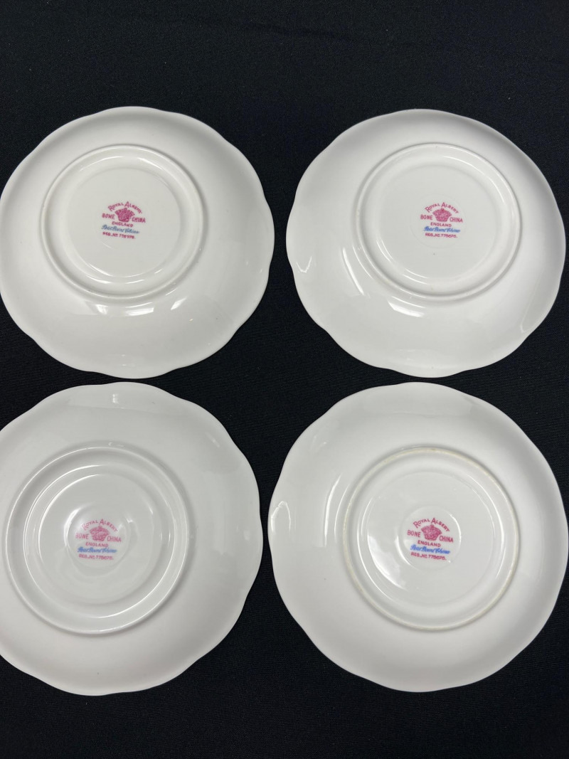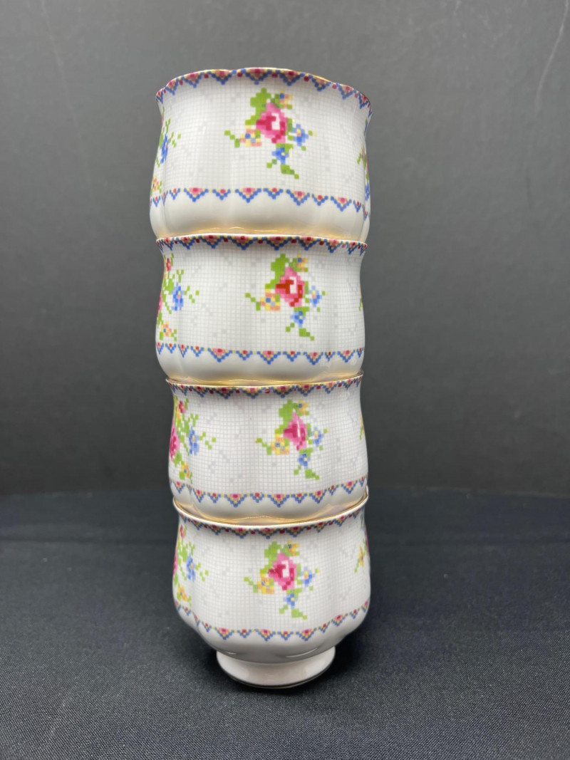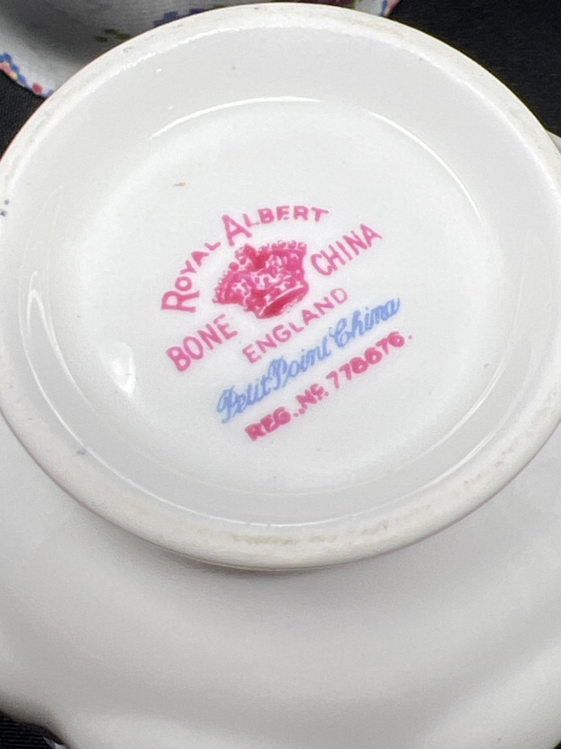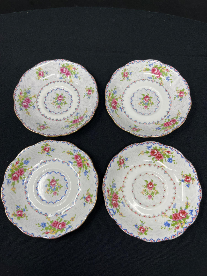 A set of four Royal Albert bone china tea cups and saucers, each adorned in the beloved Petit Point pattern (Reg. No. 778676). Inspired by vintage embroidery, this design mimics delicate cross-stitch florals in soft pinks, reds, greens, and blues—framed by geometric borders and finished with elegant gold trim. Crafted in England, the Petit Point pattern was introduced in the 1940s and remains a favorite among collectors for its nostalgic charm and textile-inspired artistry. The cups feature scalloped edges and ornate handles, making them ideal for display, afternoon tea, or heirloom gifting.