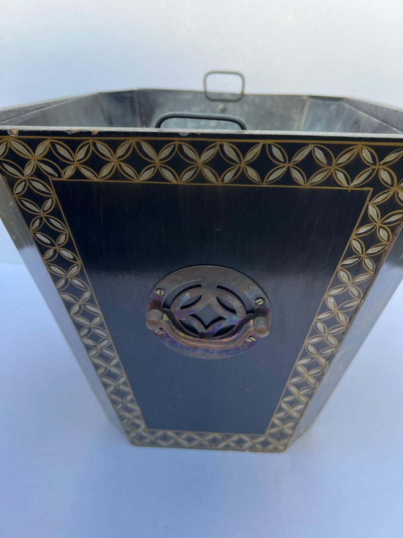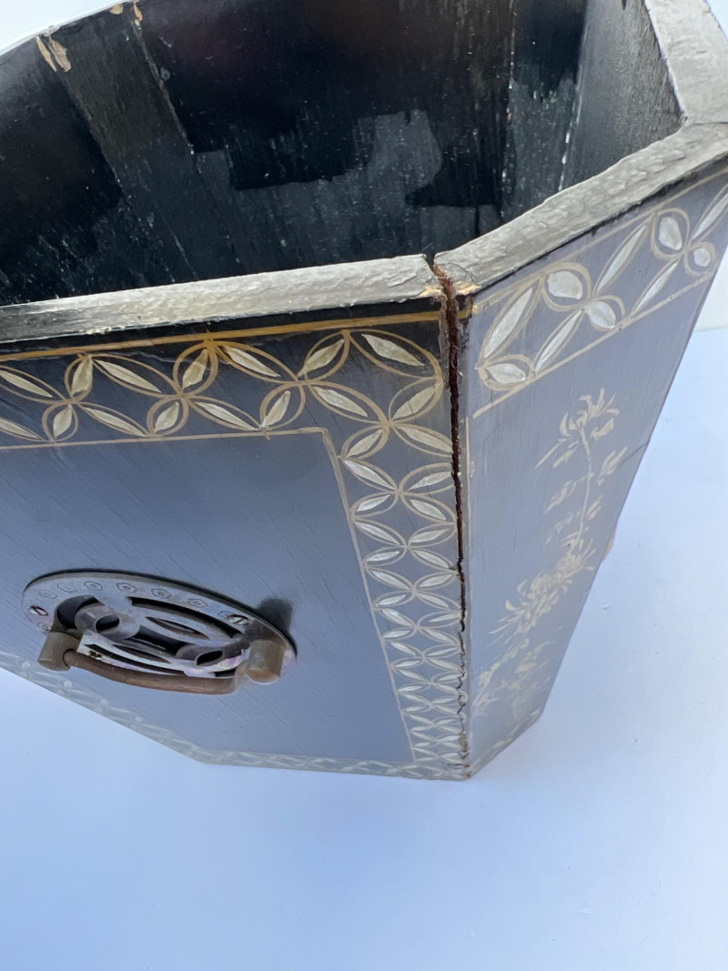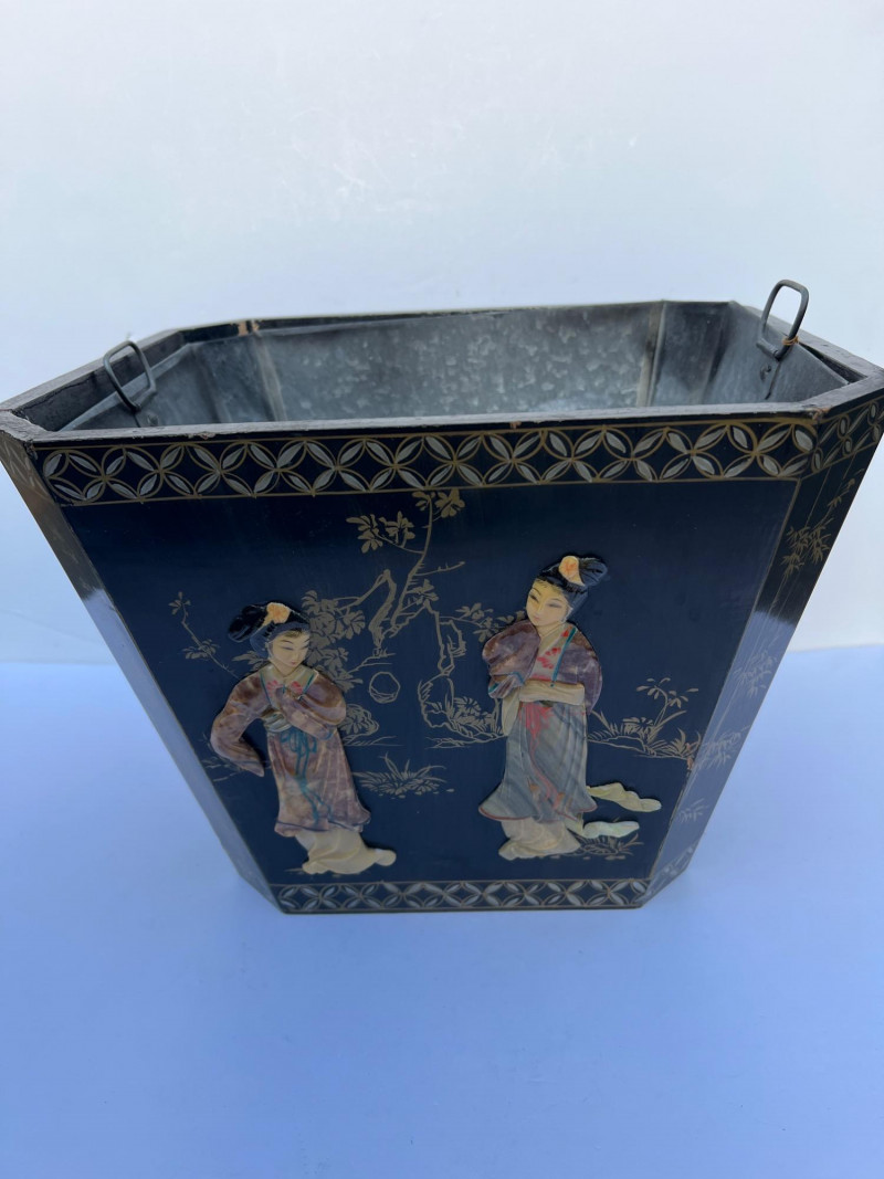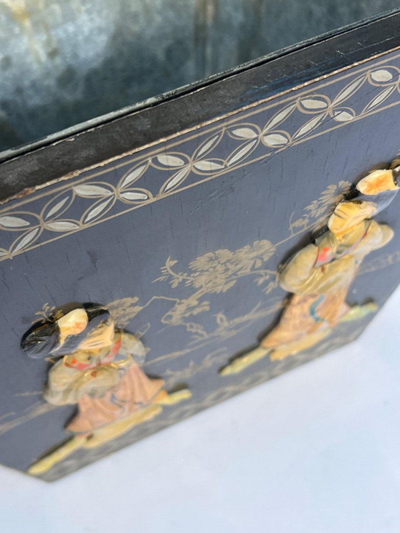 An elegant octagonal wooden planter box finished in rich black lacquer, adorned with polychrome figural and floral ornamentation in the classic Chinoiserie style. The applied decoration evokes scenes of courtly life and garden serenity, rendered in warm tones that contrast beautifully against the lacquered surface. Inside, a galvanized metal liner offers practical use while preserving the integrity of the wood. This planter reflects the influence of Chinese export decorative arts, which captivated European and American collectors throughout the 19th and 20th centuries. Though one corner shows slight separation, the piece remains intact and visually striking. Similar examples have sold on Chairish and Etsy in the $250–$300 range, underscoring its appeal to collectors and decorators alike.