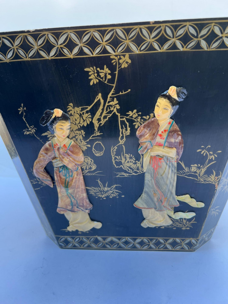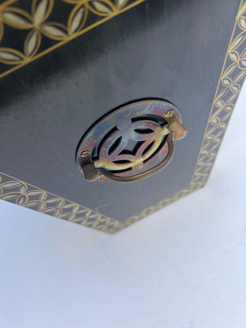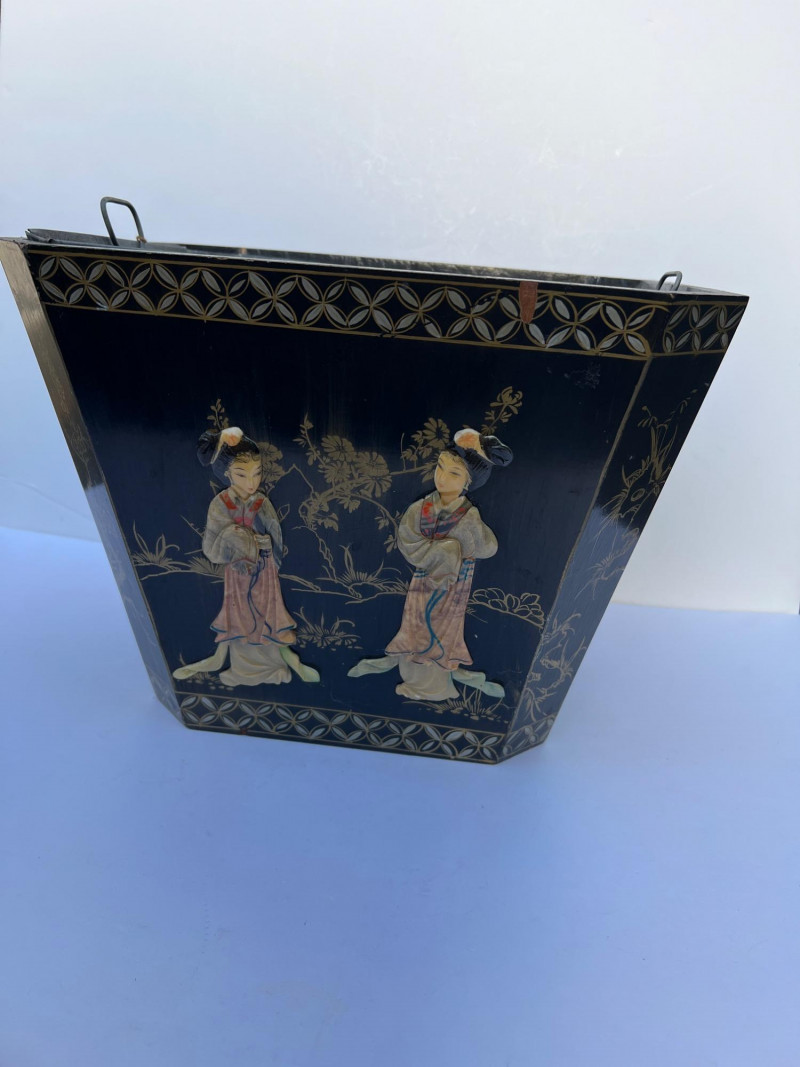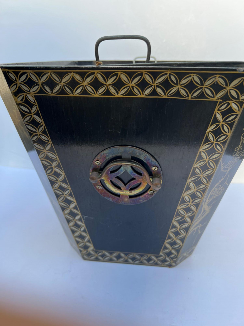 An elegant octagonal wooden planter box finished in rich black lacquer, adorned with polychrome figural and floral ornamentation in the classic Chinoiserie style. The applied decoration evokes scenes of courtly life and garden serenity, rendered in warm tones that contrast beautifully against the lacquered surface. Inside, a galvanized metal liner offers practical use while preserving the integrity of the wood. This planter reflects the influence of Chinese export decorative arts, which captivated European and American collectors throughout the 19th and 20th centuries. Though one corner shows slight separation, the piece remains intact and visually striking. Similar examples have sold on Chairish and Etsy in the $250–$300 range, underscoring its appeal to collectors and decorators alike.
