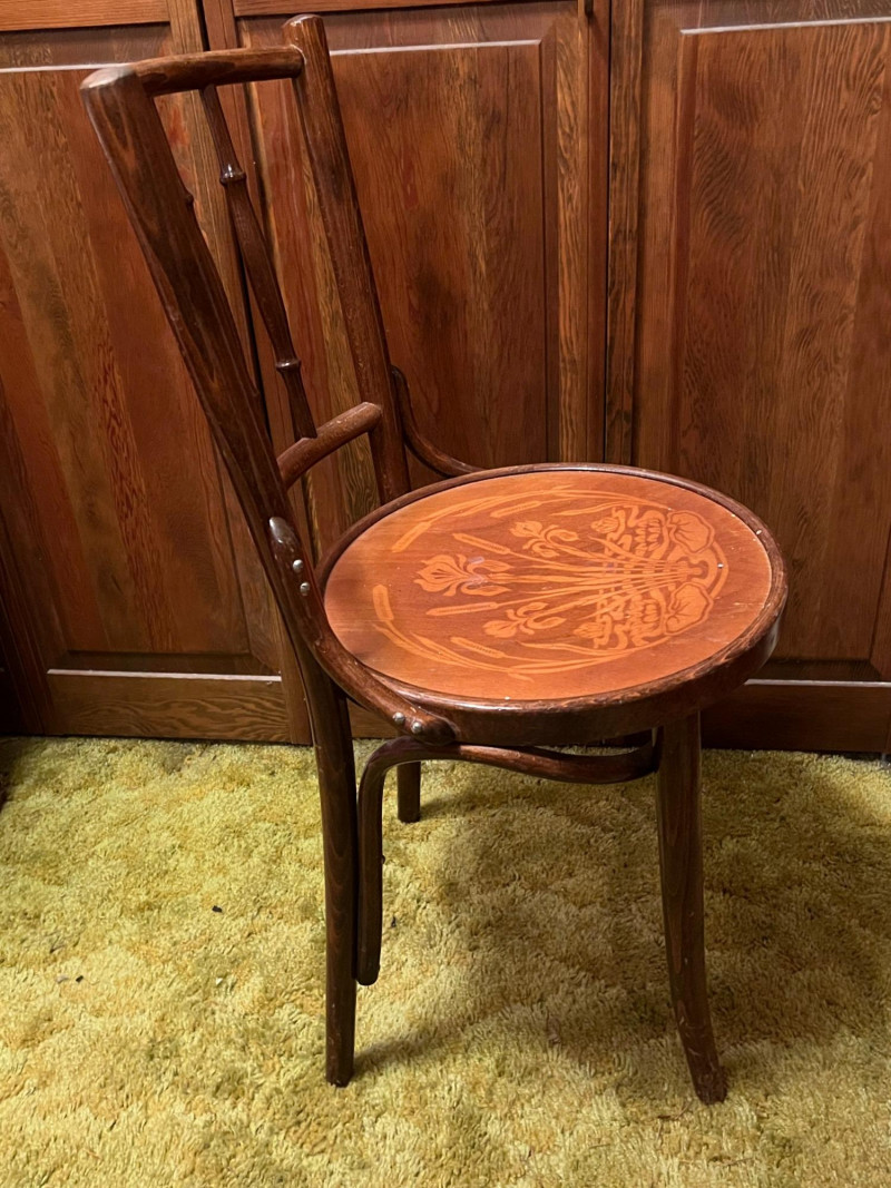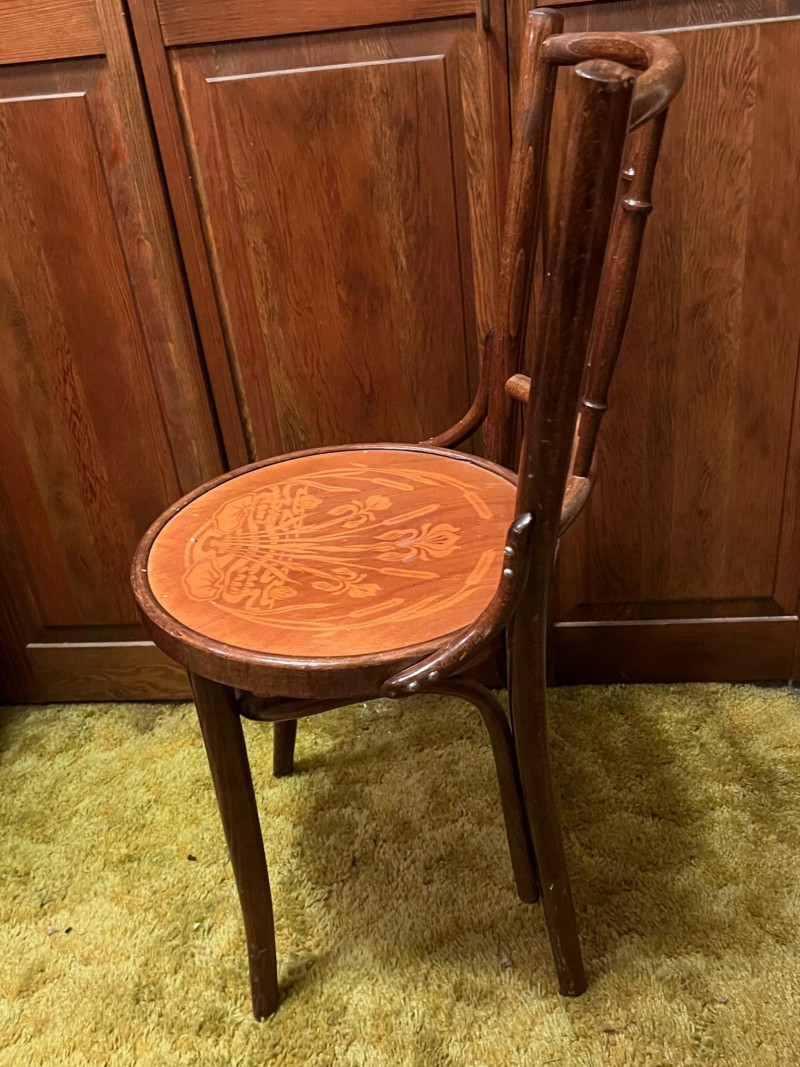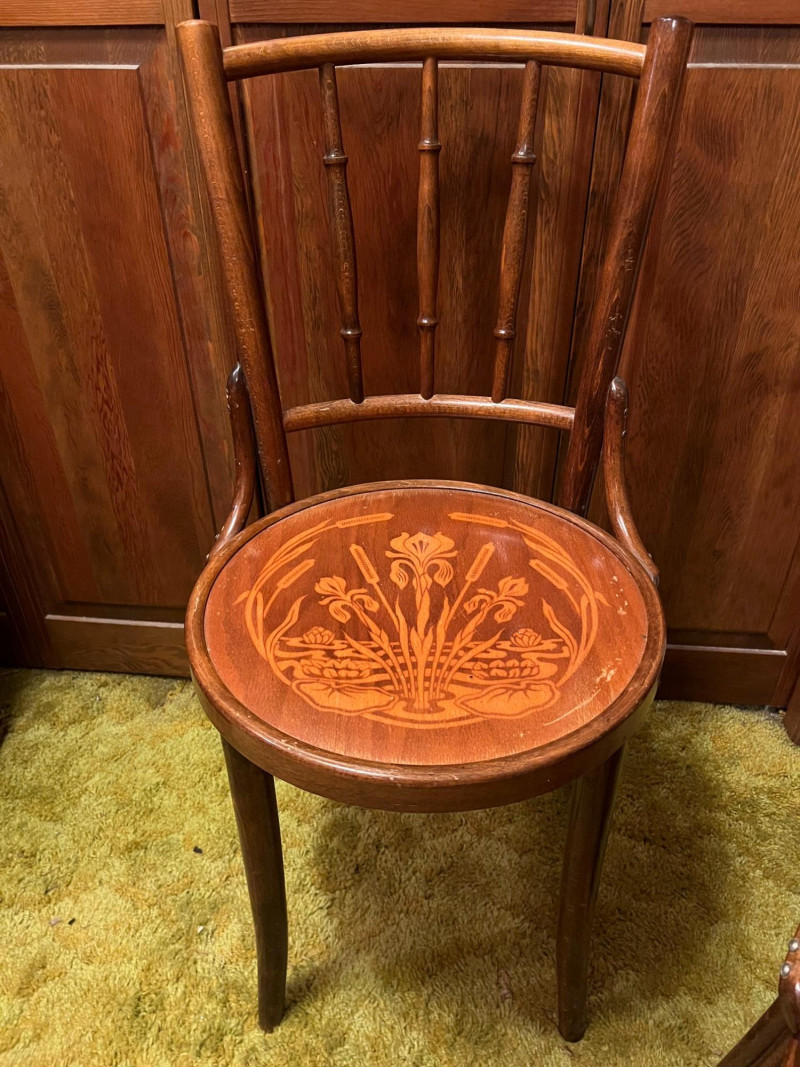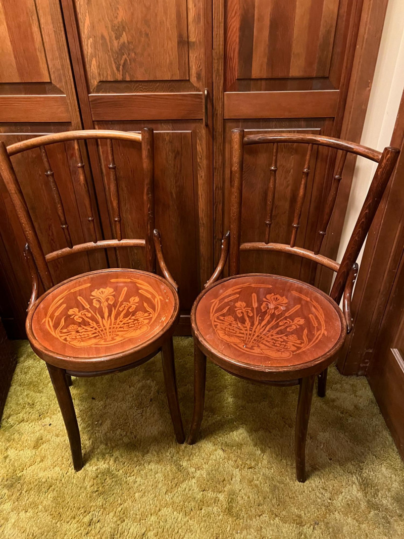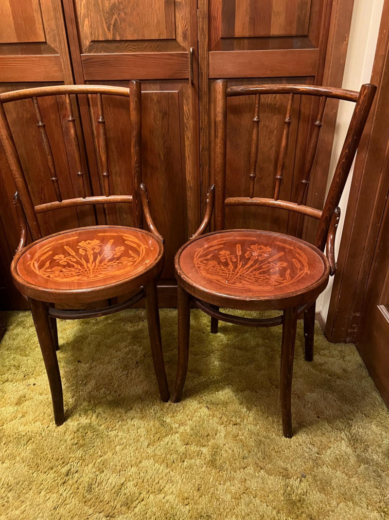 A classic pair of antique bentwood chairs, crafted in the traditional café style associated with early 20th‑century European makers. Each chair features the iconic steam‑bent beechwood frame, graceful curves, and lightweight yet durable construction that made bentwood seating a staple in bistros, parlors, and dining rooms for over a century. Their timeless silhouette and warm wood patina make them ideal for decorators, collectors, or anyone seeking authentic vintage seating with character and charm. Perfect as accent chairs, display pieces, or functional seating in a period‑inspired space.