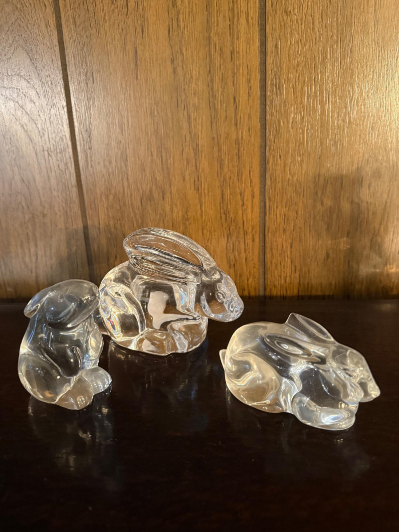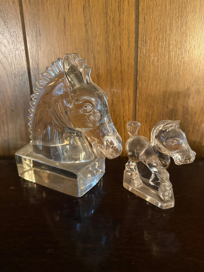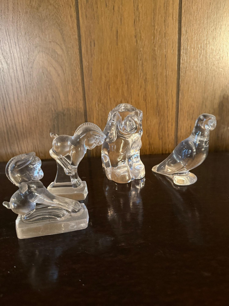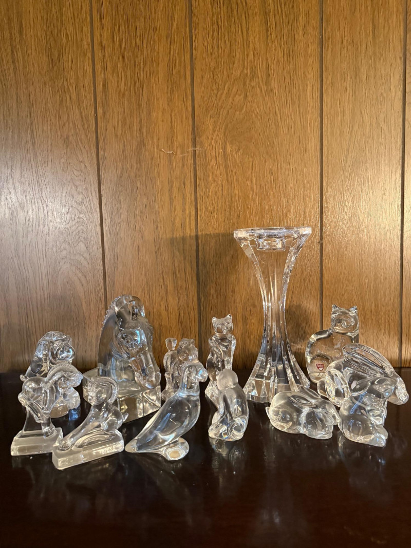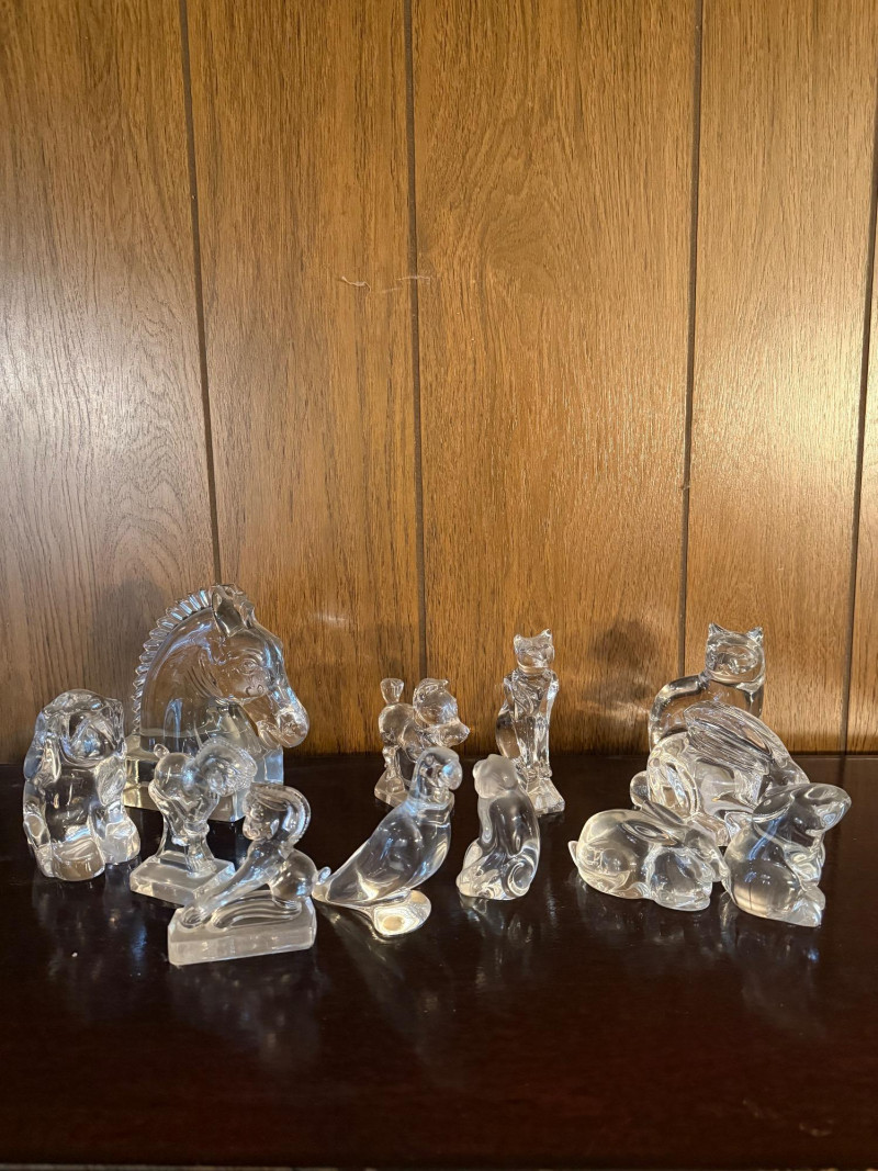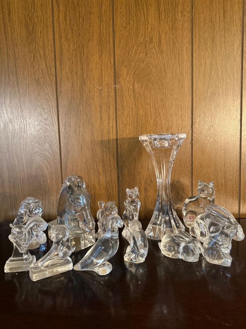 Collection of vintage clear glass animal figurines, each intricately crafted with smooth, light-catching surfaces and detailed features. Included are representations of a lion, owl, elephant, horse, penguin, seal, bird, and more, along with a tall slender vase or candle holder. Several pieces may be branded or collectible, with one retaining its original sticker. Ideal for resellers, decorators, or collectors, this lot offers strong retail potential and visual appeal for display cases, gift shops, or online storefronts. Figures range in sizes- 3.5" - 6.5"