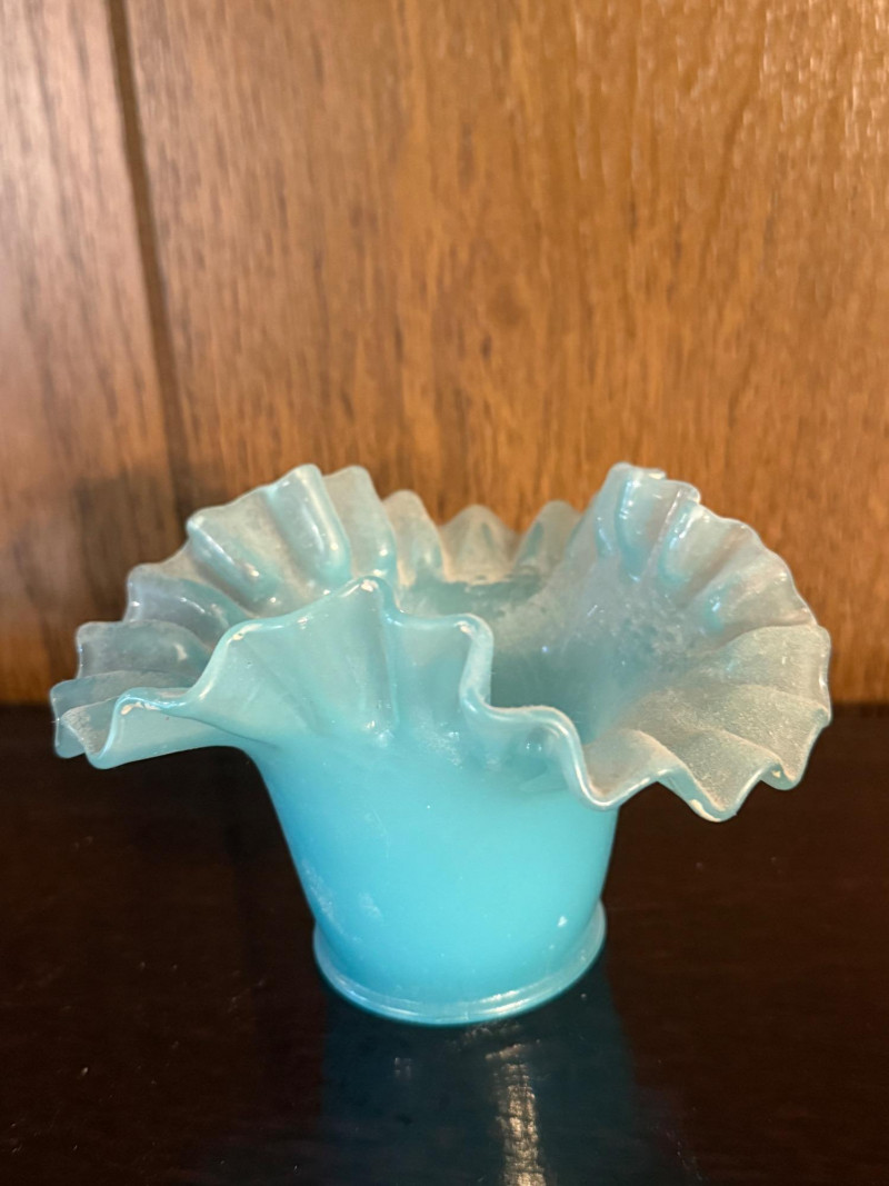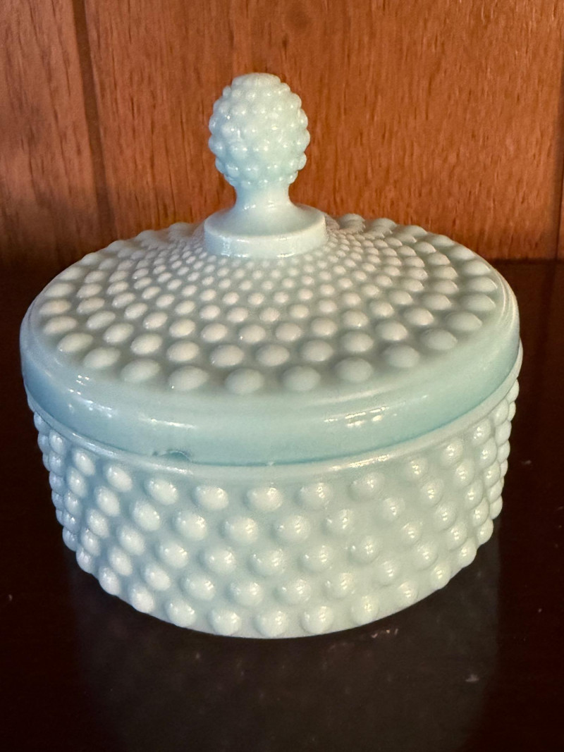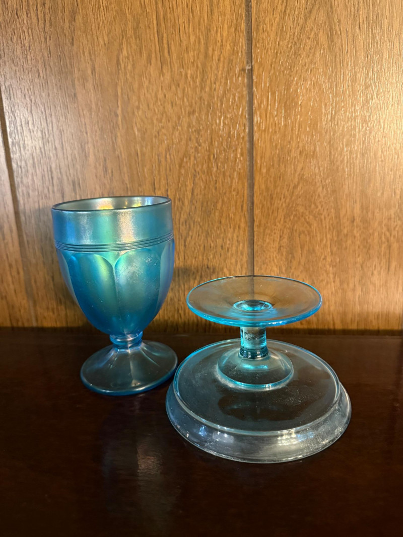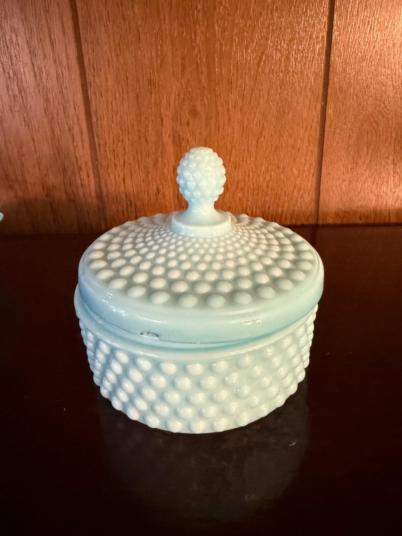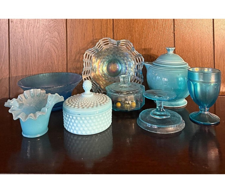 This striking lot showcases a variety of vintage blue glass and pottery tableware, thoughtfully arranged for collectors and resellers. Included are: A Fenton-style hobnail lidded jar A ruffled edge vase, likely mid-century Fenton or similar A pedestal candy dish and goblet A lidded urn and footed bowl A geometric iridescent vase or compote, adding visual contrast and shimmer The collection blends textured hobnail patterns, opalescent finishes, and classic mid-century silhouettes, making it ideal for resale, display, or vintage décor. Each piece reflects the craftsmanship and charm of American glassmaking traditions, with shades ranging from cobalt to colonial blue.