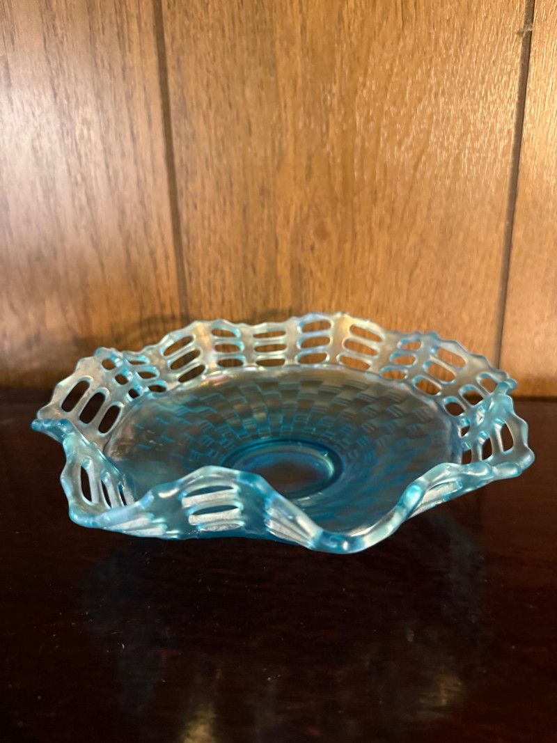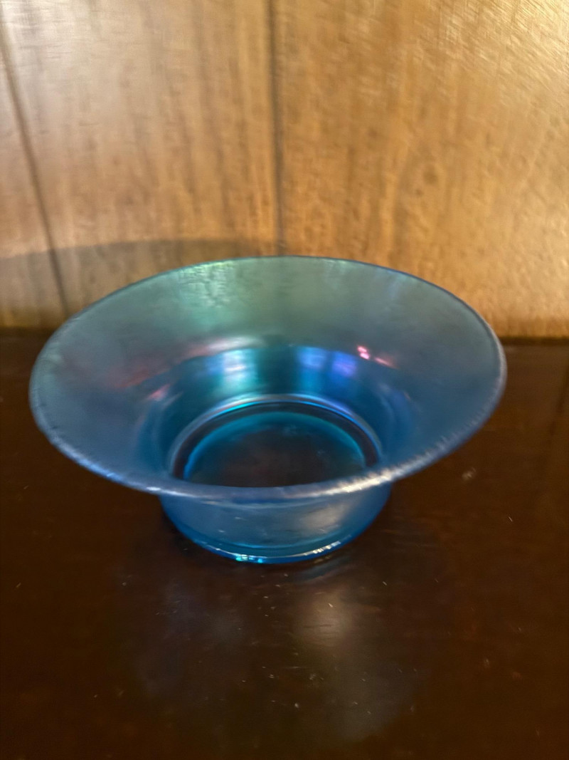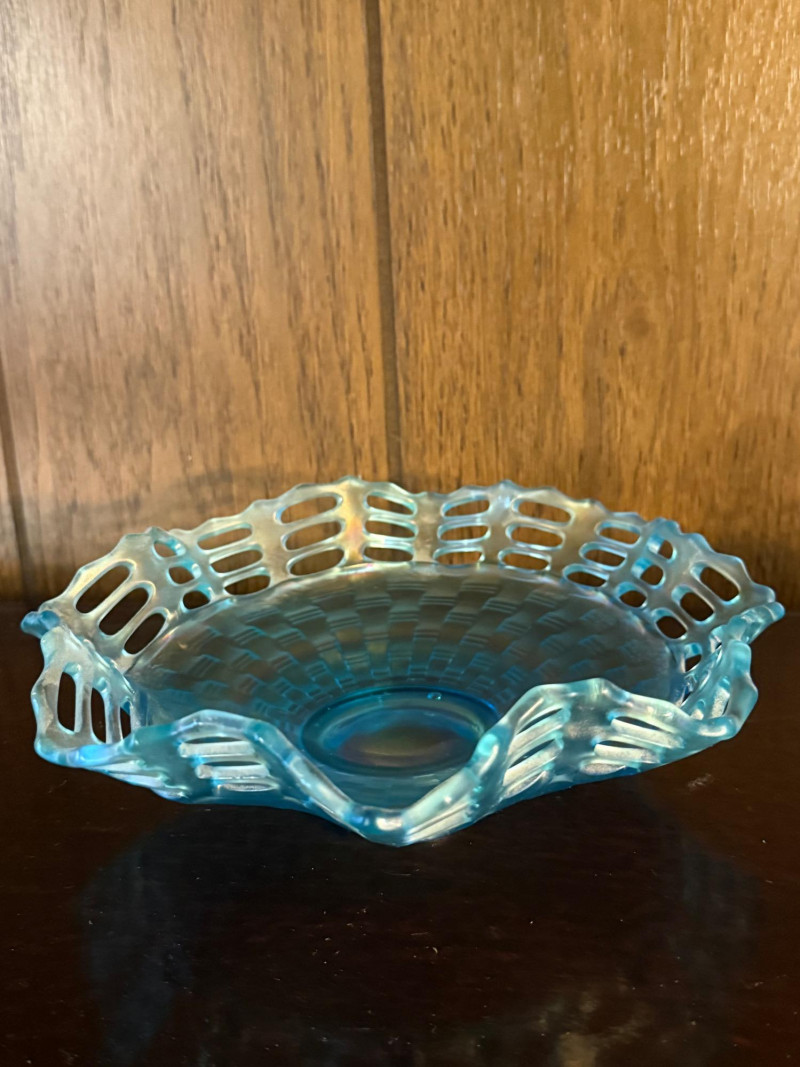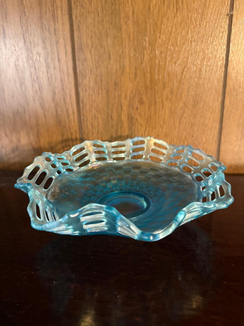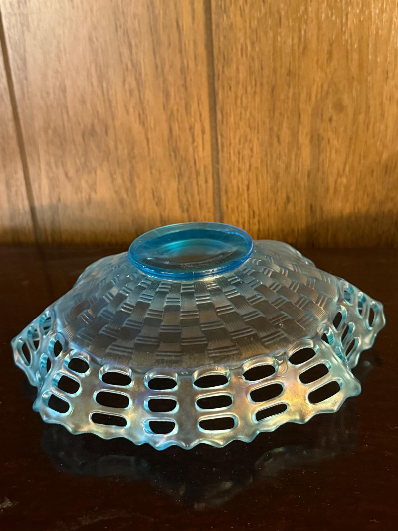 This striking lot showcases a variety of vintage blue glass and pottery tableware, thoughtfully arranged for collectors and resellers. Included are: A Fenton-style hobnail lidded jar A ruffled edge vase, likely mid-century Fenton or similar A pedestal candy dish and goblet A lidded urn and footed bowl A geometric iridescent vase or compote, adding visual contrast and shimmer The collection blends textured hobnail patterns, opalescent finishes, and classic mid-century silhouettes, making it ideal for resale, display, or vintage décor. Each piece reflects the craftsmanship and charm of American glassmaking traditions, with shades ranging from cobalt to colonial blue.