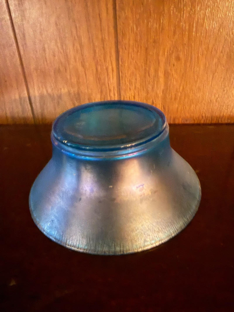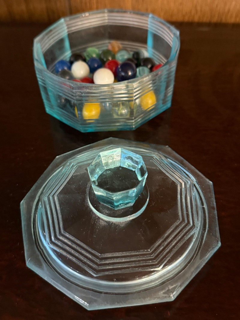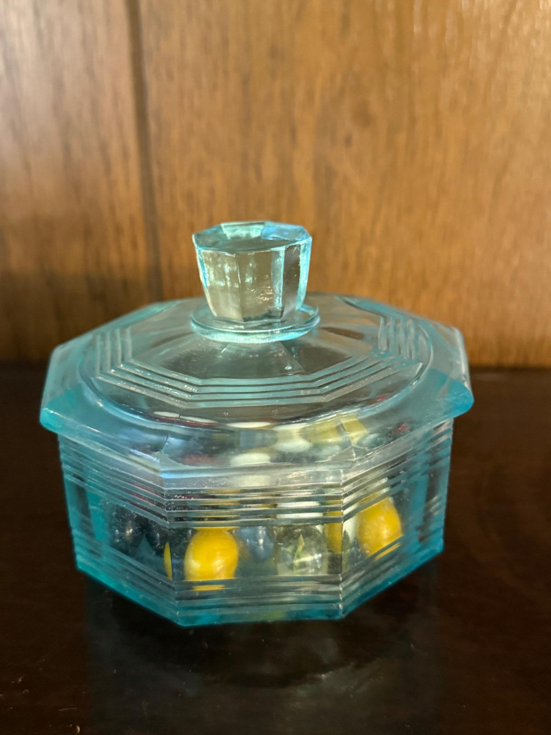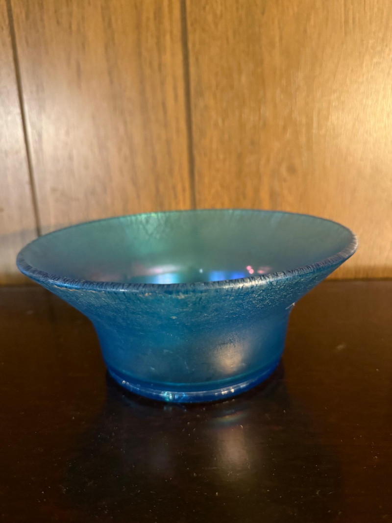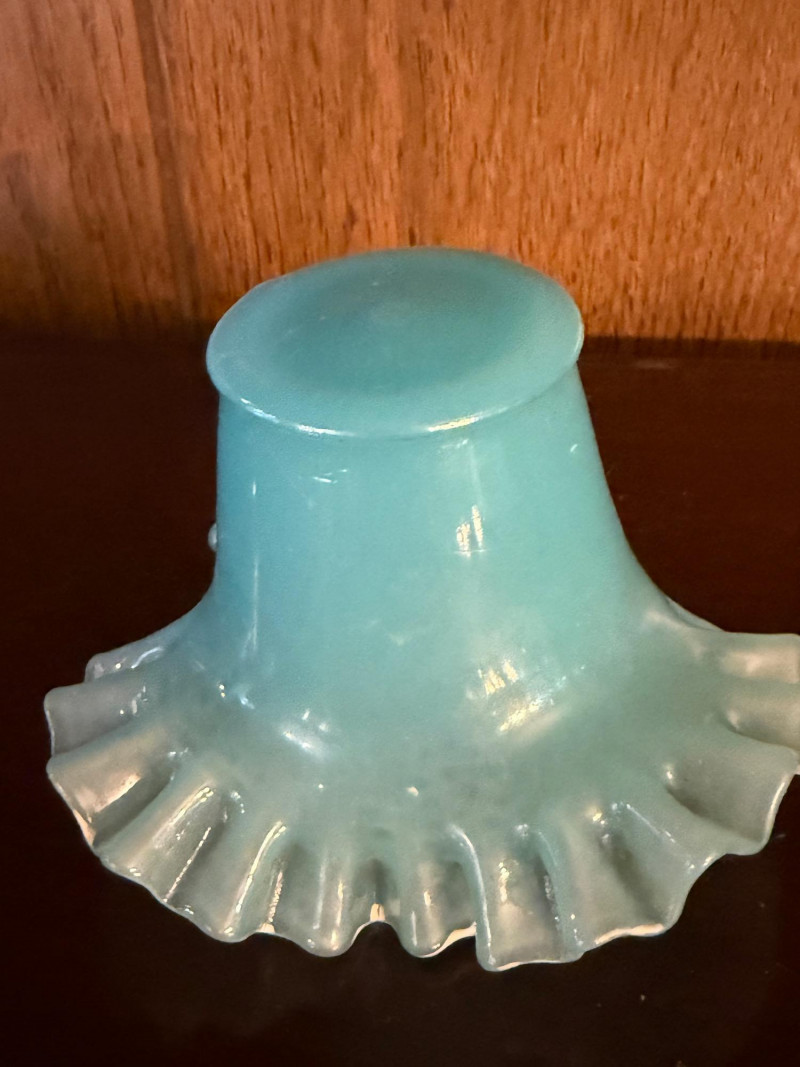 This striking lot showcases a variety of vintage blue glass and pottery tableware, thoughtfully arranged for collectors and resellers. Included are: A Fenton-style hobnail lidded jar A ruffled edge vase, likely mid-century Fenton or similar A pedestal candy dish and goblet A lidded urn and footed bowl A geometric iridescent vase or compote, adding visual contrast and shimmer The collection blends textured hobnail patterns, opalescent finishes, and classic mid-century silhouettes, making it ideal for resale, display, or vintage décor. Each piece reflects the craftsmanship and charm of American glassmaking traditions, with shades ranging from cobalt to colonial blue.