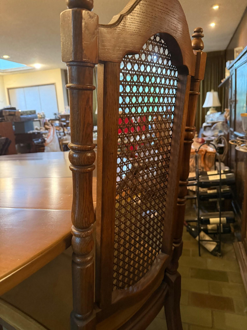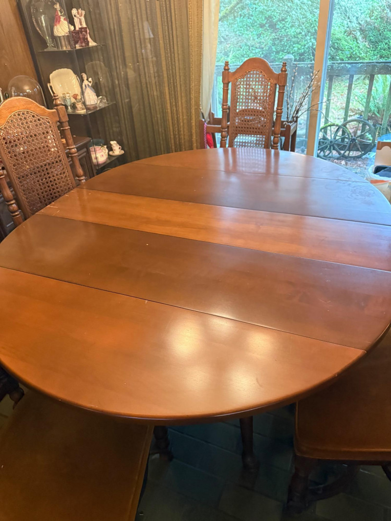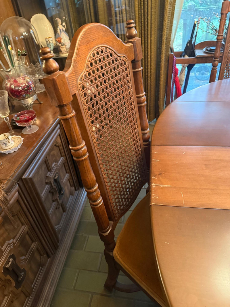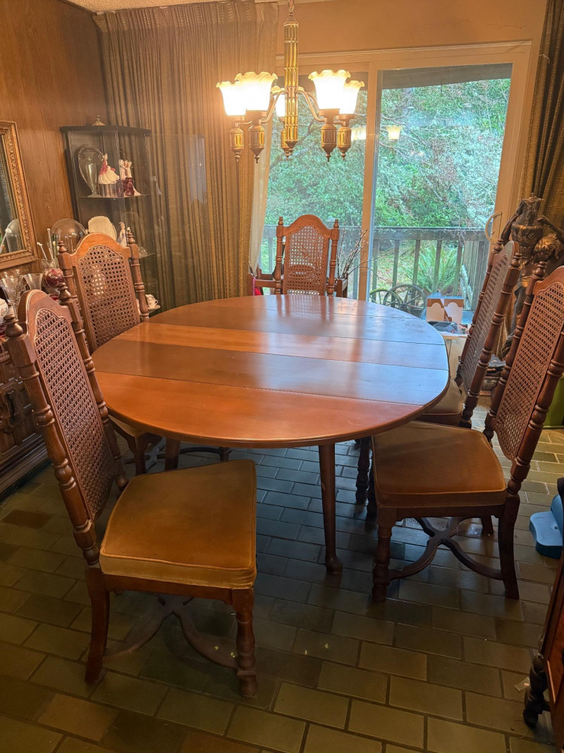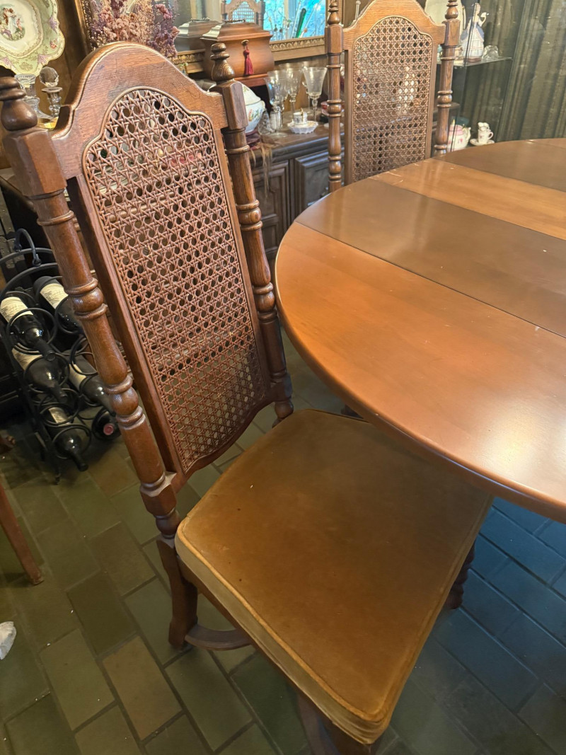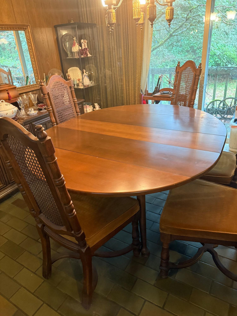 This classic oval wood dining table comes with six matching caneback chairs, each featuring woven backs and padded seats for comfort and style. The table includes a center leaf for expanded seating and fold-down sides for space-saving versatility. Ideal for traditional interiors, vintage-inspired homes, or resale inventory, this set blends timeless craftsmanship with functional design. The warm wood tones and elegant silhouette make it a standout piece for dining rooms or staging environments.