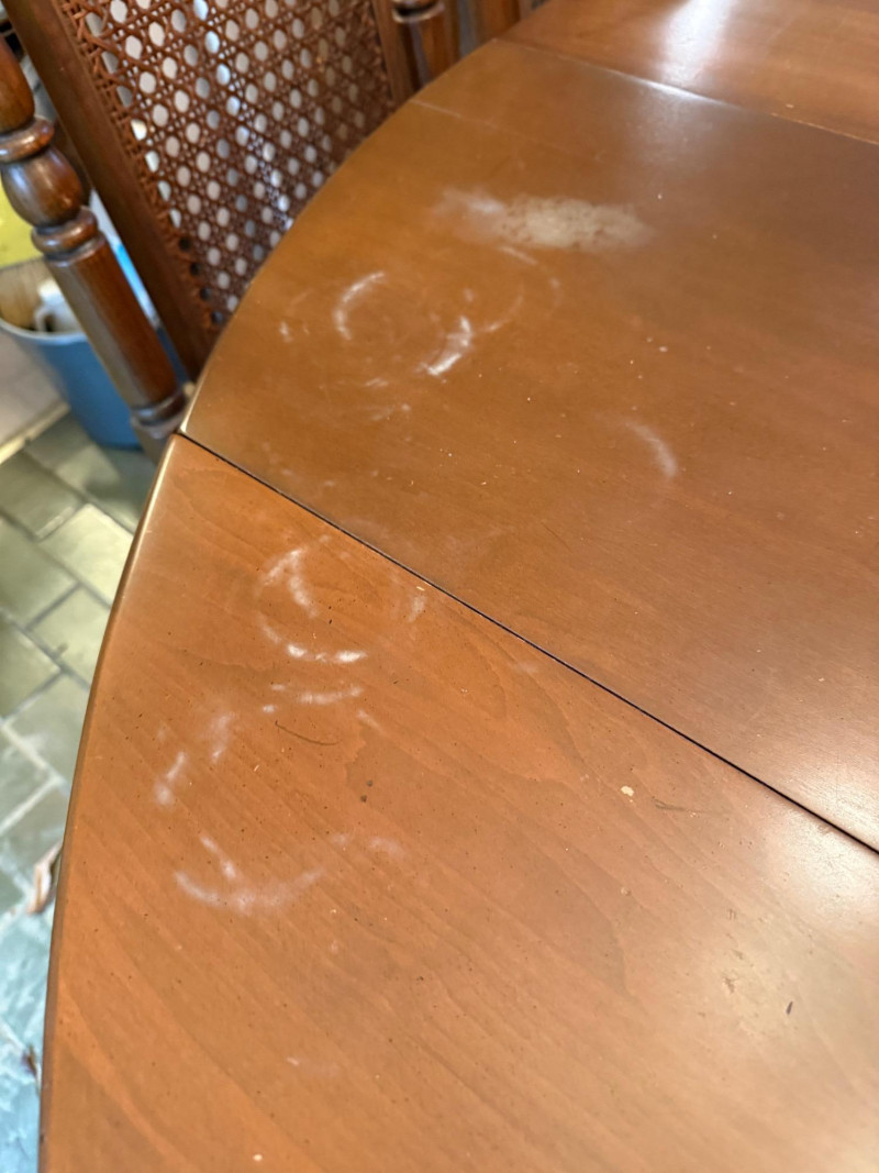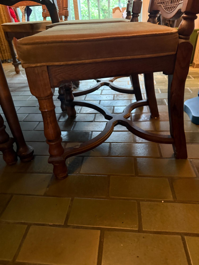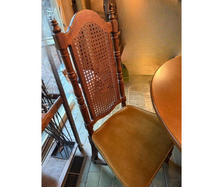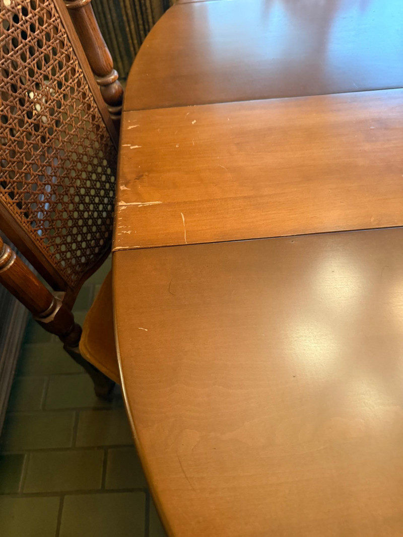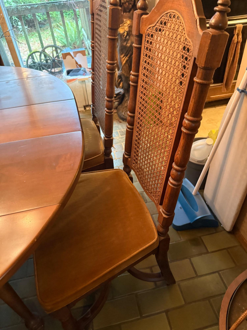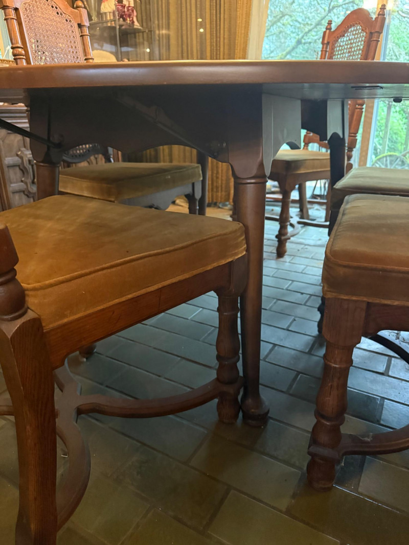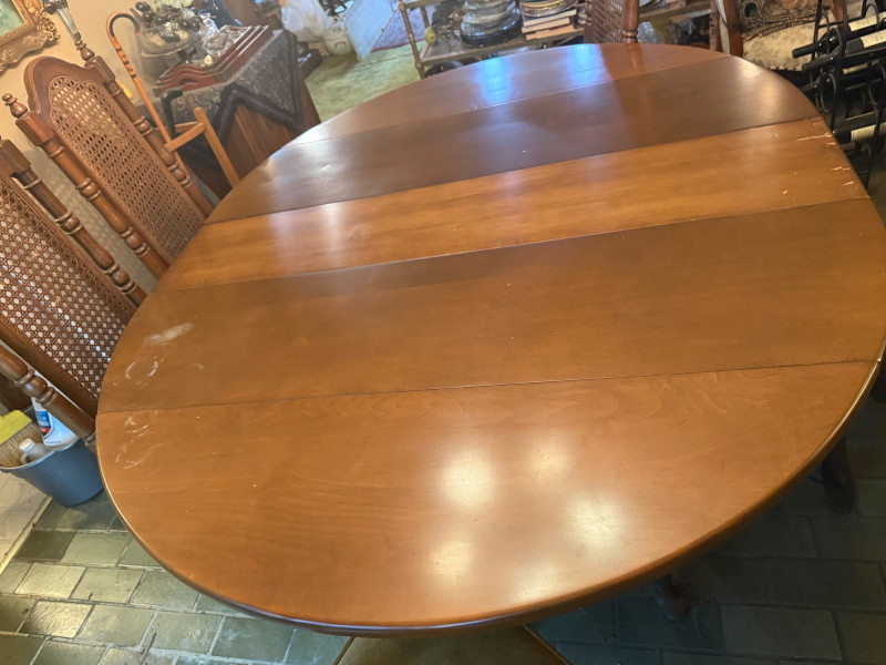 This classic oval wood dining table comes with six matching caneback chairs, each featuring woven backs and padded seats for comfort and style. The table includes a center leaf for expanded seating and fold-down sides for space-saving versatility. Ideal for traditional interiors, vintage-inspired homes, or resale inventory, this set blends timeless craftsmanship with functional design. The warm wood tones and elegant silhouette make it a standout piece for dining rooms or staging environments.