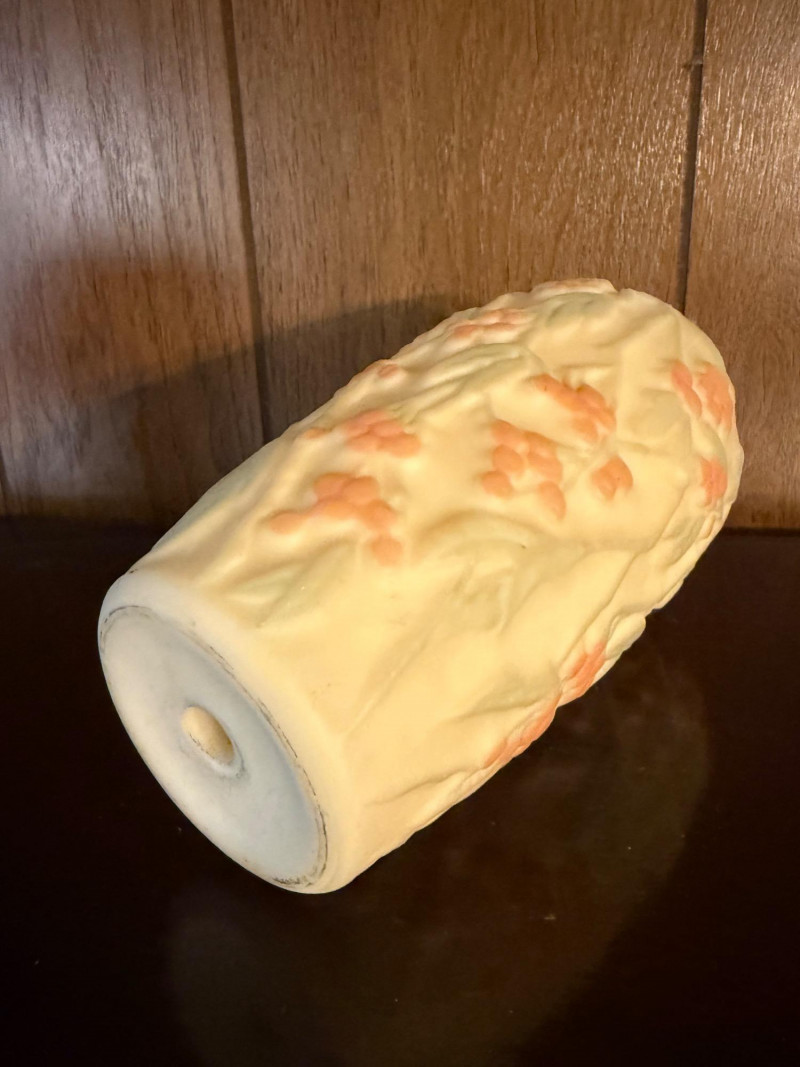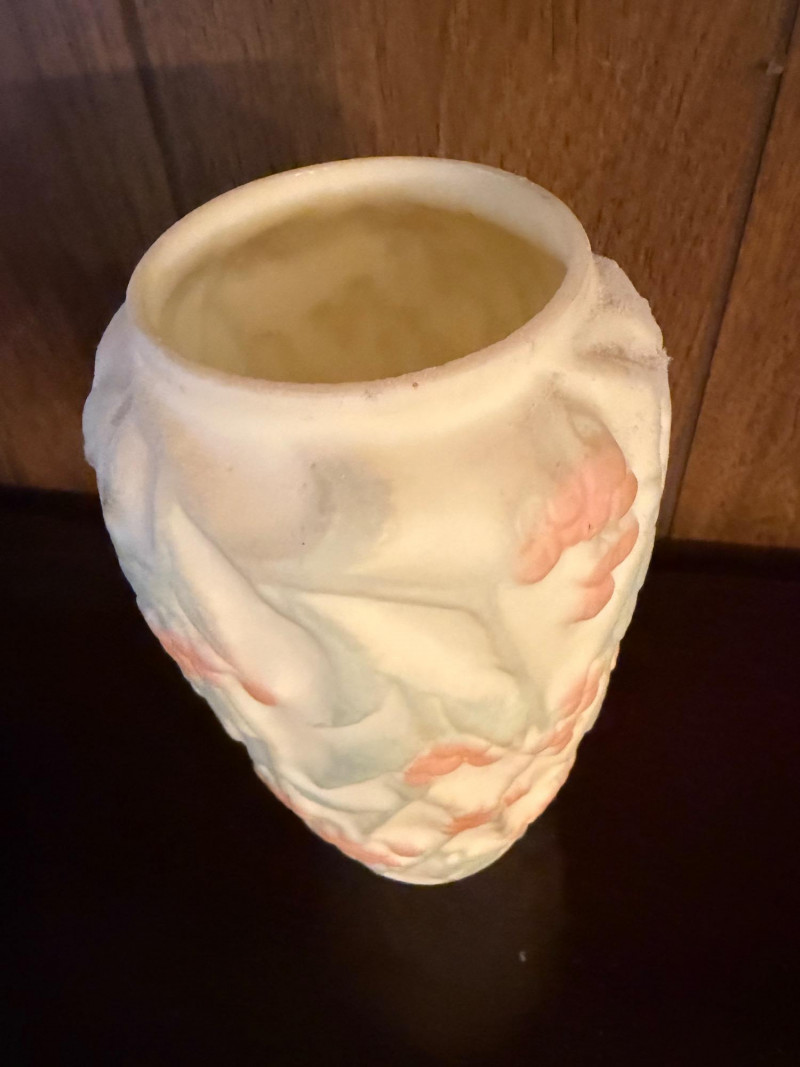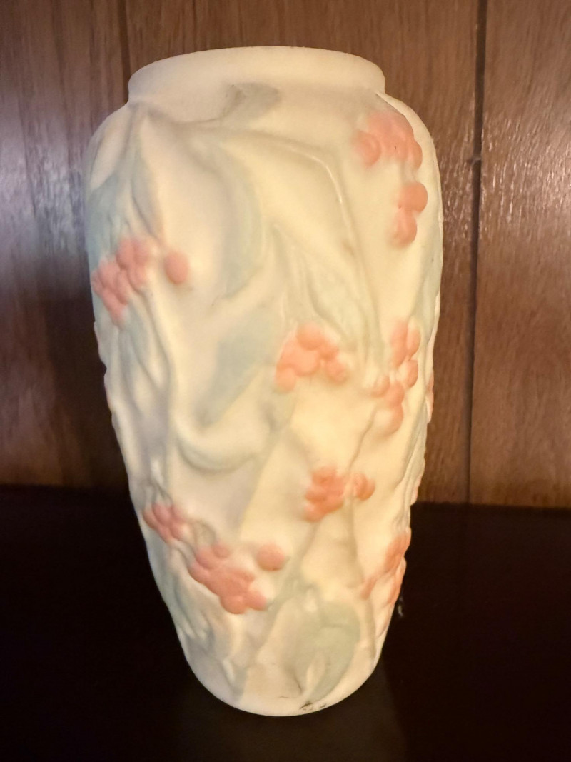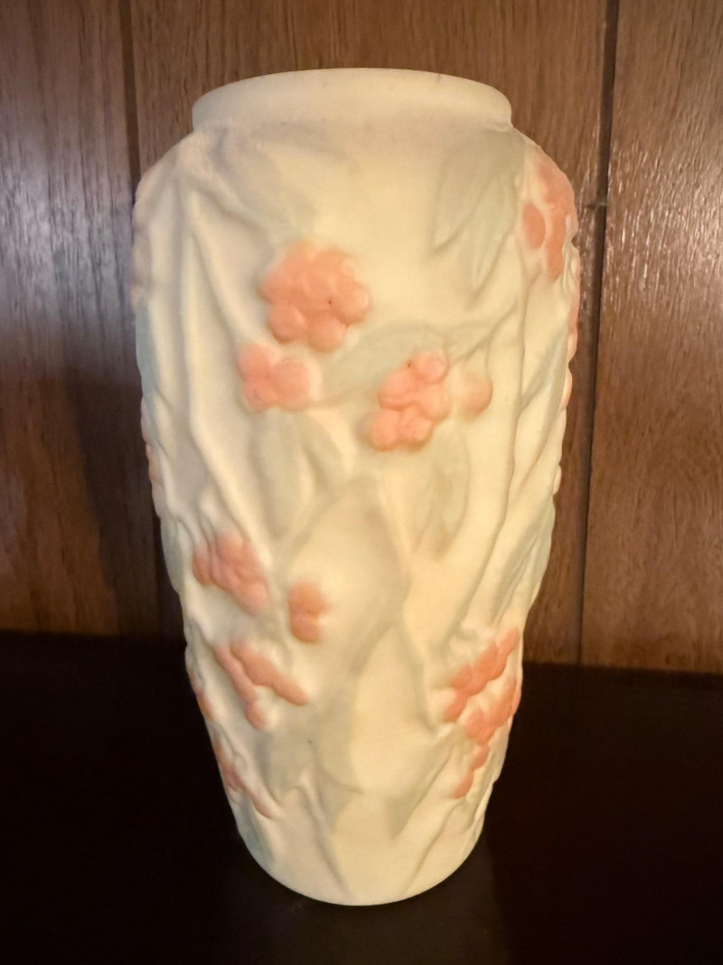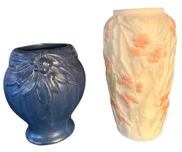 Blue Leaf & Bittersweet Berry Motif + Cream Floral Relief Two decorative vintage ceramic vases, each showcasing unique raised relief detailing: A deep blue rounded vase with a raised leaf and berry motif near the rim—likely mid-century American art pottery, possibly Royal Copley or similar studio ware. A taller cream-colored vase with soft pink raised floral accents, echoing styles seen in California pottery or Art Nouveau revival ceramics. Both pieces exhibit intricate craftsmanship, textured surfaces, and timeless color palettes, making them ideal for resale, display, or vintage décor staging. Their sculptural quality and classic forms appeal to collectors of American pottery and decorative arts.