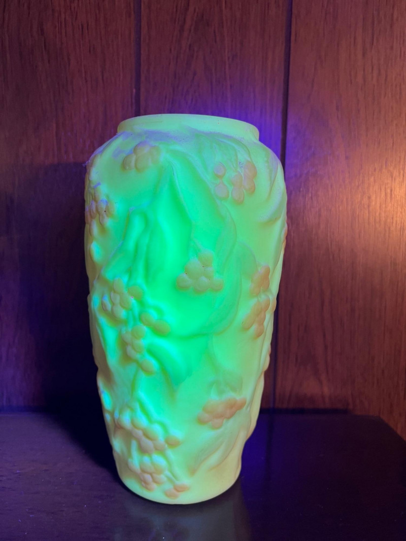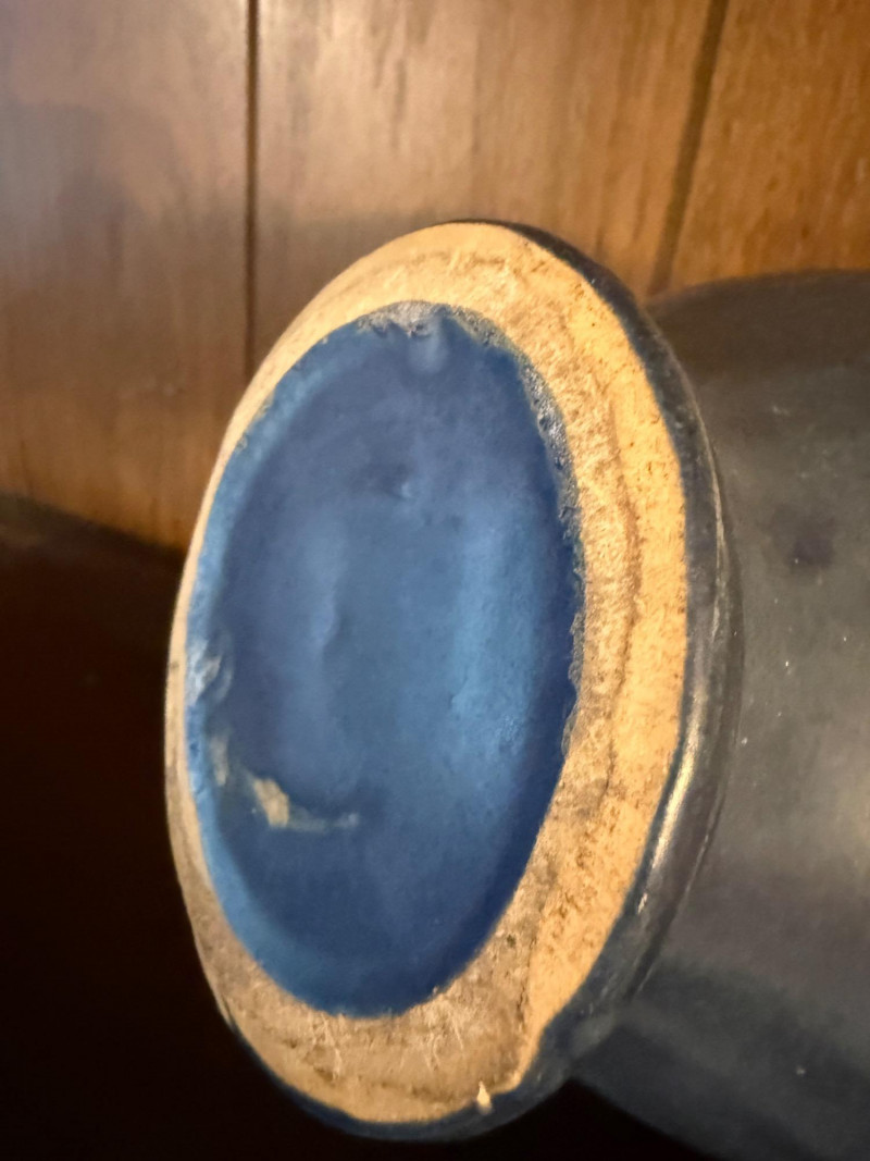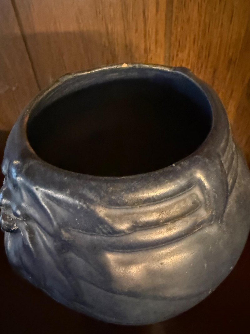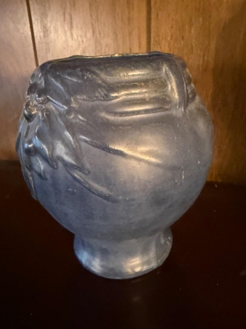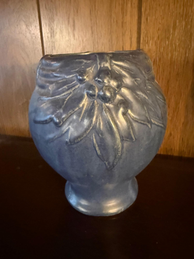 Blue Leaf & Bittersweet Berry Motif + Cream Floral Relief Two decorative vintage ceramic vases, each showcasing unique raised relief detailing: A deep blue rounded vase with a raised leaf and berry motif near the rim—likely mid-century American art pottery, possibly Royal Copley or similar studio ware. A taller cream-colored vase with soft pink raised floral accents, echoing styles seen in California pottery or Art Nouveau revival ceramics. Both pieces exhibit intricate craftsmanship, textured surfaces, and timeless color palettes, making them ideal for resale, display, or vintage décor staging. Their sculptural quality and classic forms appeal to collectors of American pottery and decorative arts.