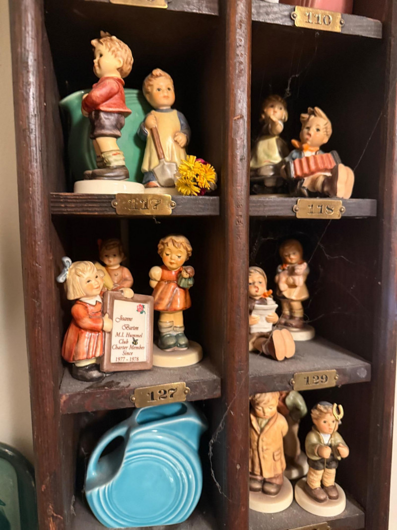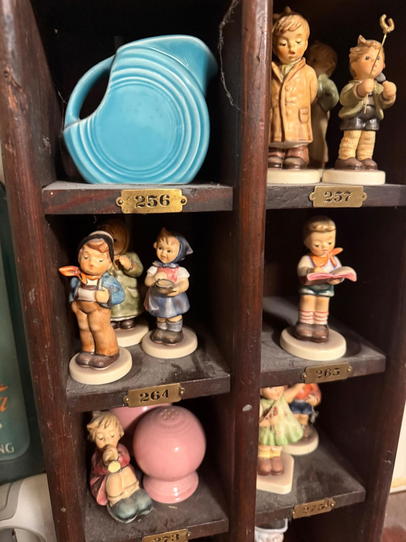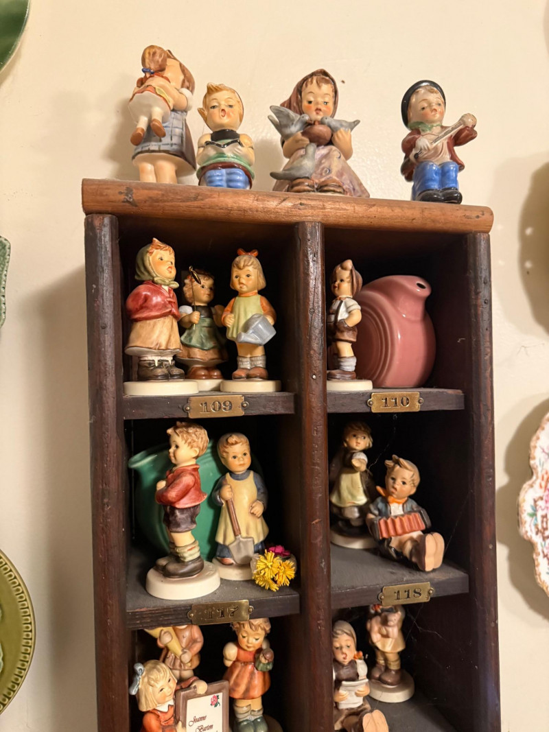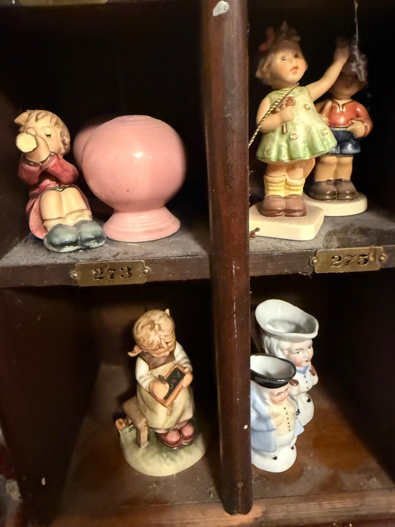 Vintage German Figurines in Functional Display Case A wood wall display cabinet containing a variety of Hummel figurines (3" to 5" tall) and assorted collectibles. The figurines are classic hand-painted German pieces, known for their nostalgic depictions of children and pastoral life. The cabinet provides functional storage and presentation, making this lot suitable for collectors, resellers, or anyone seeking to add vintage charm to their décor.